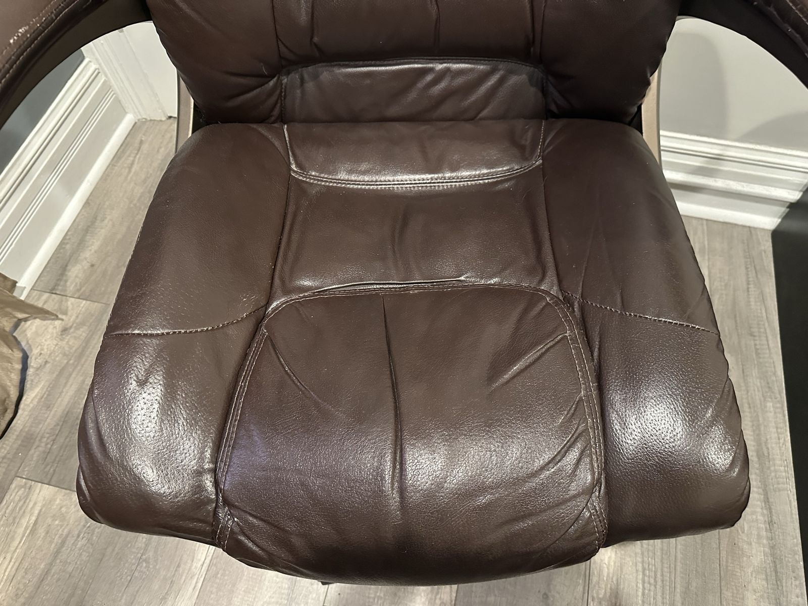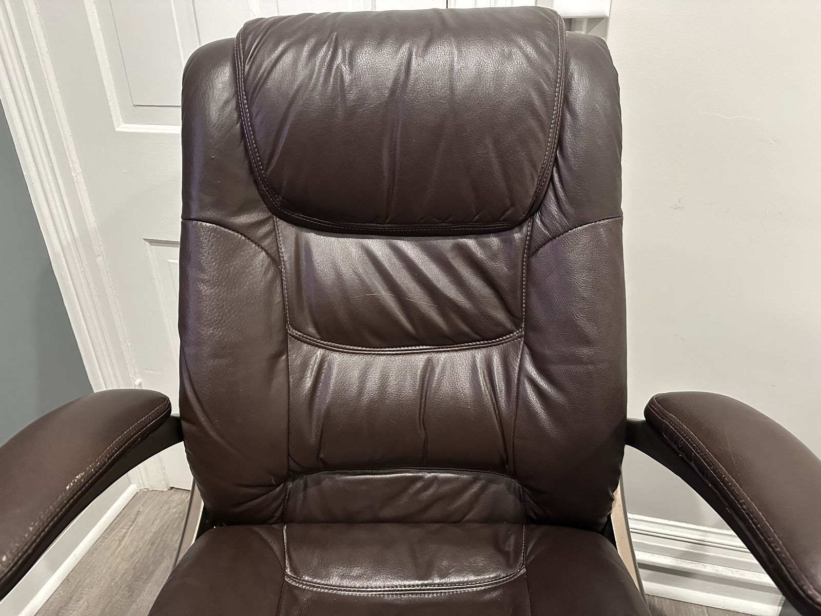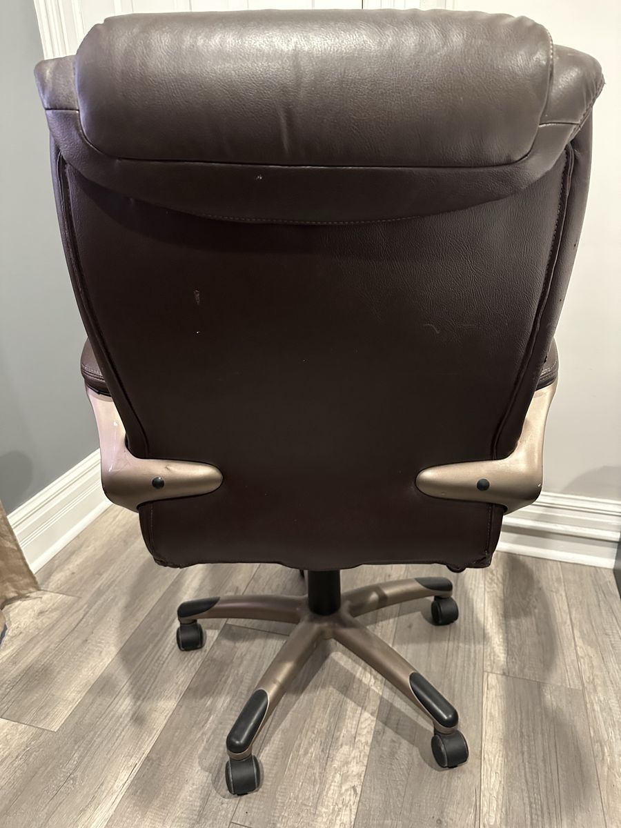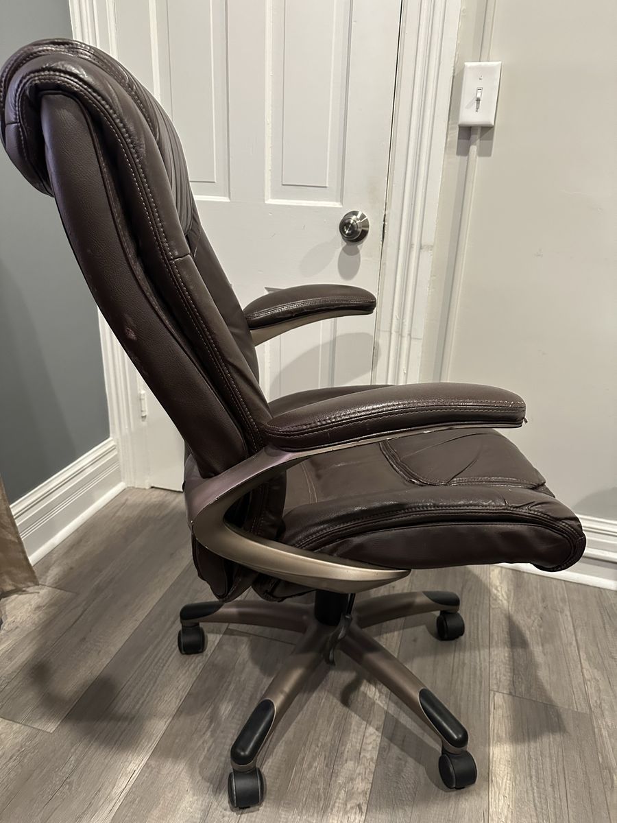 Condition: Fair, representative of daily usage. Hydraulic still very responsive and holds its position. Have had for over 15 years, and padding still has plenty of life. Shows visible wear towards the front of the seat, some scuffs on sides and back of armrests, and bonded leather on side of armrests beginning to crack. Could easily last the next decade plus. Comes from a clean, smoke-free home.