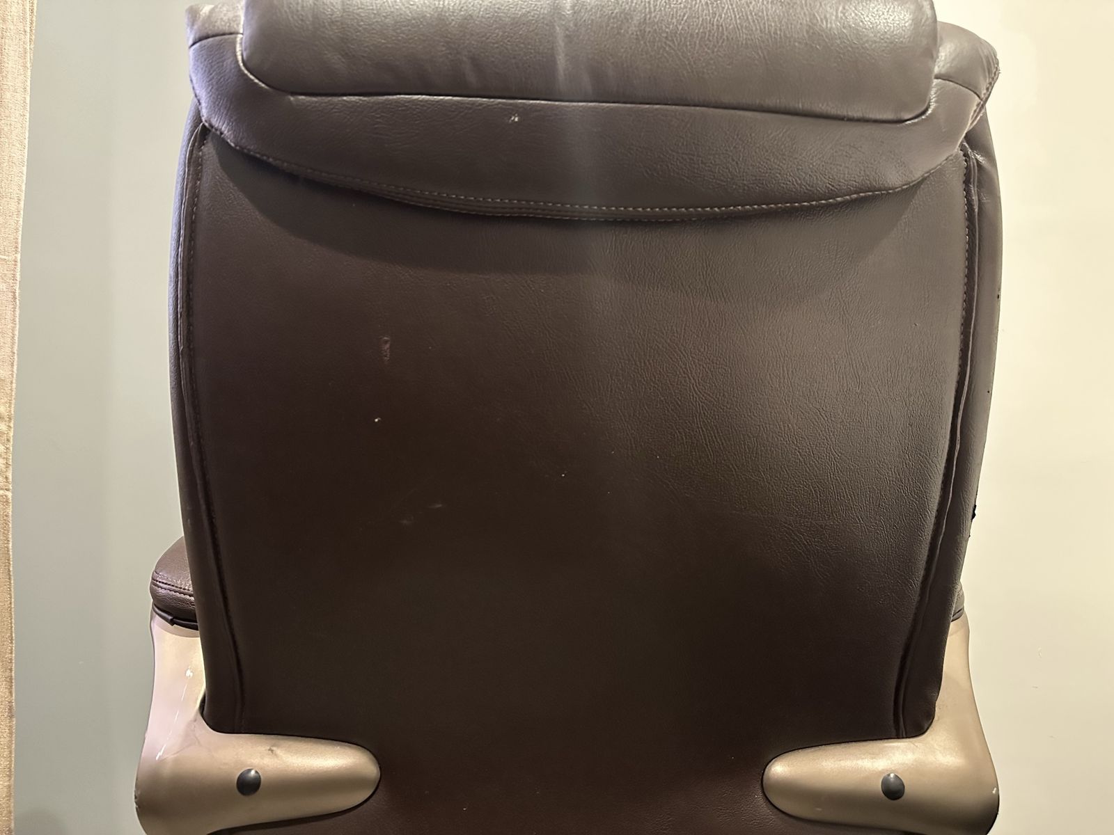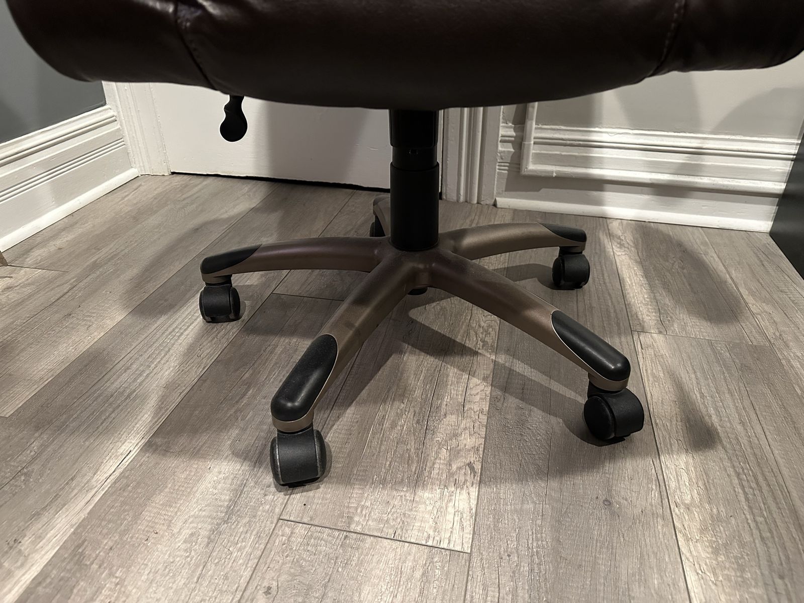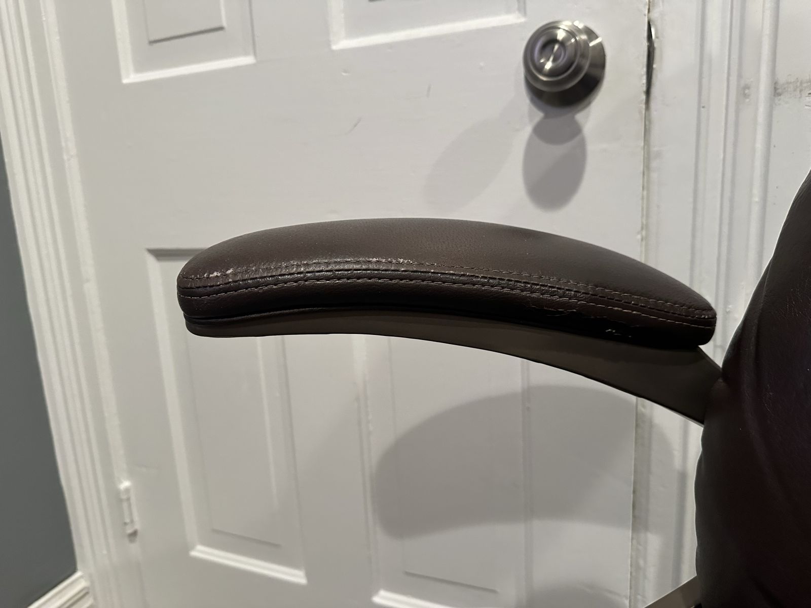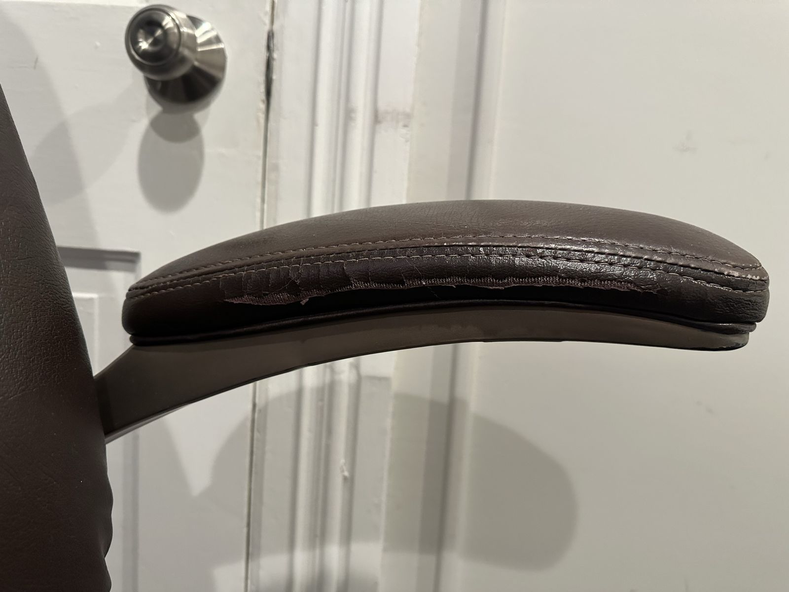 Condition: Fair, representative of daily usage. Hydraulic still very responsive and holds its position. Have had for over 15 years, and padding still has plenty of life. Shows visible wear towards the front of the seat, some scuffs on sides and back of armrests, and bonded leather on side of armrests beginning to crack. Could easily last the next decade plus. Comes from a clean, smoke-free home.