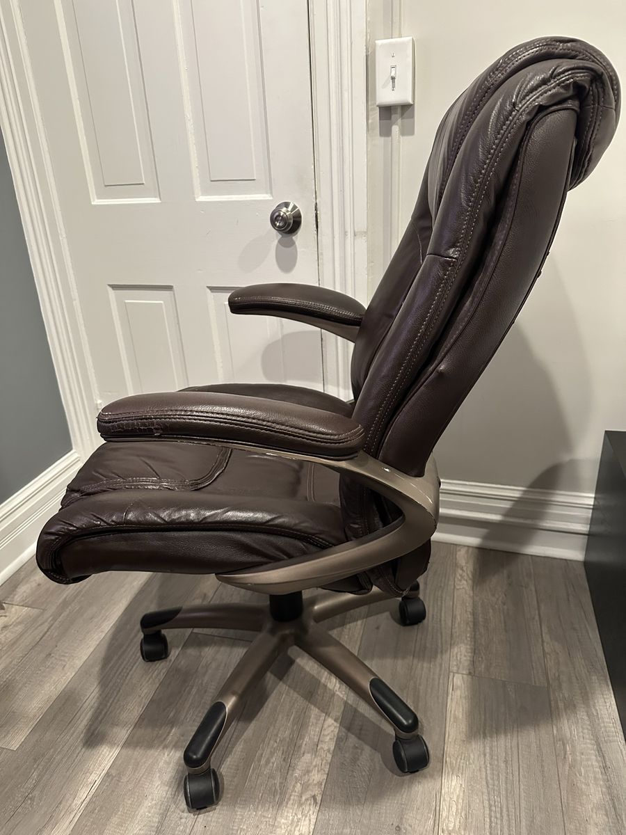 Features: • Soft bonded leather upholstery (dark brown) • High back with built-in lumbar support • Adjustable height • Tilt/recline function • Rolling base with casters • Padded armrests