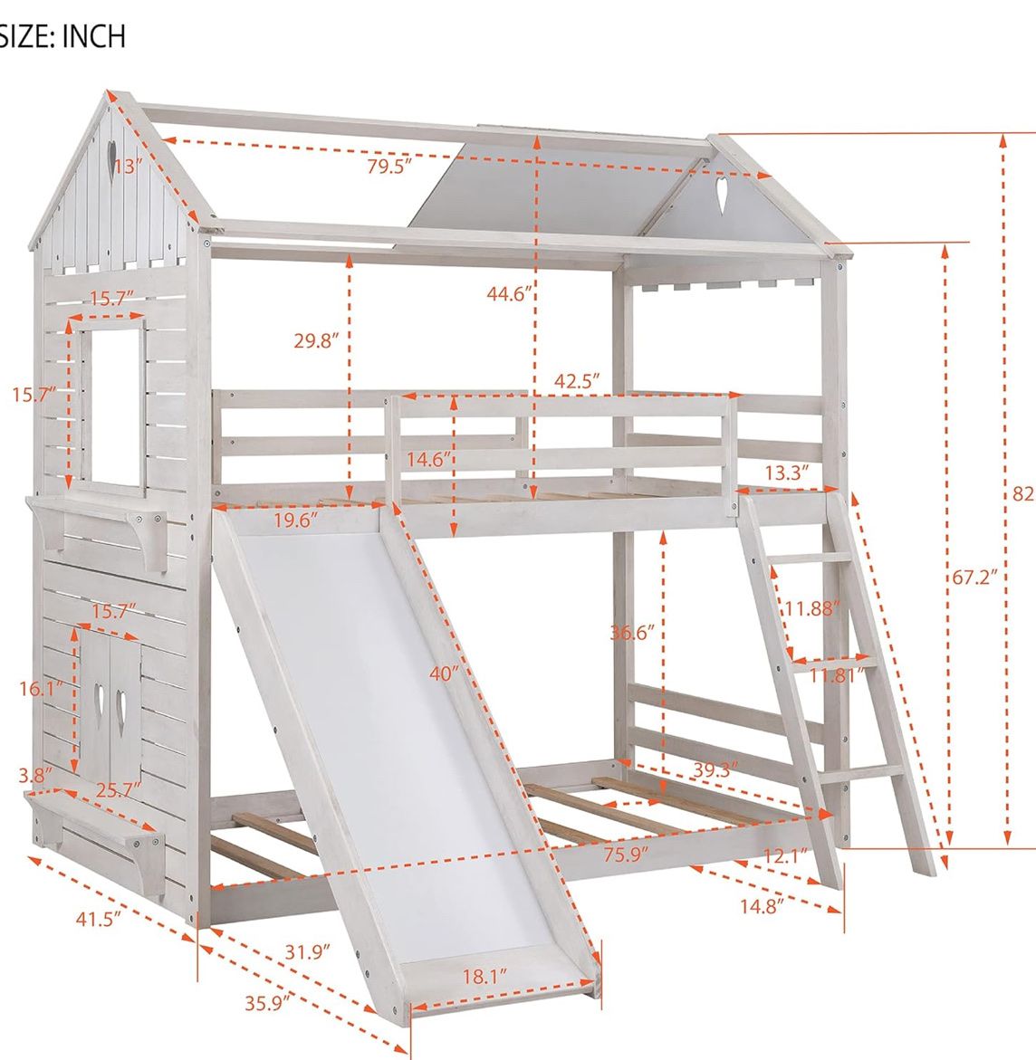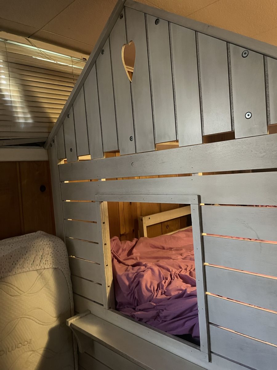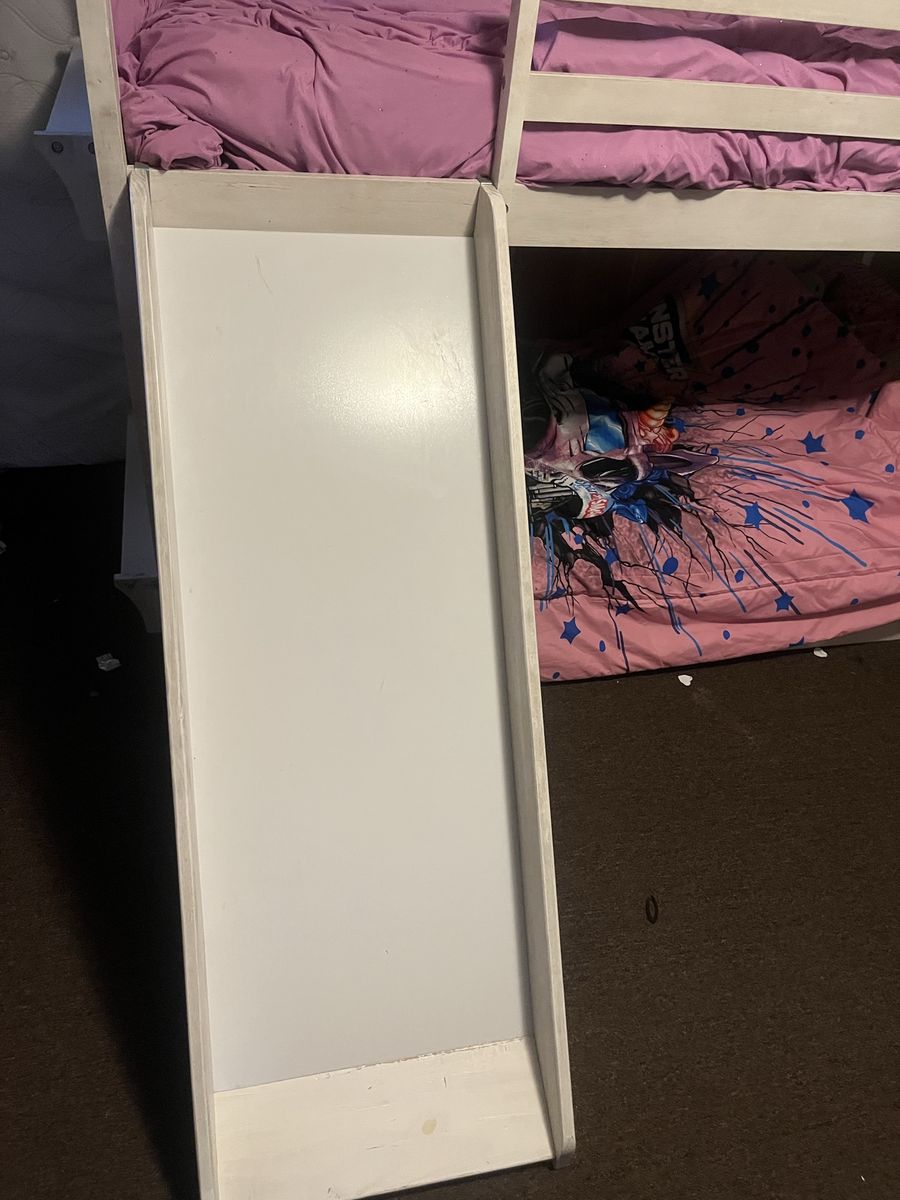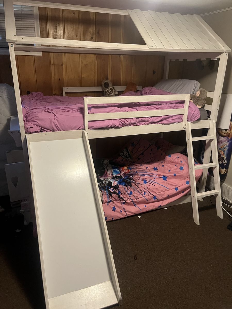 PayPalHarper & Bright Designs House Bunk Beds with Slide, Twin over Twin Bunk Beds with Roof, Fun house-style bunk bed for kids. Has a cool slide and a ladder. Fits two twin mattresses. Overall dimensions are about 82 inches tall, 79.5 inches long, and 80 inches wide (with the slide). Sturdy frame. It is in great shape and our kids have loved it.