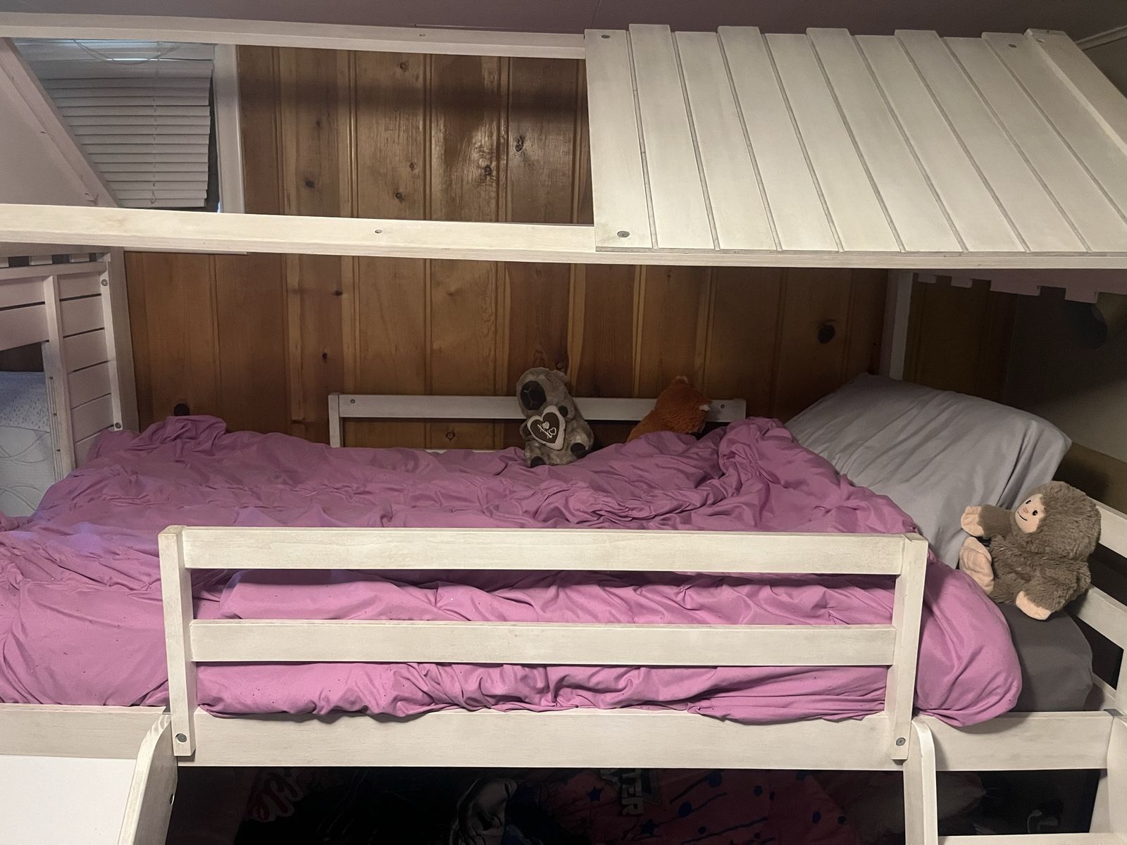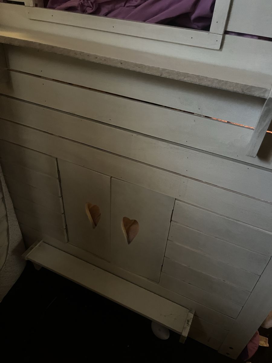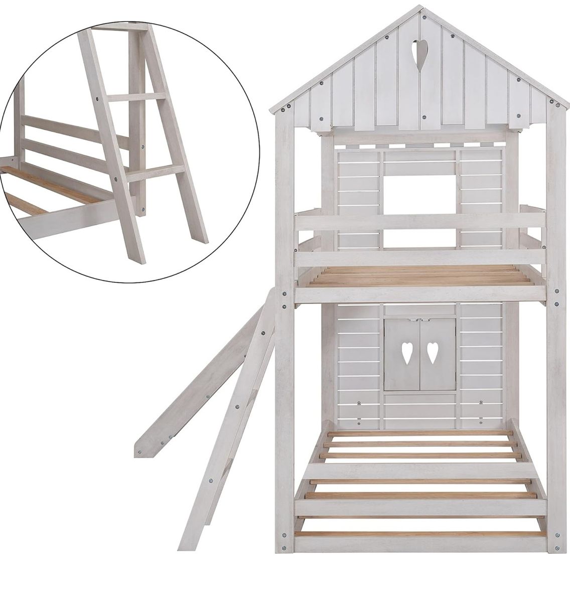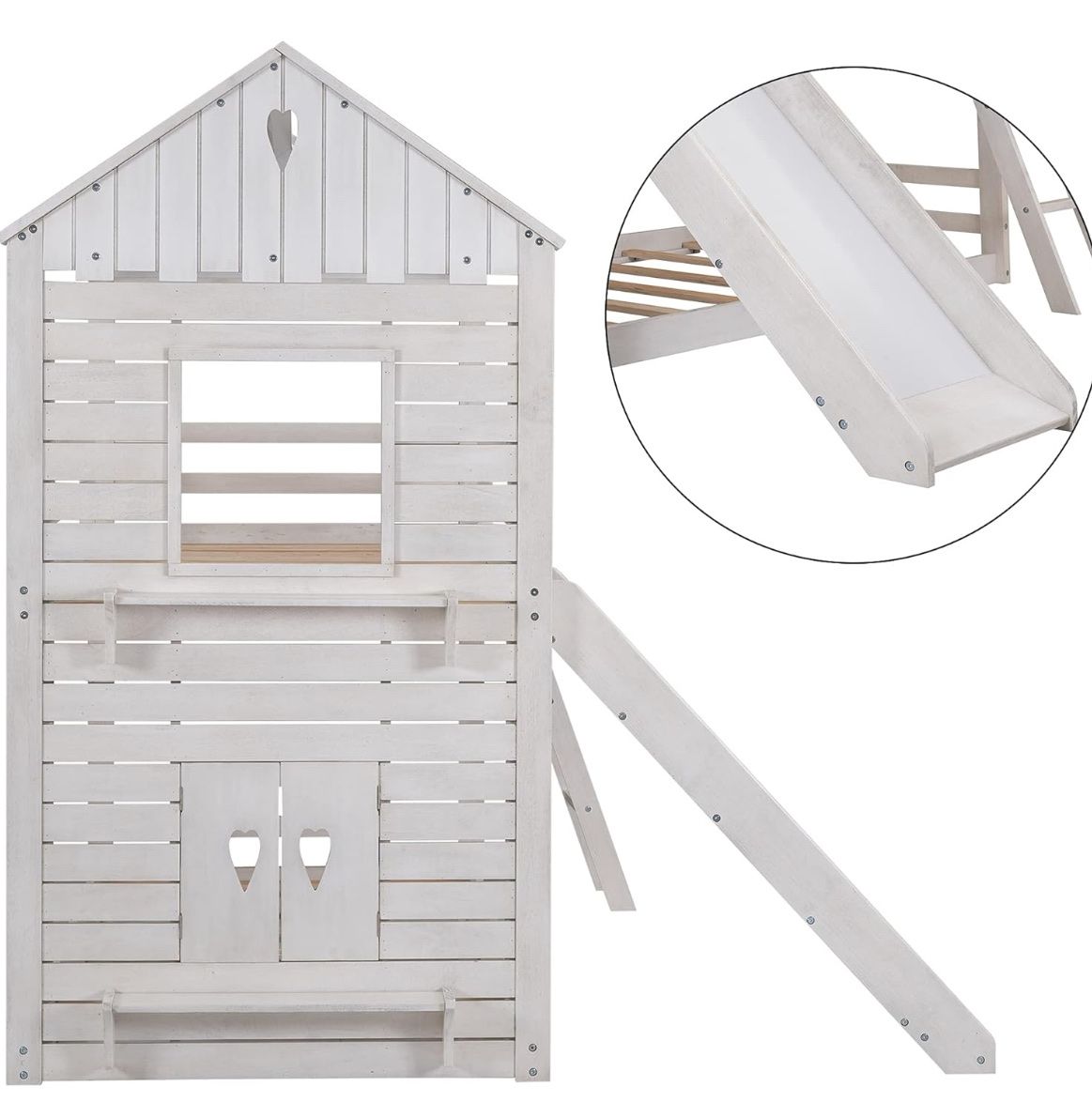 PayPalHarper & Bright Designs House Bunk Beds with Slide, Twin over Twin Bunk Beds with Roof, Fun house-style bunk bed for kids. Has a cool slide and a ladder. Fits two twin mattresses. Overall dimensions are about 82 inches tall, 79.5 inches long, and 80 inches wide (with the slide). Sturdy frame. It is in great shape and our kids have loved it.