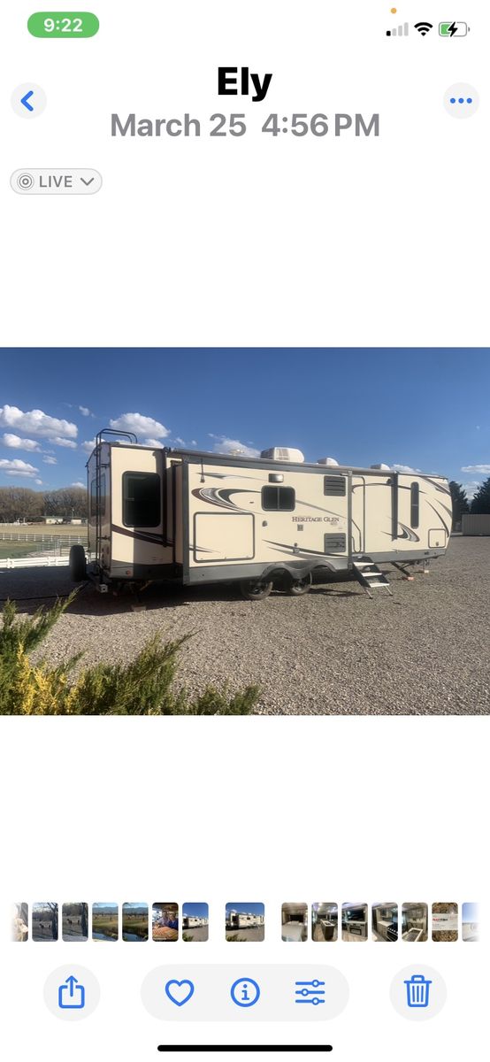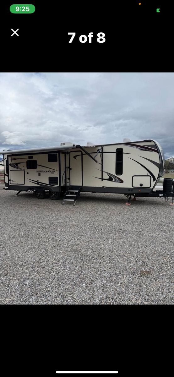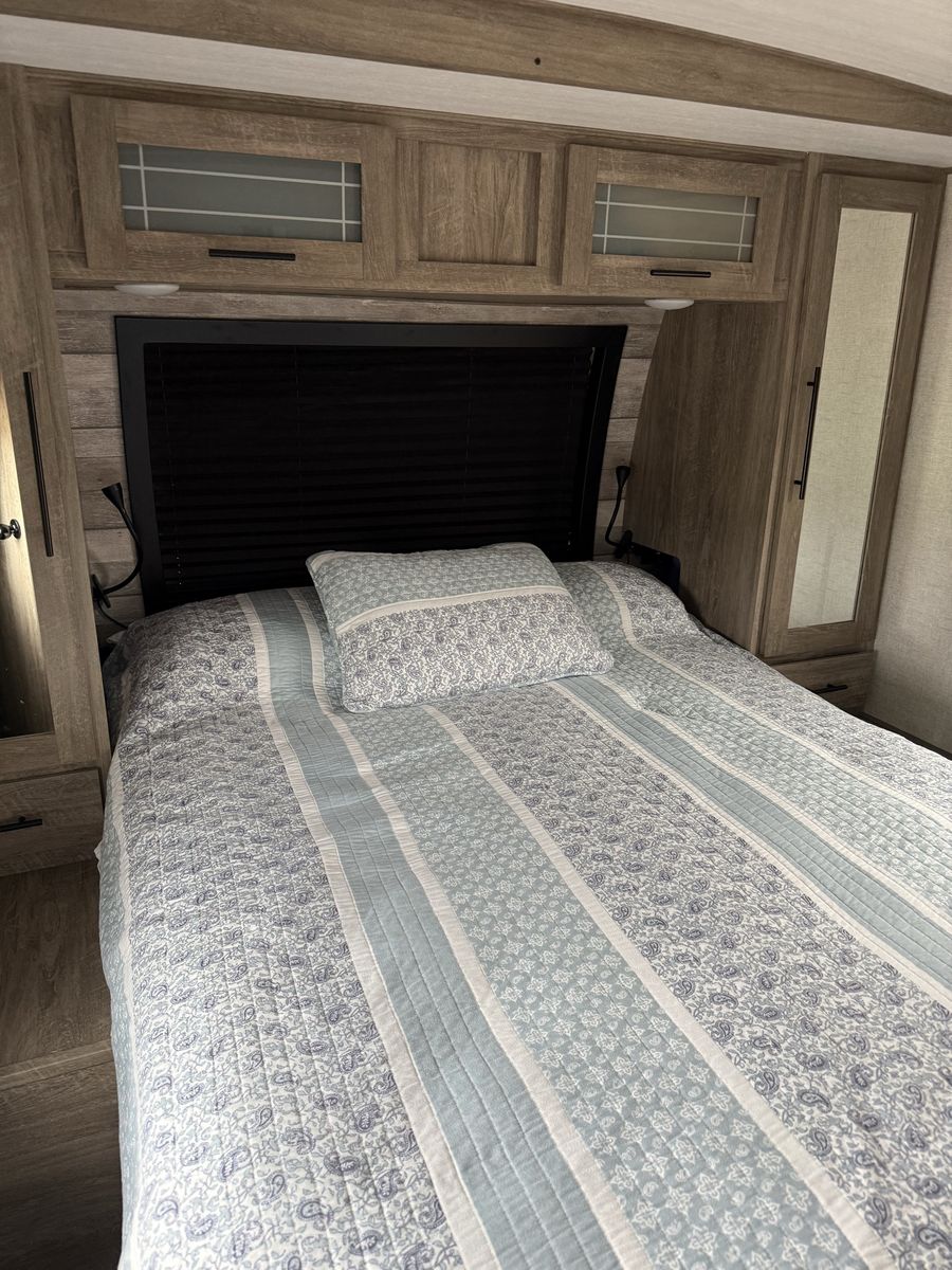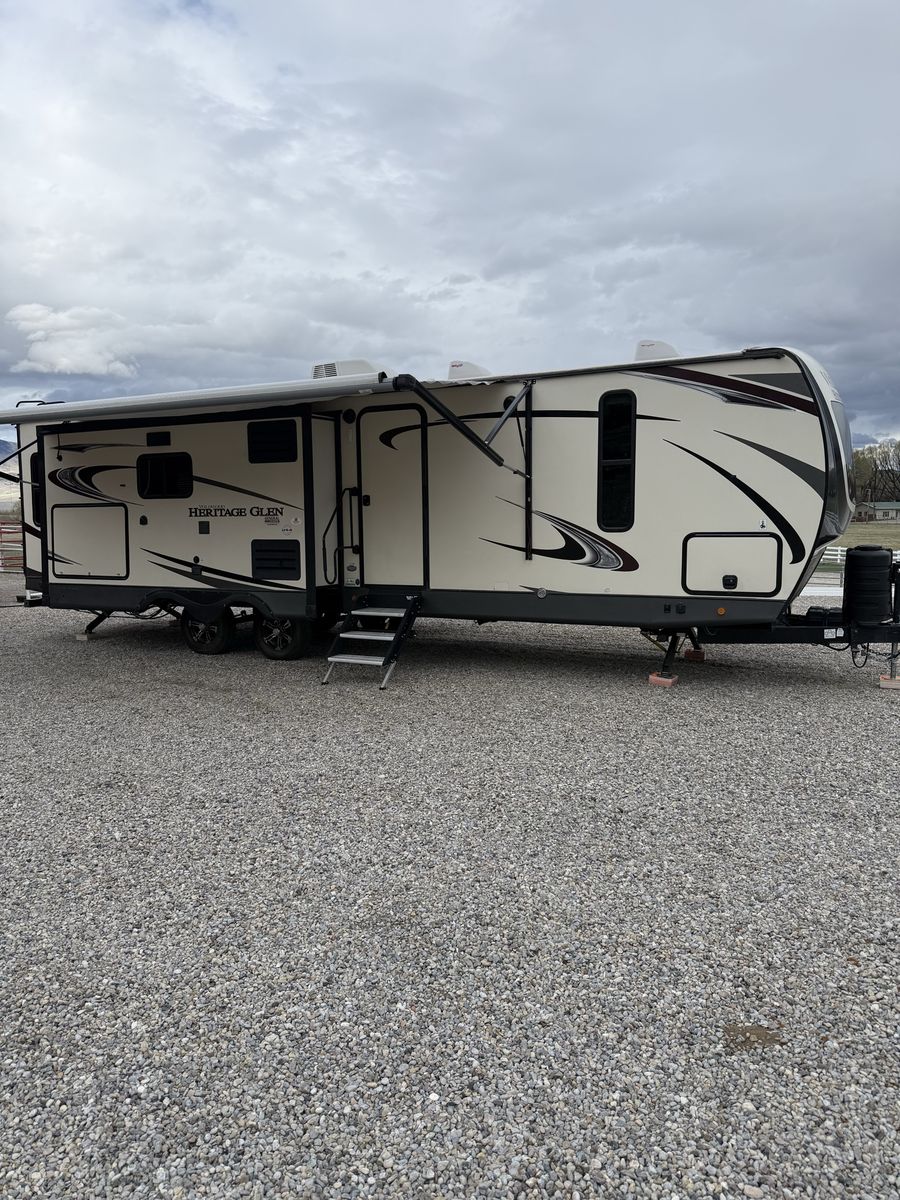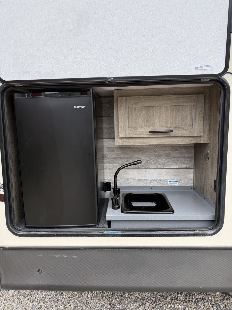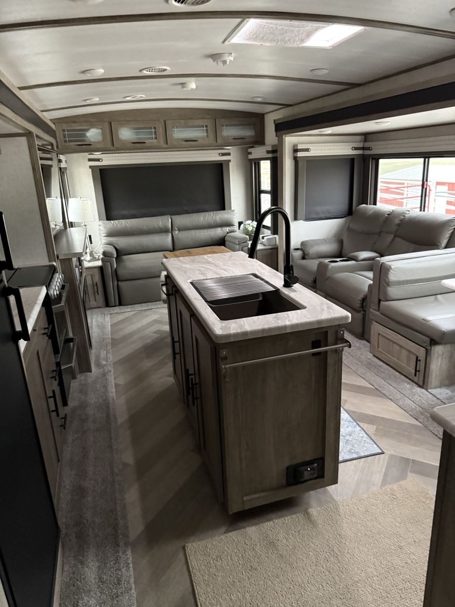 Excellent condition! 32 ft - 1 bed 1 bath sleeps 6 comfortably. Beautiful kitchen with Dometic Refrigerator and Furion Range. 50 in flatscreen above fireplace (electric). Outdoor kitchen with sink, refrigerator and bbq. A lot of extras, too many to list. All ready your next adventure!