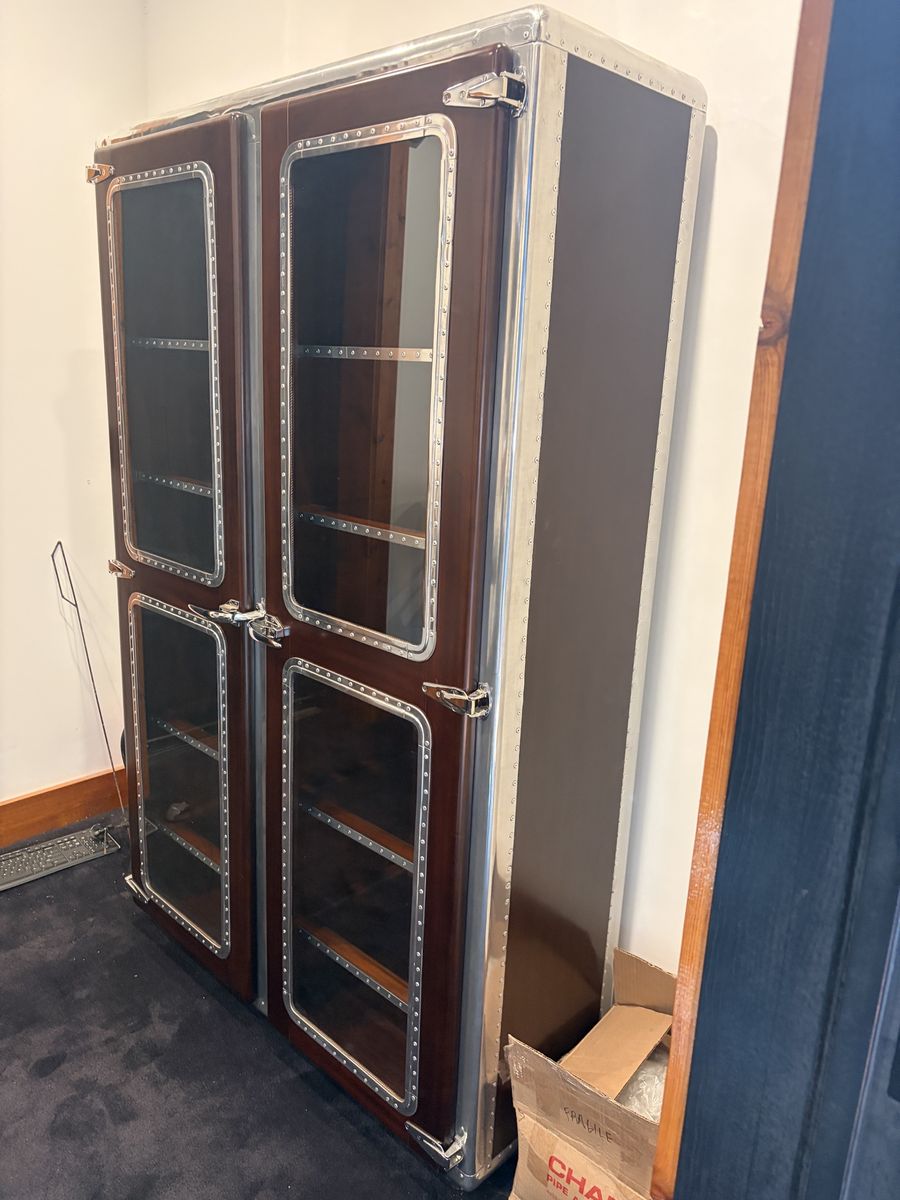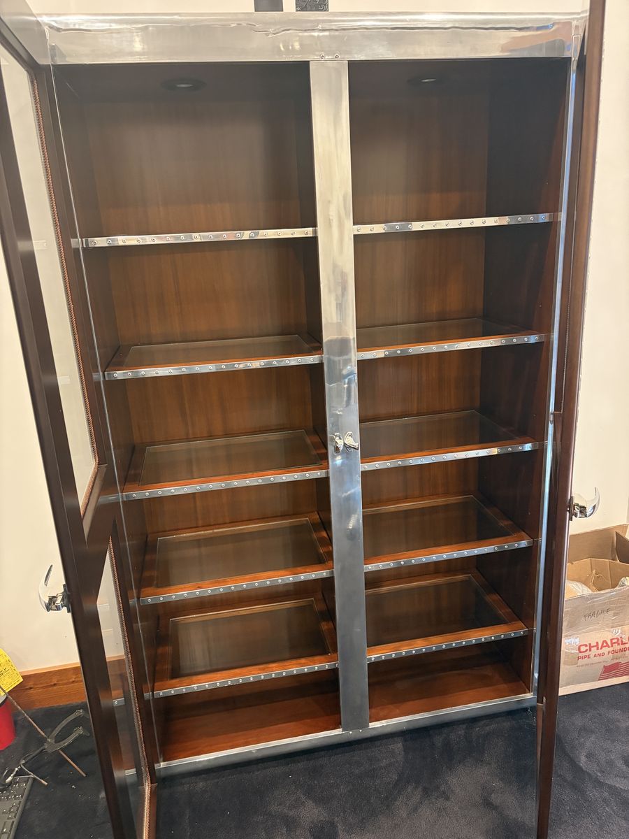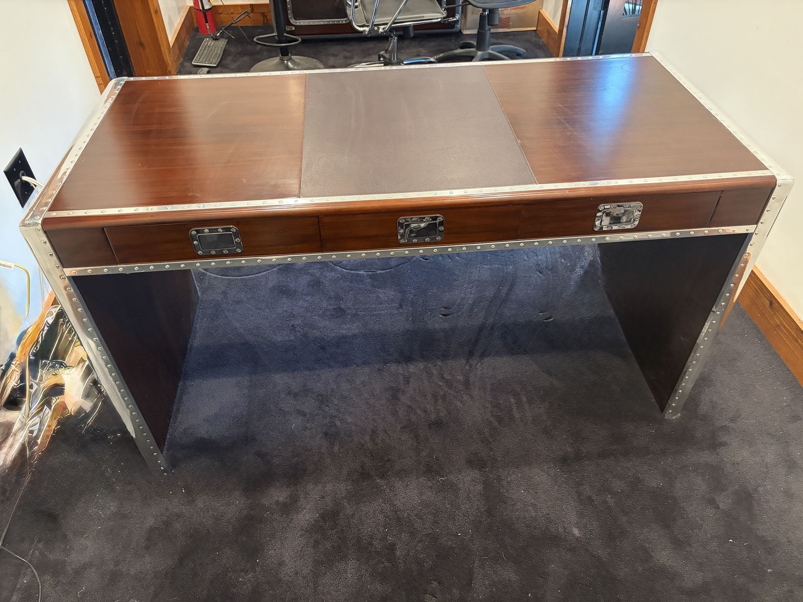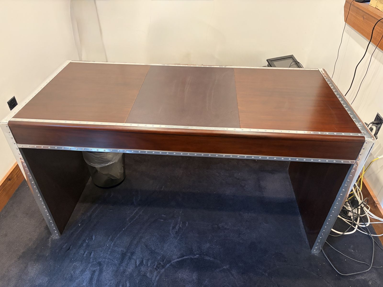 VenmoUnique set made of cherry wood and riveted aluminum. We’ve been unable to find another set like it. Well built, Glass shelves and lighting in the cabinet. Lighting may need new builds, won’t turn on. 3 drawer desk with minimum use. Measurements, Cabinet: 47Wx17Dx75T Desk: 60Lx27.5Dx31T Cash only, must pick up both pieces Make an offer