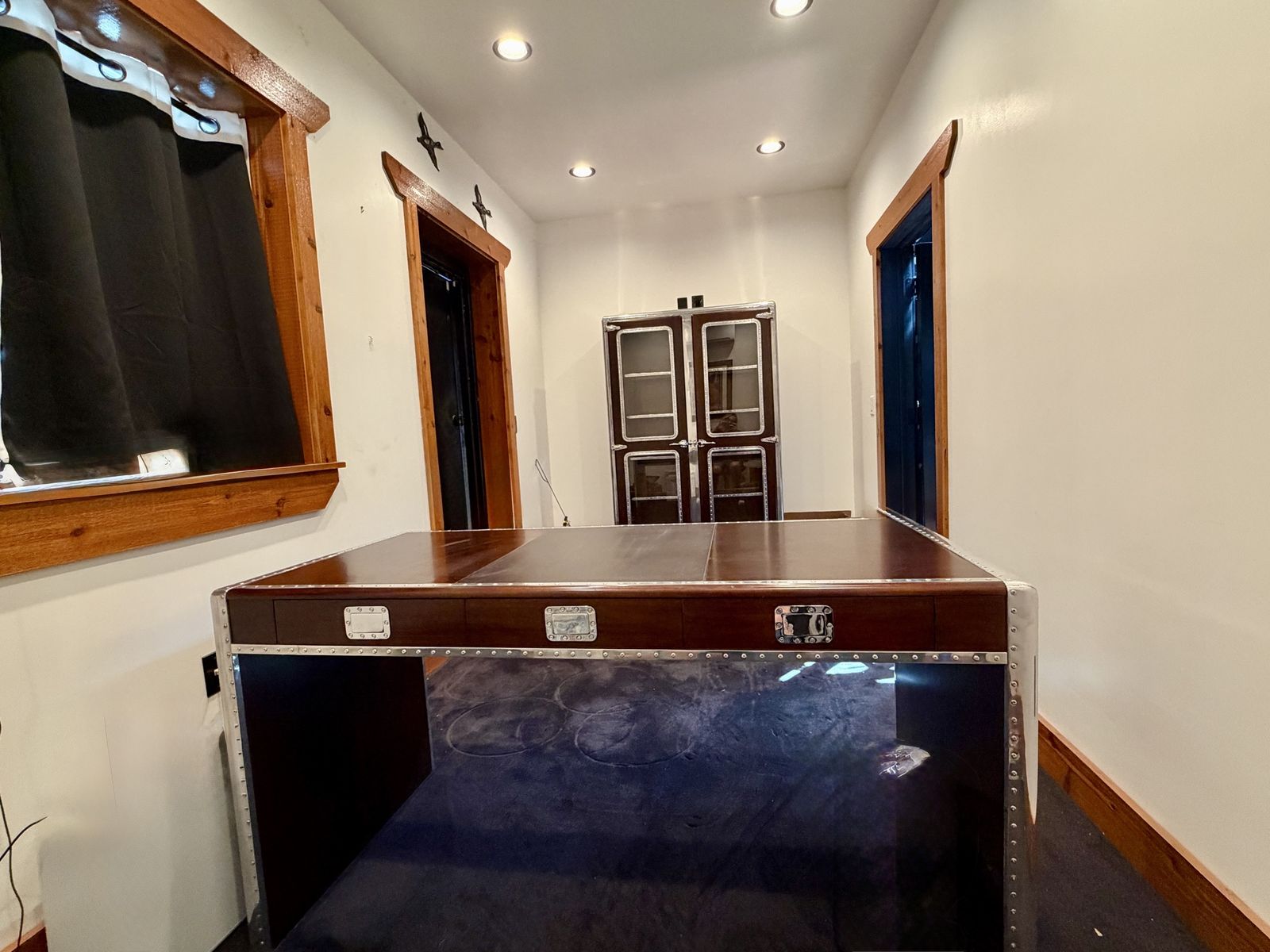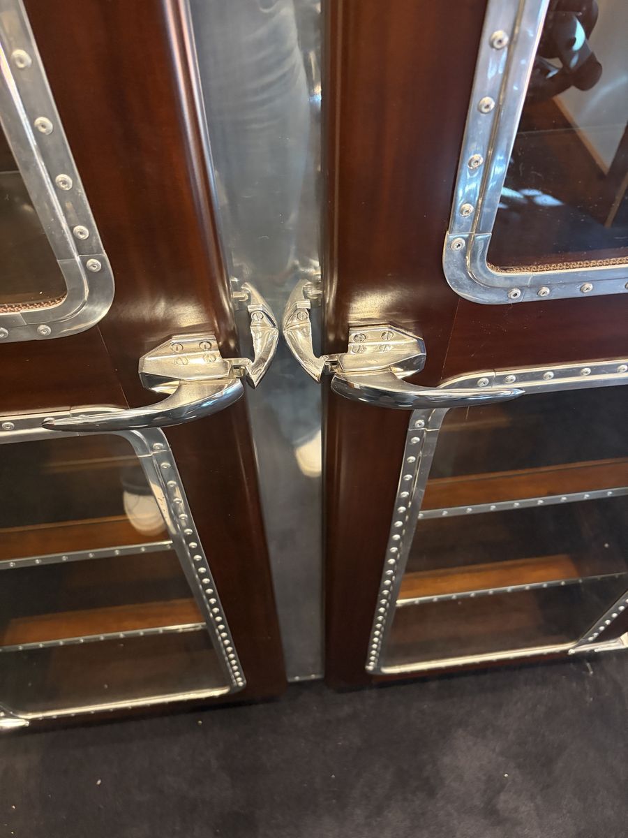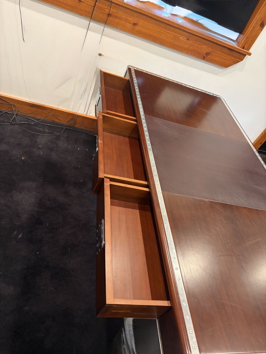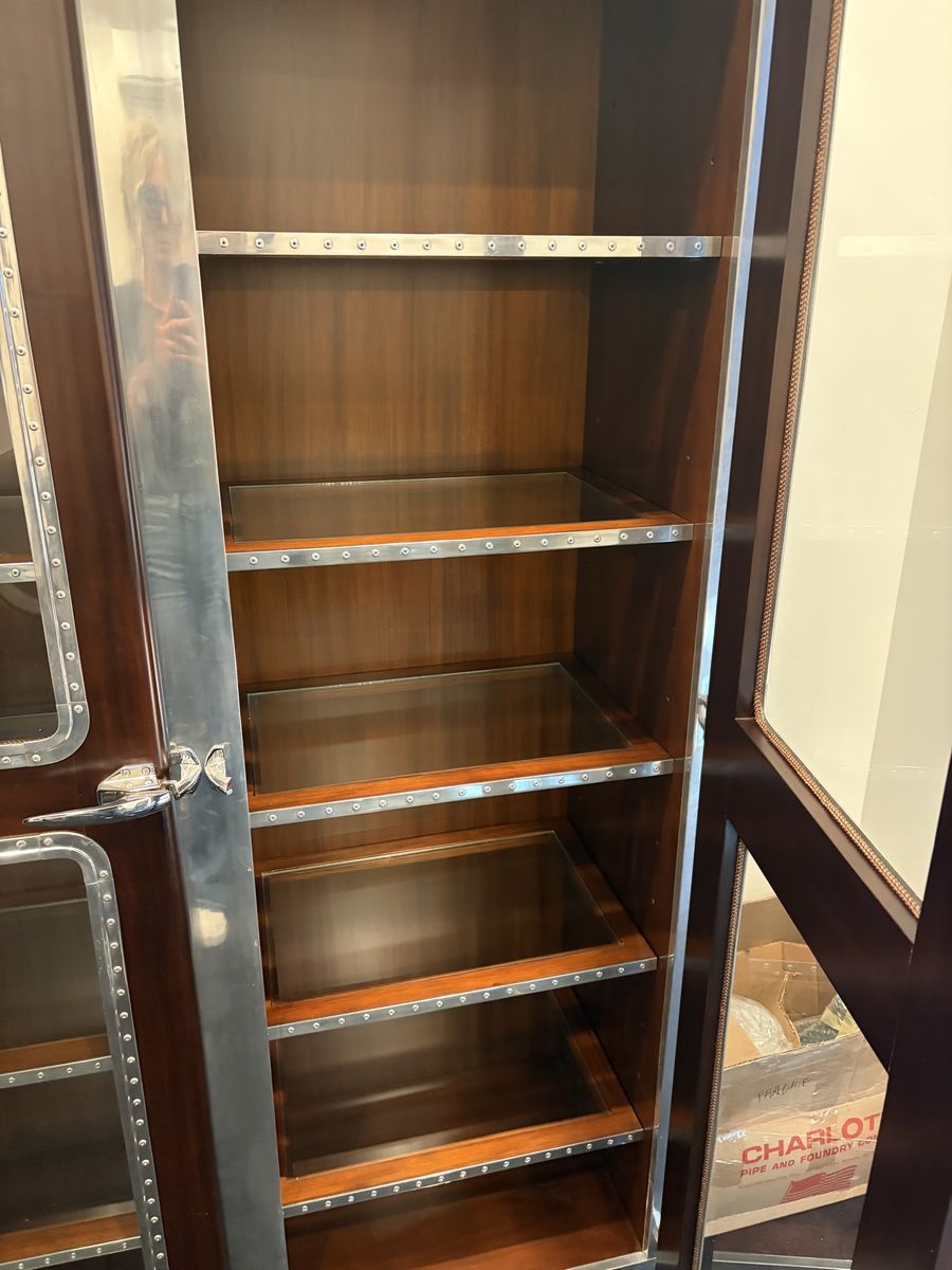 VenmoUnique set made of cherry wood and riveted aluminum. We’ve been unable to find another set like it. Well built, Glass shelves and lighting in the cabinet. Lighting may need new builds, won’t turn on. 3 drawer desk with minimum use. Measurements, Cabinet: 47Wx17Dx75T Desk: 60Lx27.5Dx31T Cash only, must pick up both pieces Make an offer