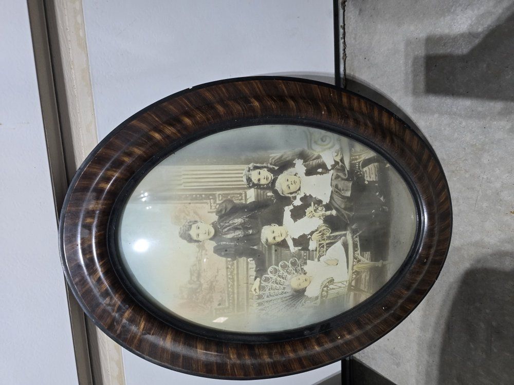 Antique bubble glass wooden frame Victorian/Edwardian family portrait. Date range: 1880 - 1910 Size: 25in by 18.5in Photo is faded. Thanks!