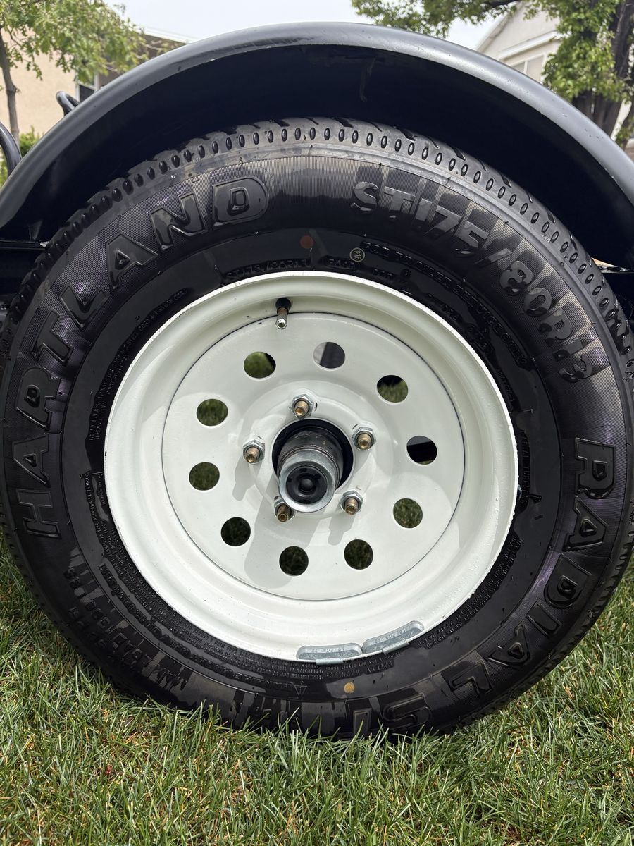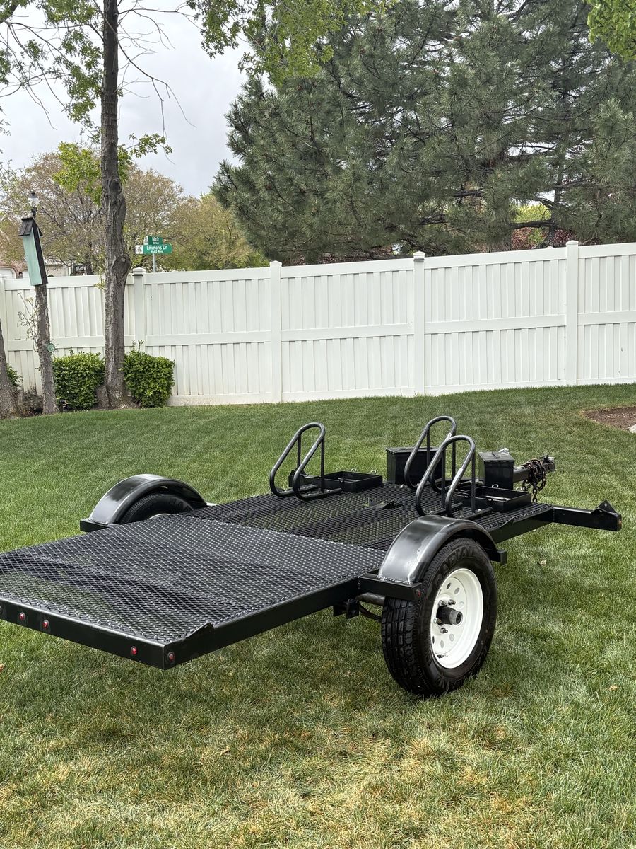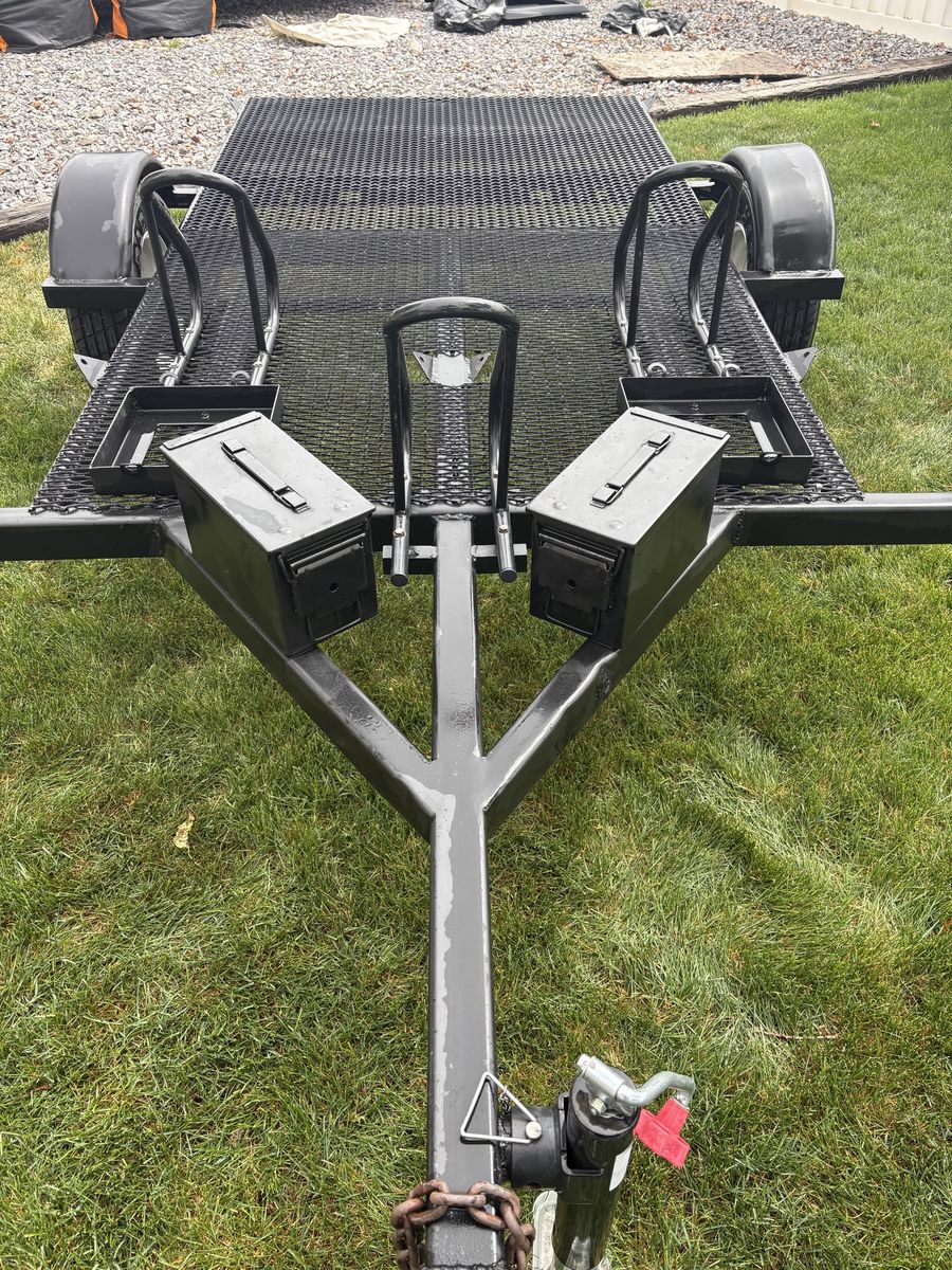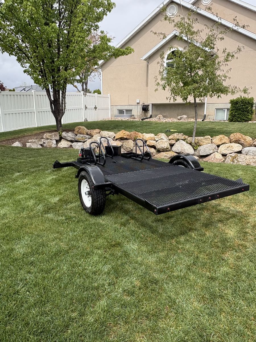 Three place dirt bike trailer. Very easy to handle very well balanced loaded. New over sized tires with spare, st175/80R13. Deck measures 96” long x 53” wide. Front strap measures 77” wide and tongue is 50” long. Front chocks are removable to use as flatbed. Two storage cans and two 5 gallon jug mounts. We built this to haul behind my toy-hauler. We don’t use it anymore. Asking $2000 obo. Text is best.