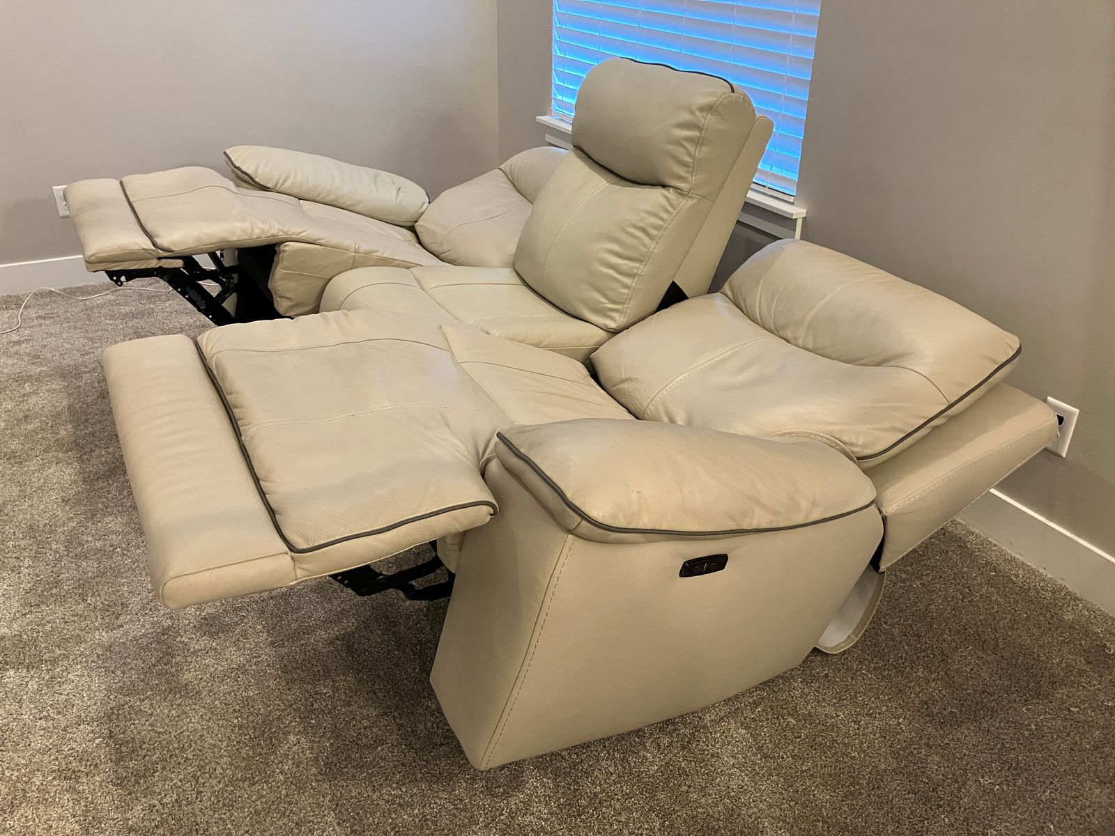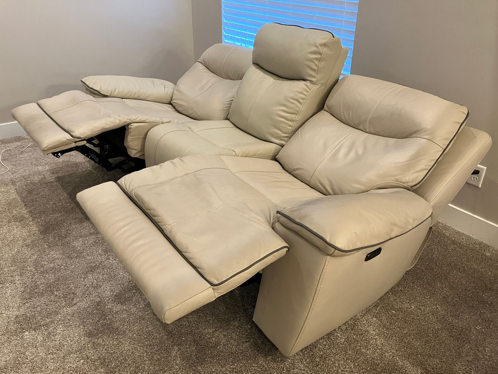 ApplePayThis reclining leather sofa couch was purchased a few years ago at Costco. It is off-white with dark gray trim. It reclines automatically and has a USB port on each end for charging devices. Measurements are 94 inches wide, 39 inches tall and 38 inches deep. Non-smoking, no pet home. Pick up ONLY. Will accept cash or Venmo.