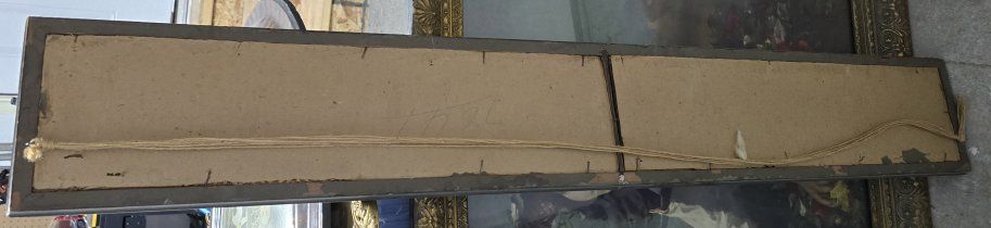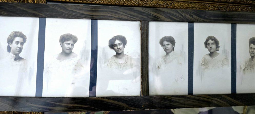 Antique early 1900s photographer sample display, approx. 50” x 7.5”. Features multiple portrait poses used in old studios, all in a long original frame. Unique vintage décor piece with great character.