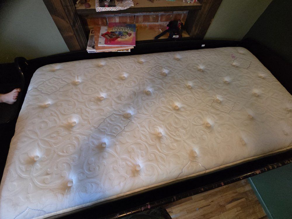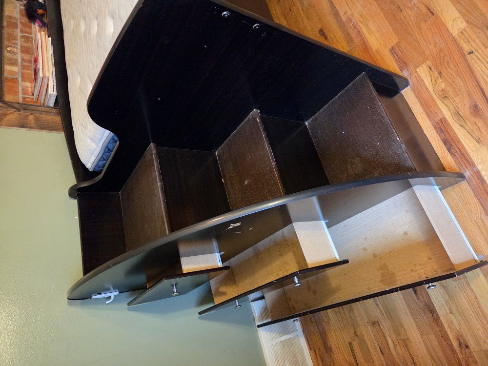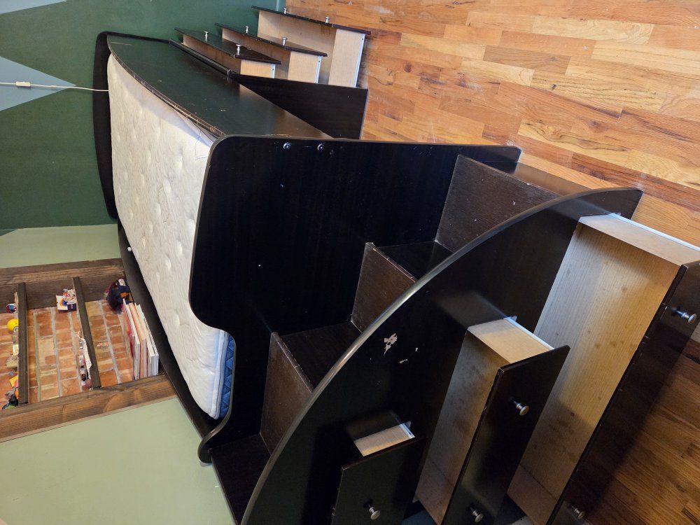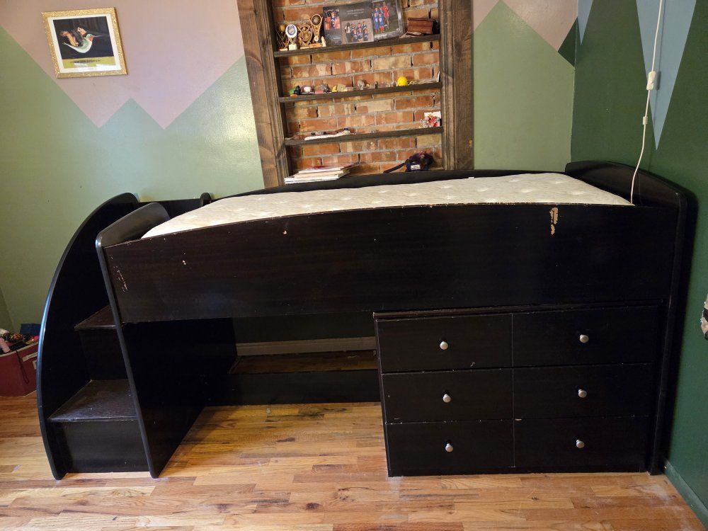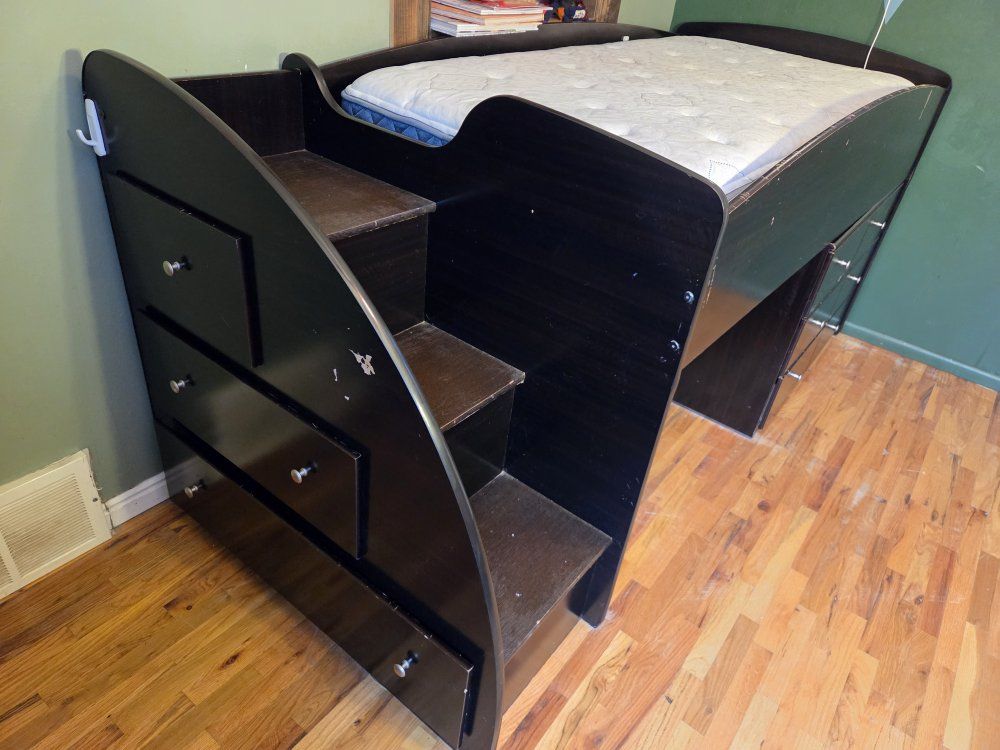 VenmoSturdy twin loft bed with built-in storage and a cozy under-bed space—perfect for a kid’s room! Features multiple drawers in the staircase for easy organization and a secure, solid frame. -Built-in stairs with storage drawers -Additional storage space underneath (great for a reading nook or play area) -Strong, stable construction Mattress and sheets included (if desired)