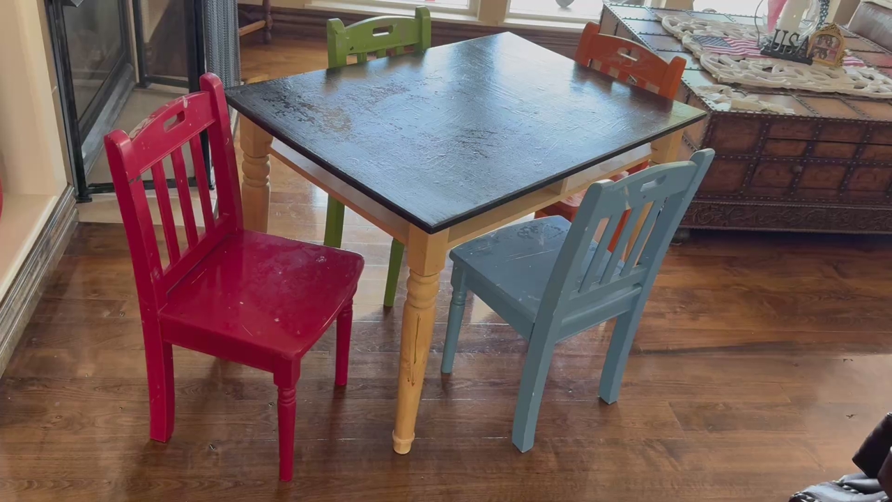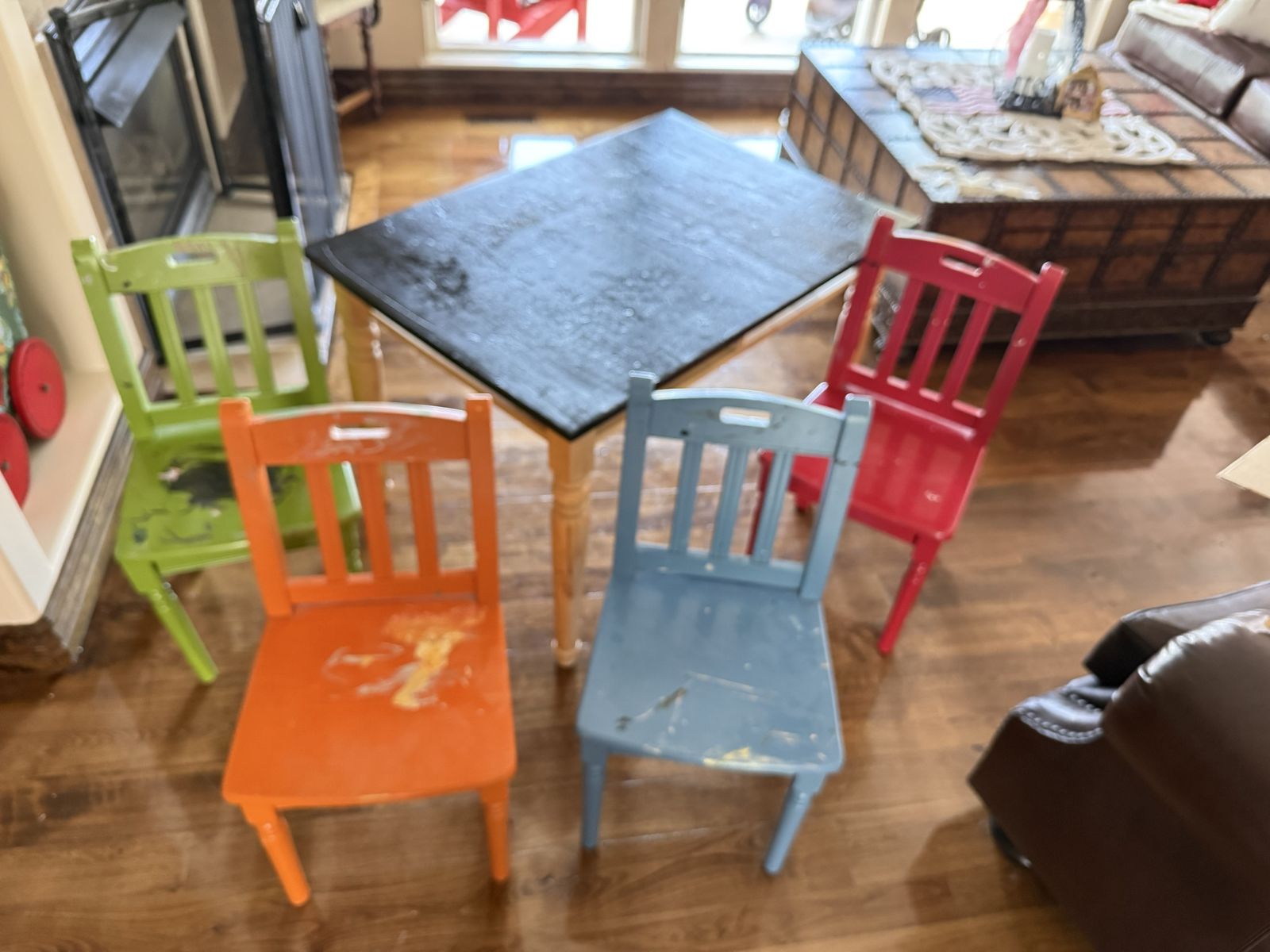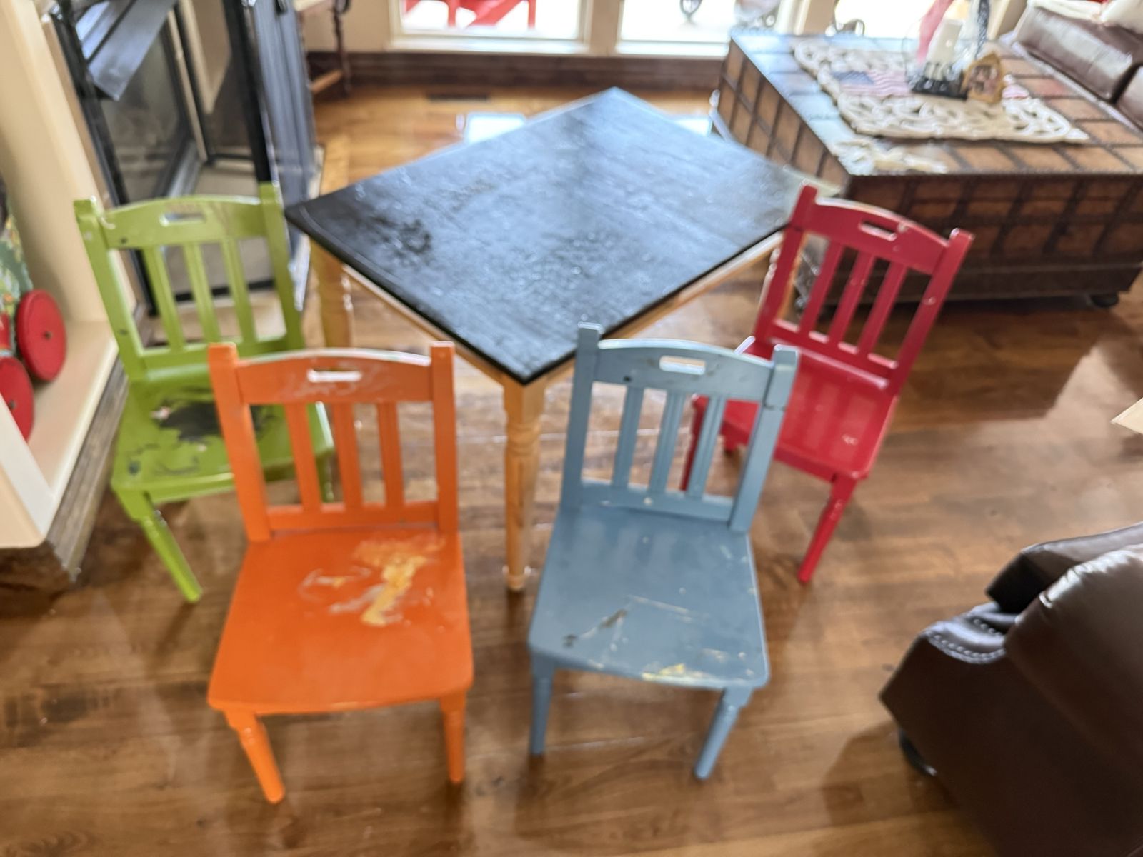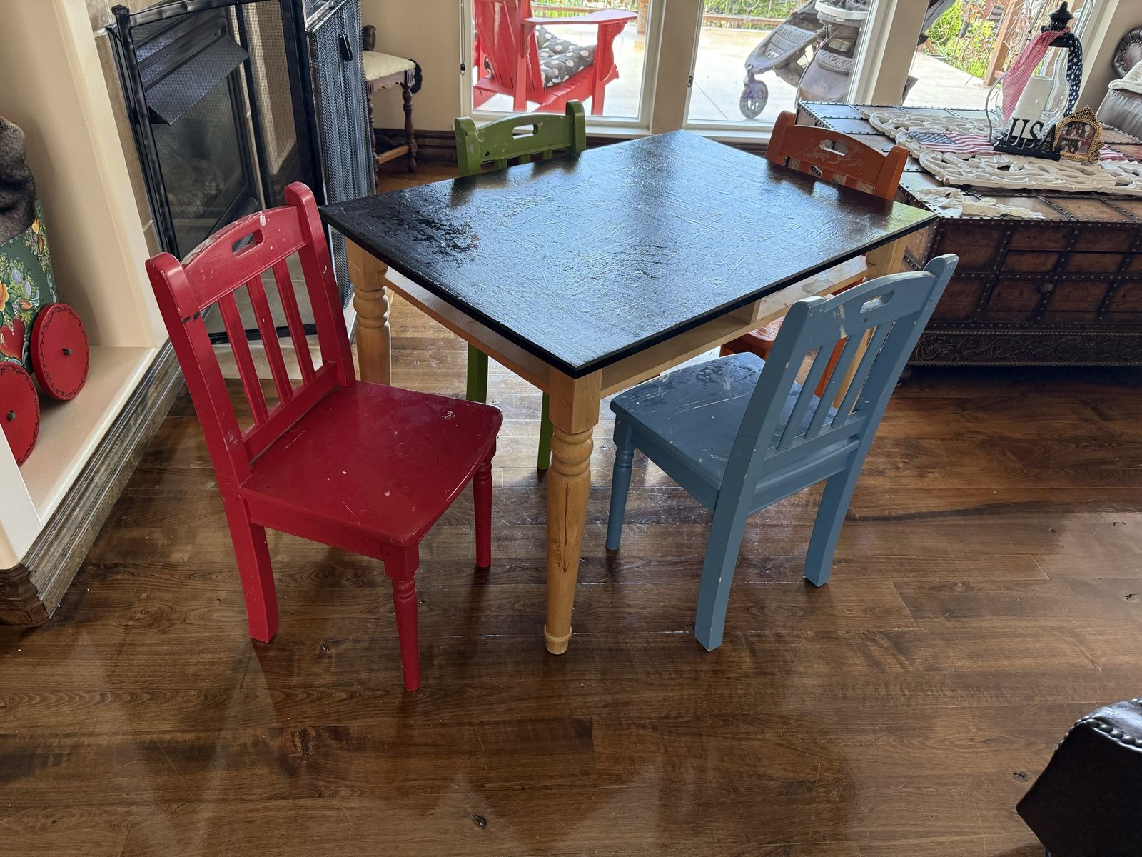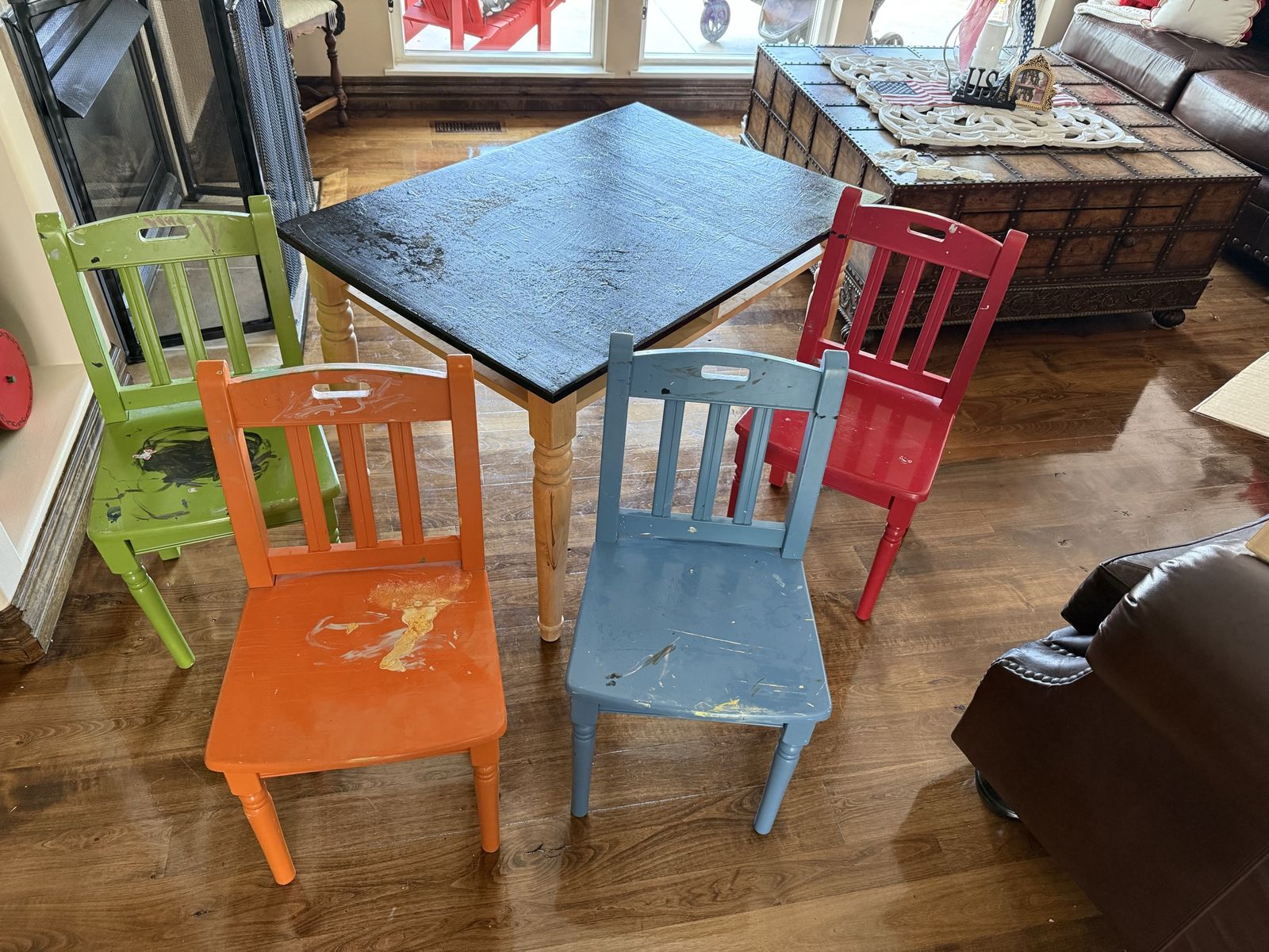Kids sturdy homeschooling table and chairs with storage compartments. It does have paint splatters on it, but could easily be repainted.