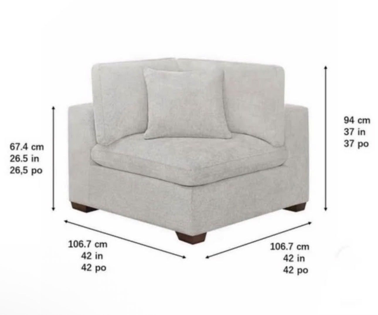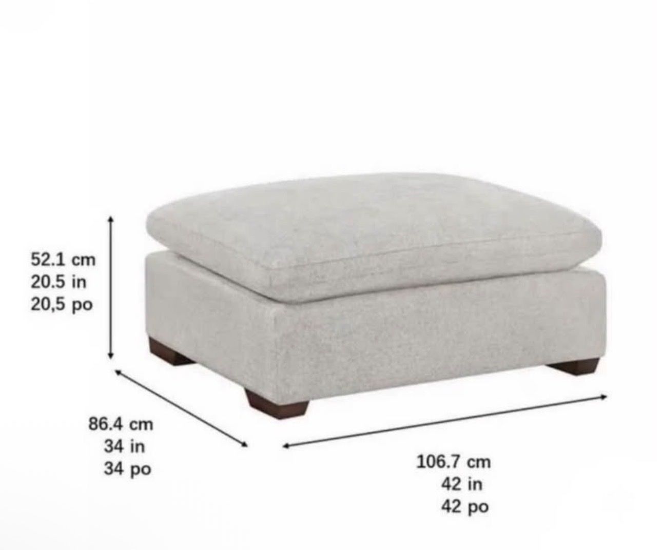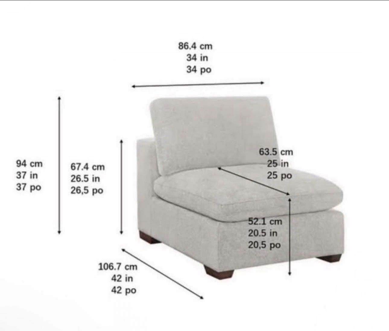 Overall Dimensions (in) *depends on configuration Seat Height 20.5" Seat Depth 25" Arm Height 26.5" Back Height - without back cushions 26.5" Back Height - including back cushions 37" Weight 421.08 lbs Weight Capacity 250 lbs per seat Armless Chair Dimensions (in) 34" L x 42" W x 37" H Armless Chair Weight 59.62 lbs Corner Wedge Dimensions (in) 42" L x 42" W x 37" H Corner Wedge Weight 83.6 lbs Ottoman Dimensions (in) 42" L x 34" W x 20.5" H