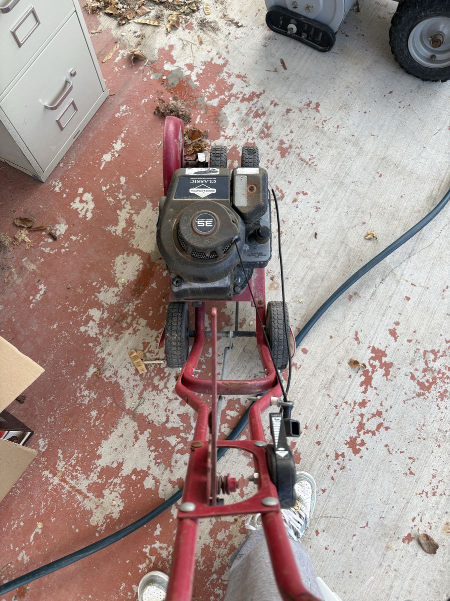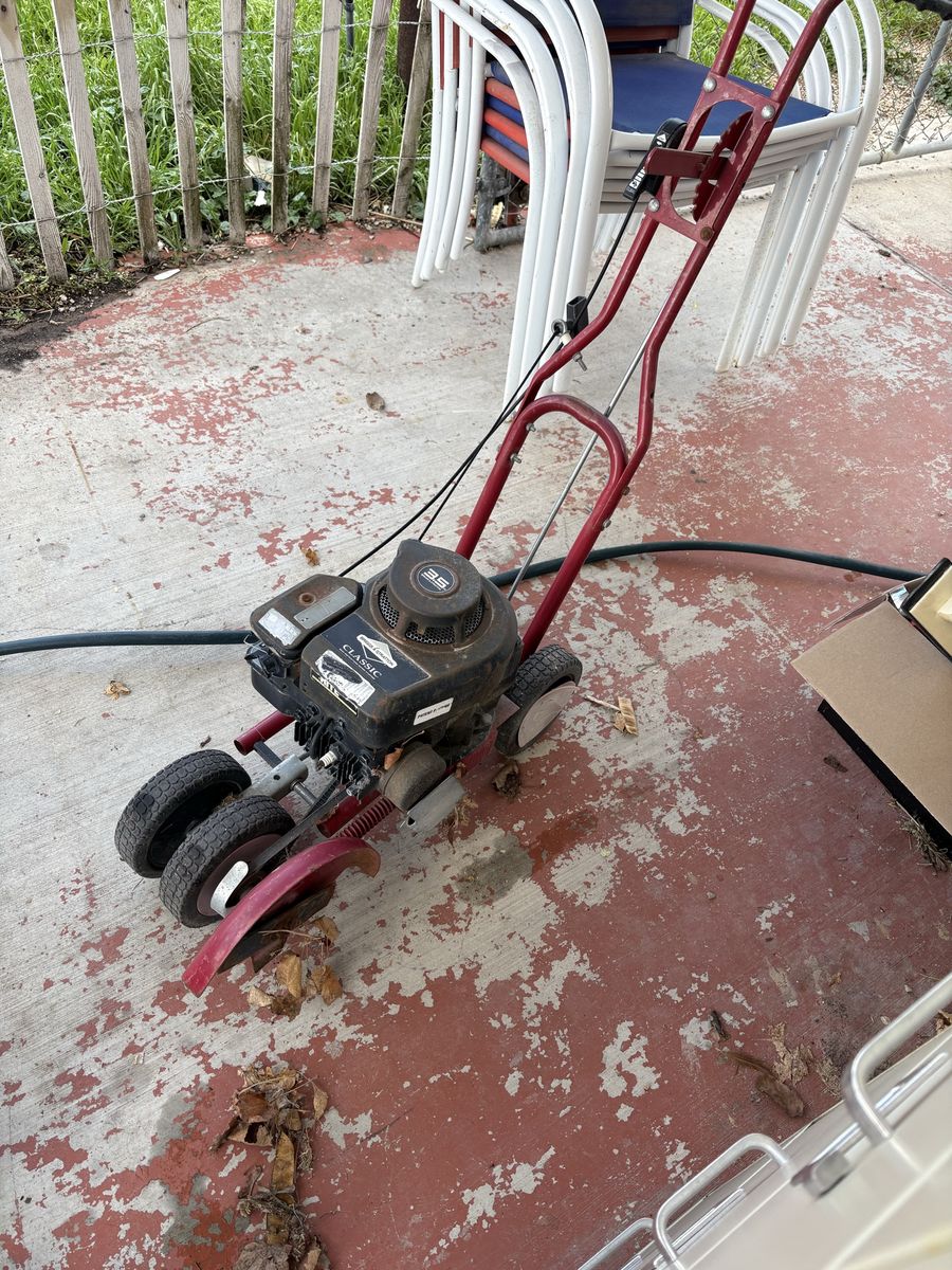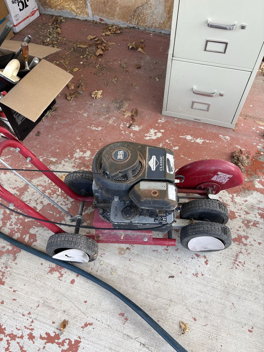 Powerful Briggs & Stratton 3.5 HP Classic engine on this walk-behind lawn edger. Red metal frame has four wheels and adjustable height lever. Gas-powered motor with pull start and black plastic engine cover.