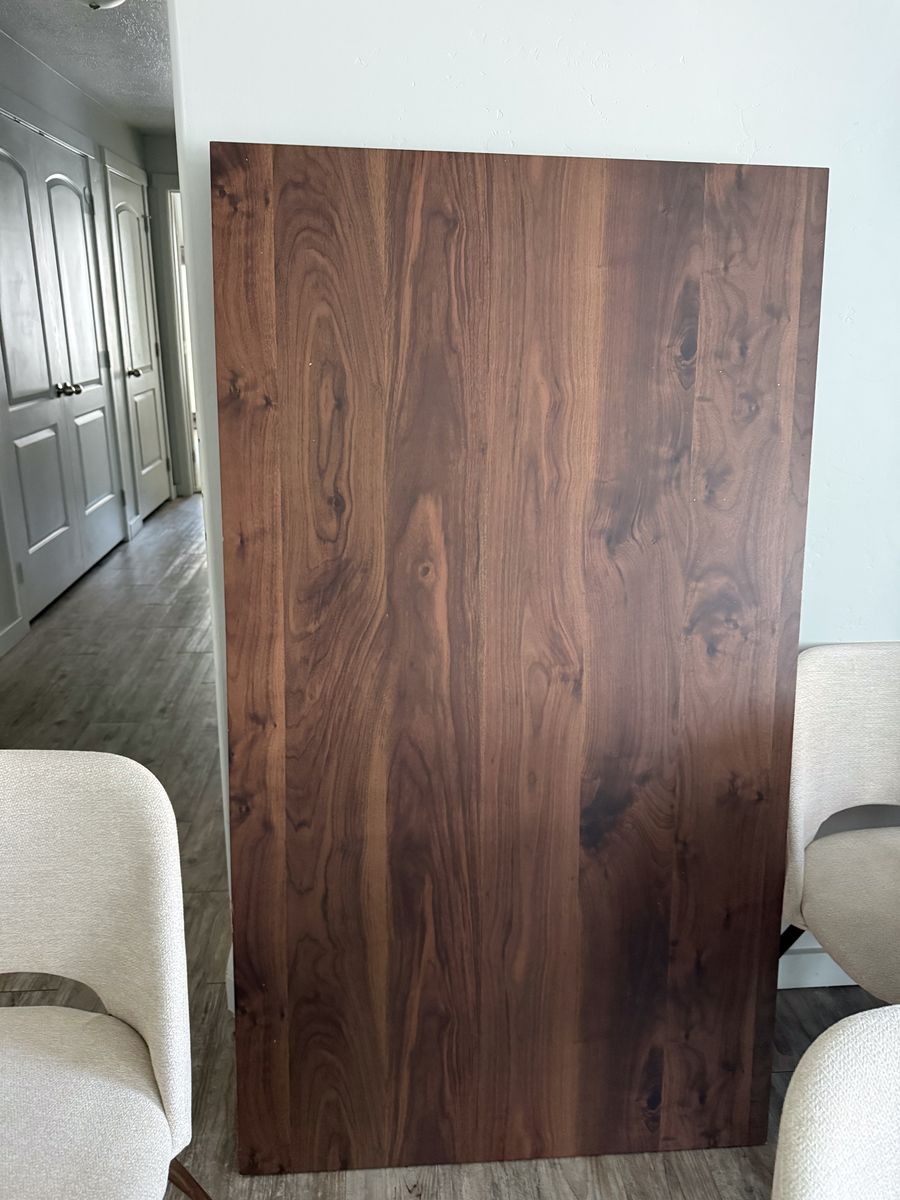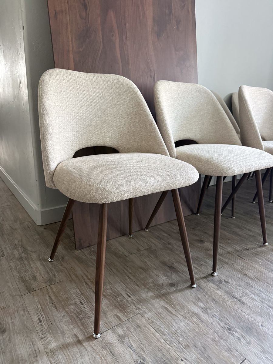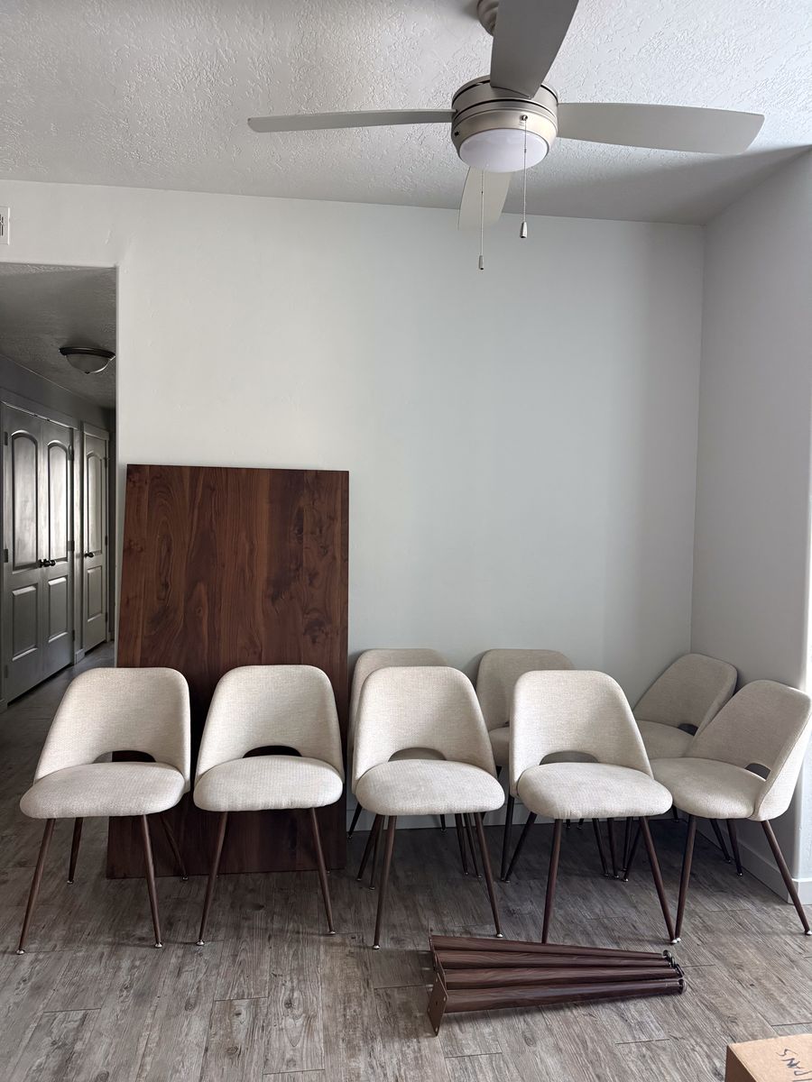 Beautiful mid-century style dining set with extendable table and 8 upholstered chairs. Table expands easily to seat up to 8—perfect for family dinners or hosting. Features a warm wood-look finish, tapered legs, and built-in storage for extension leaves. Sad to let it go! I'm downsizing and just don't have space to keep it.