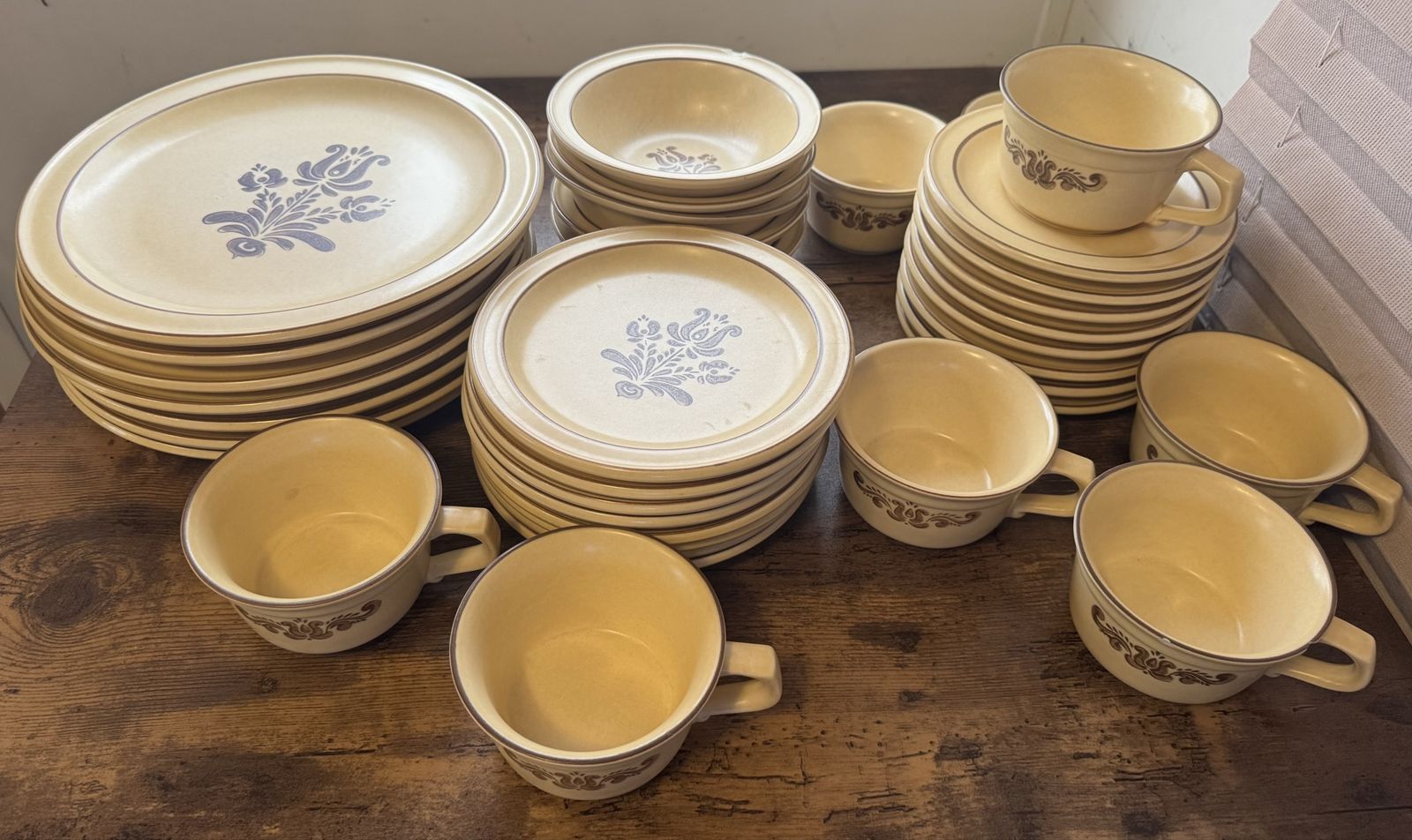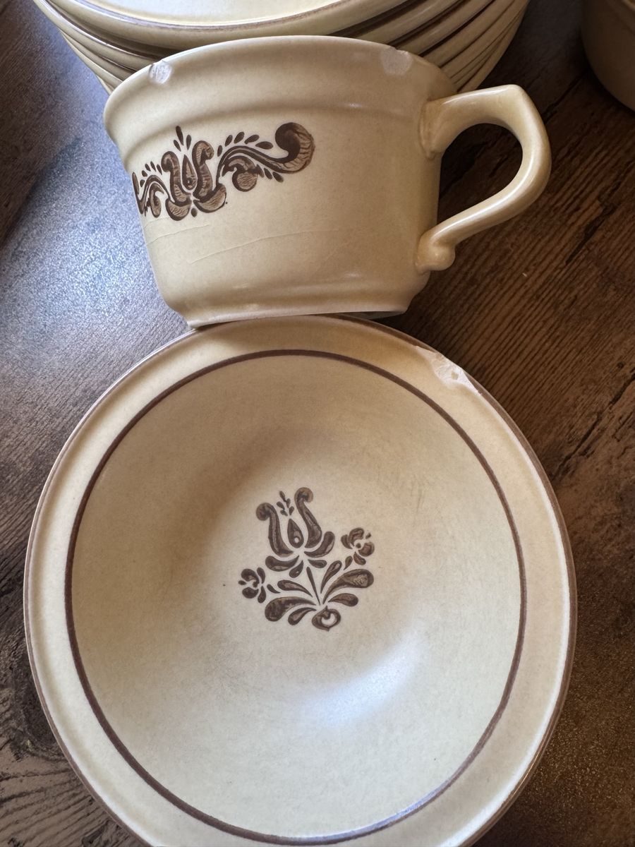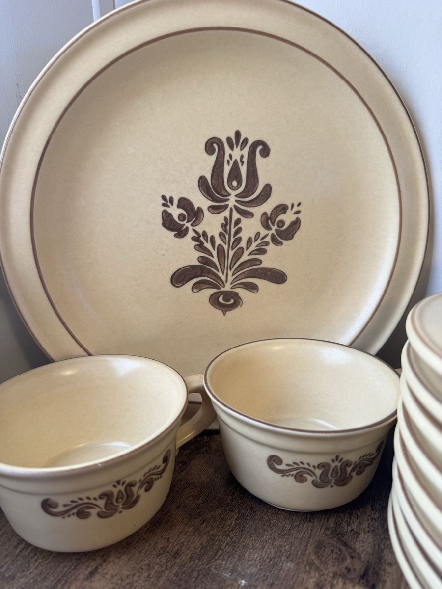 Vintage Pfaltzgraff Village Stoneware USED. I believe this is a 1976 set. 7 Dinner plates 8 Salad Plates 5 Bowls 8 saucers 8 tea cups