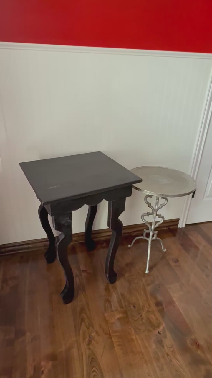 End tables for sale: Silver is all metal 25.5 T 17W, black wood 30” T 18” W $40 each