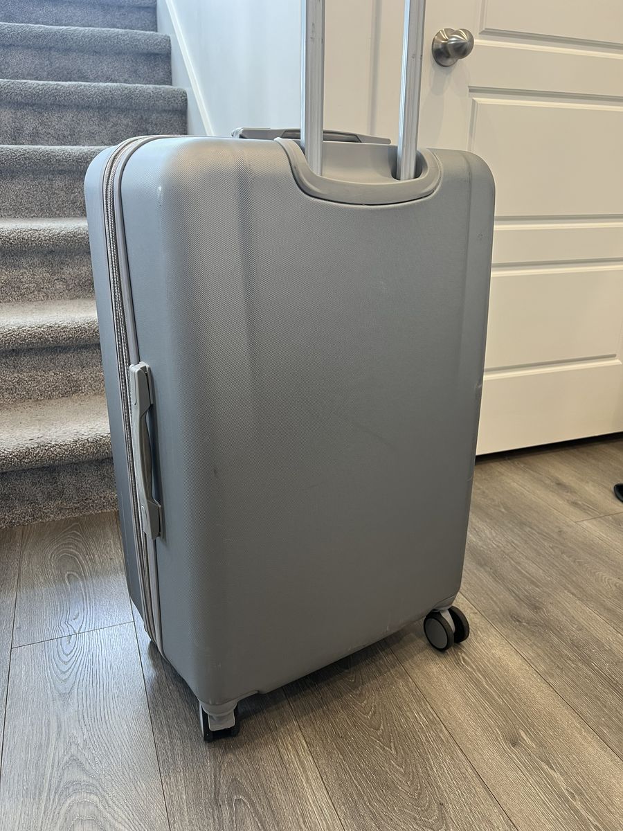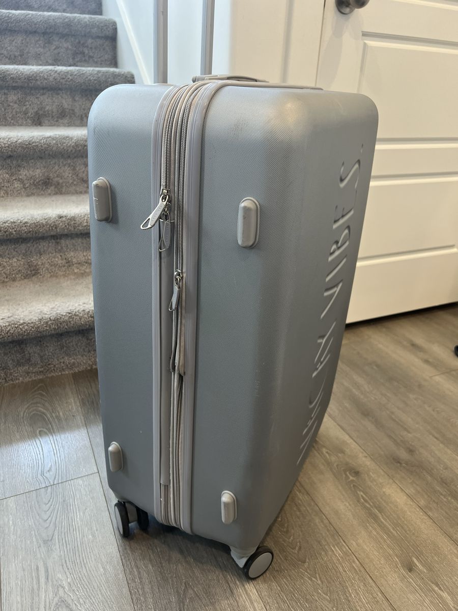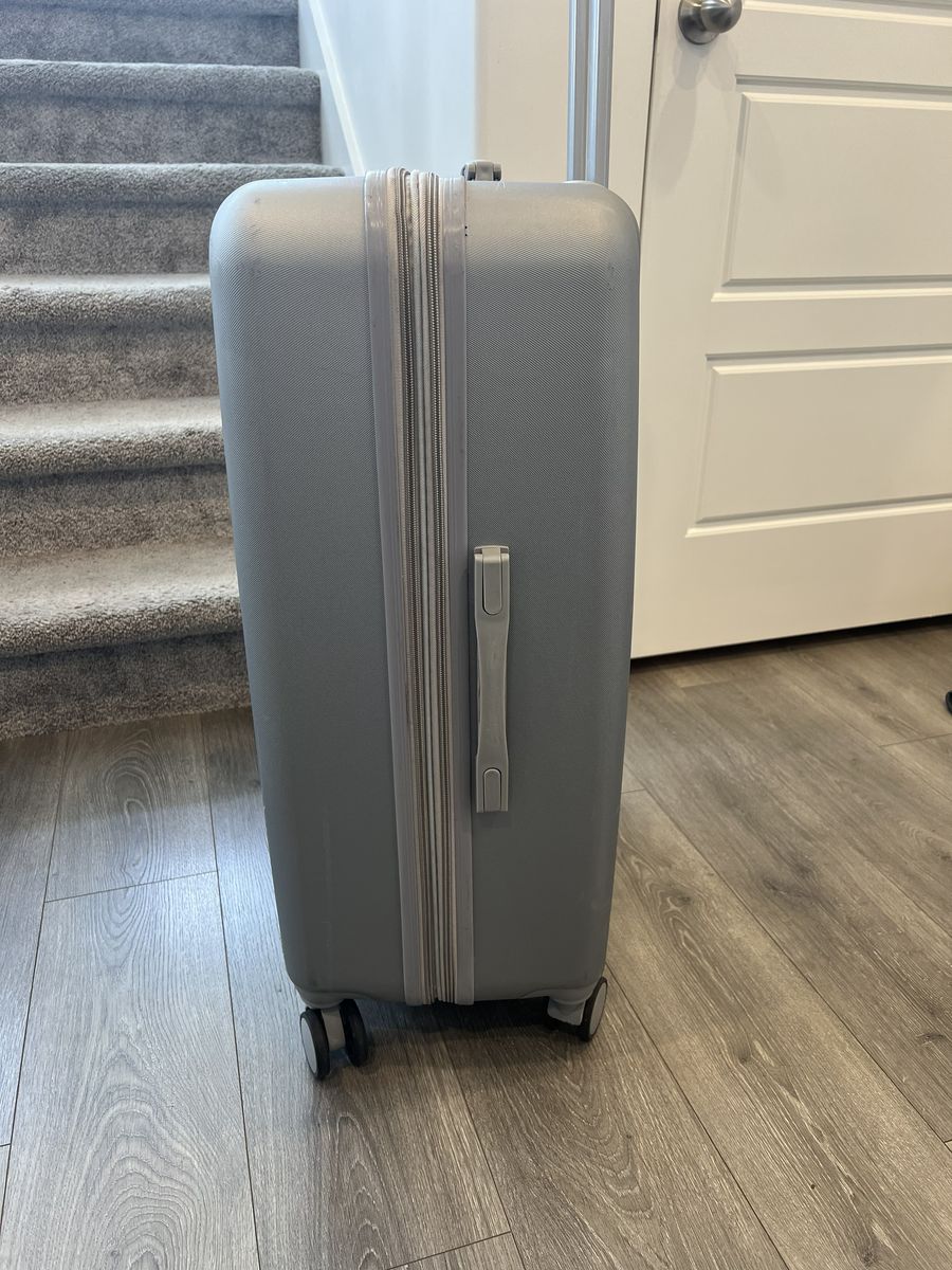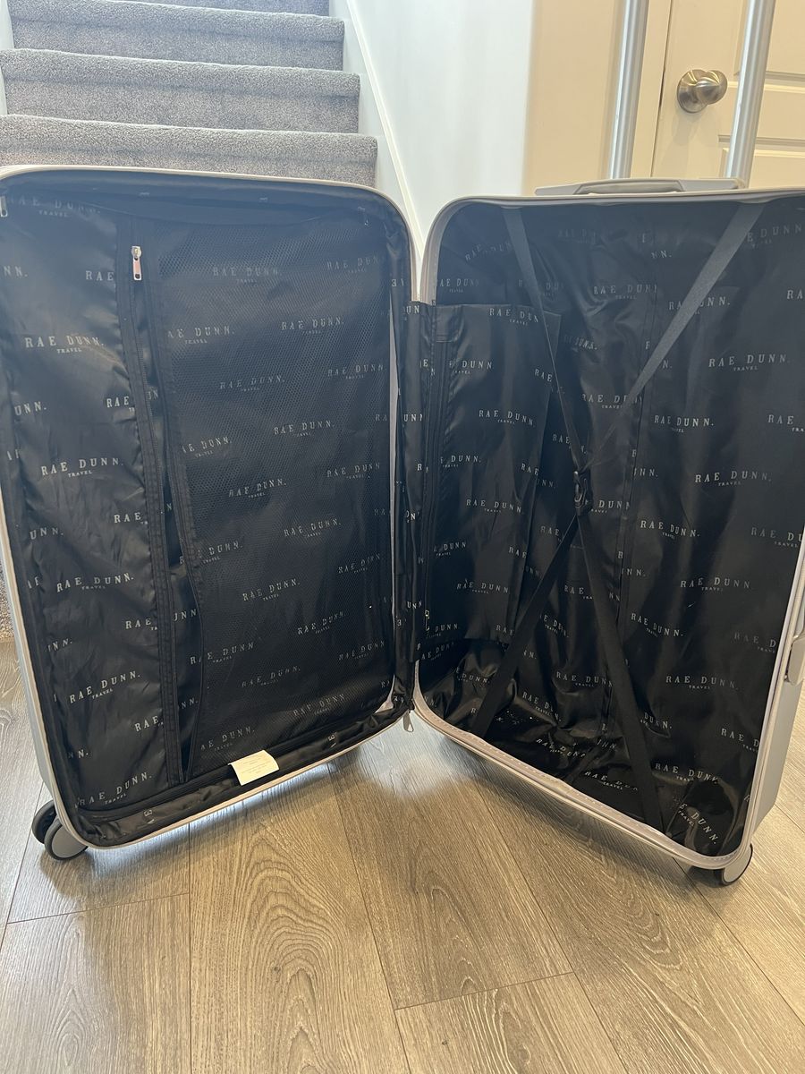 Rae Dunn hard shell suitcase in gray. Large checked size with expandable zipper for extra space, 360° spinner wheels, and telescoping handle. Interior has zip divider and straps for organization.