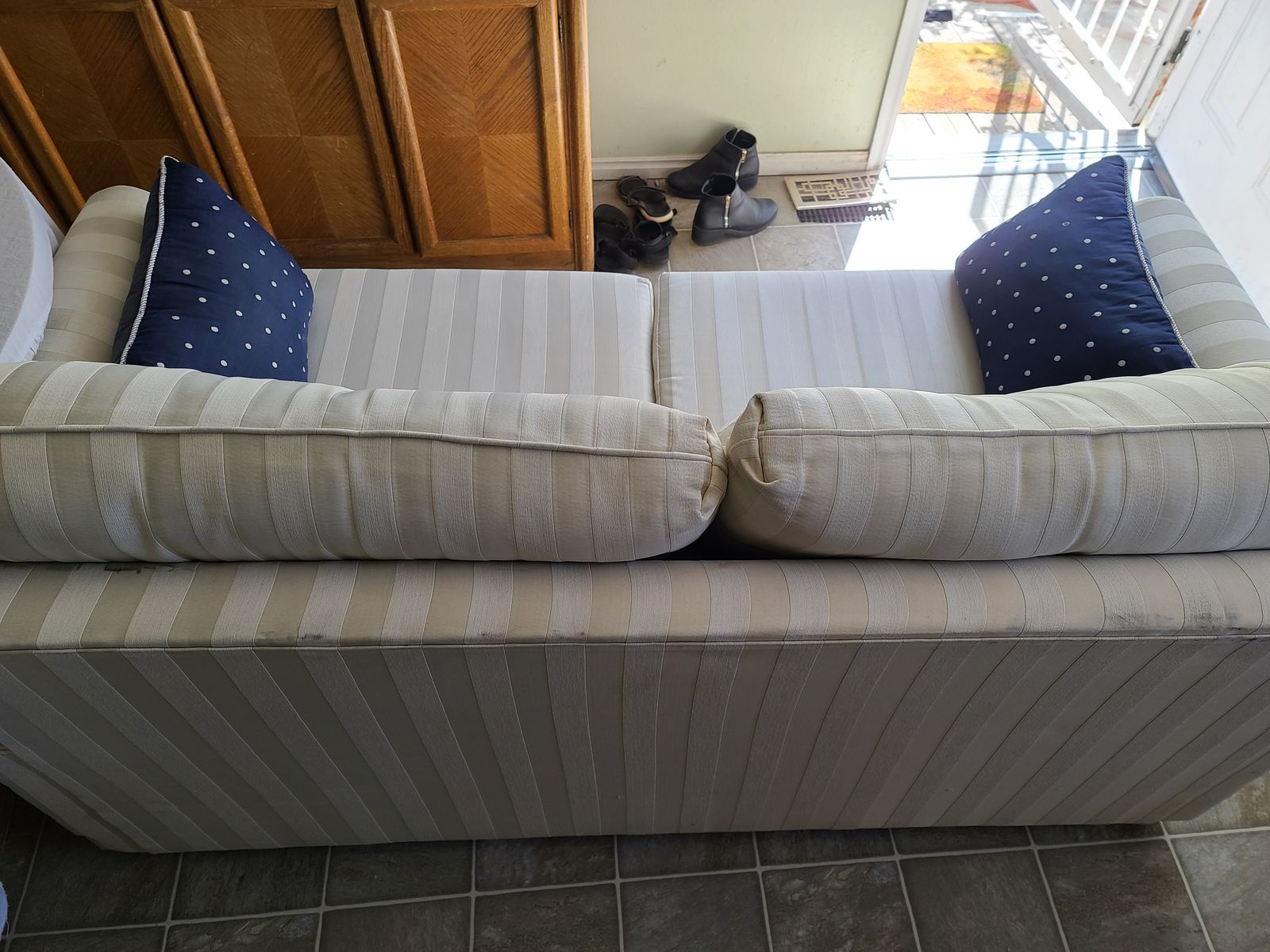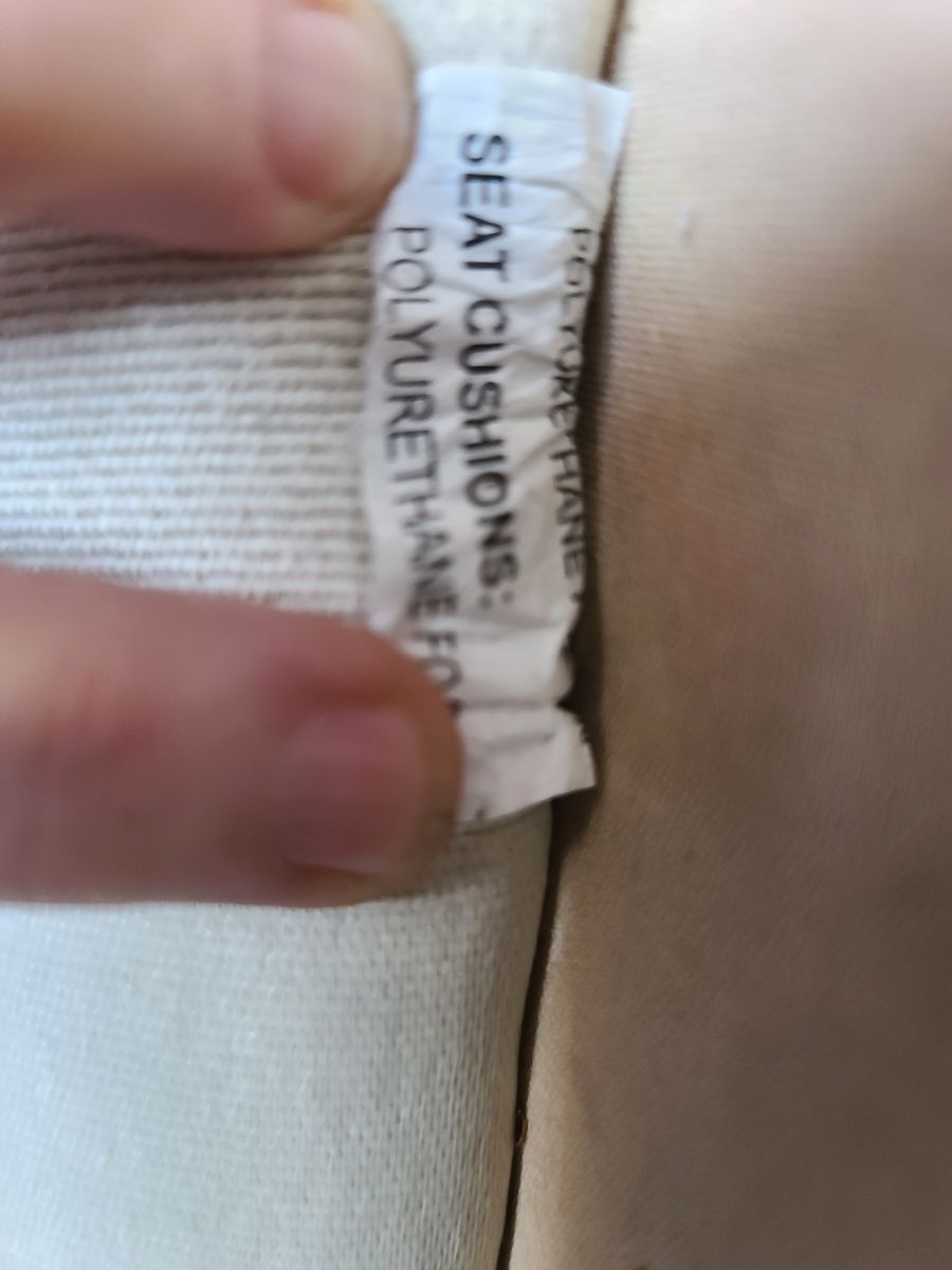 Ivory-colored fabric 2-seater loveseat or sofa or couch or settee with polyurethane foam seat cushions and a variety of decorative toss pillows.