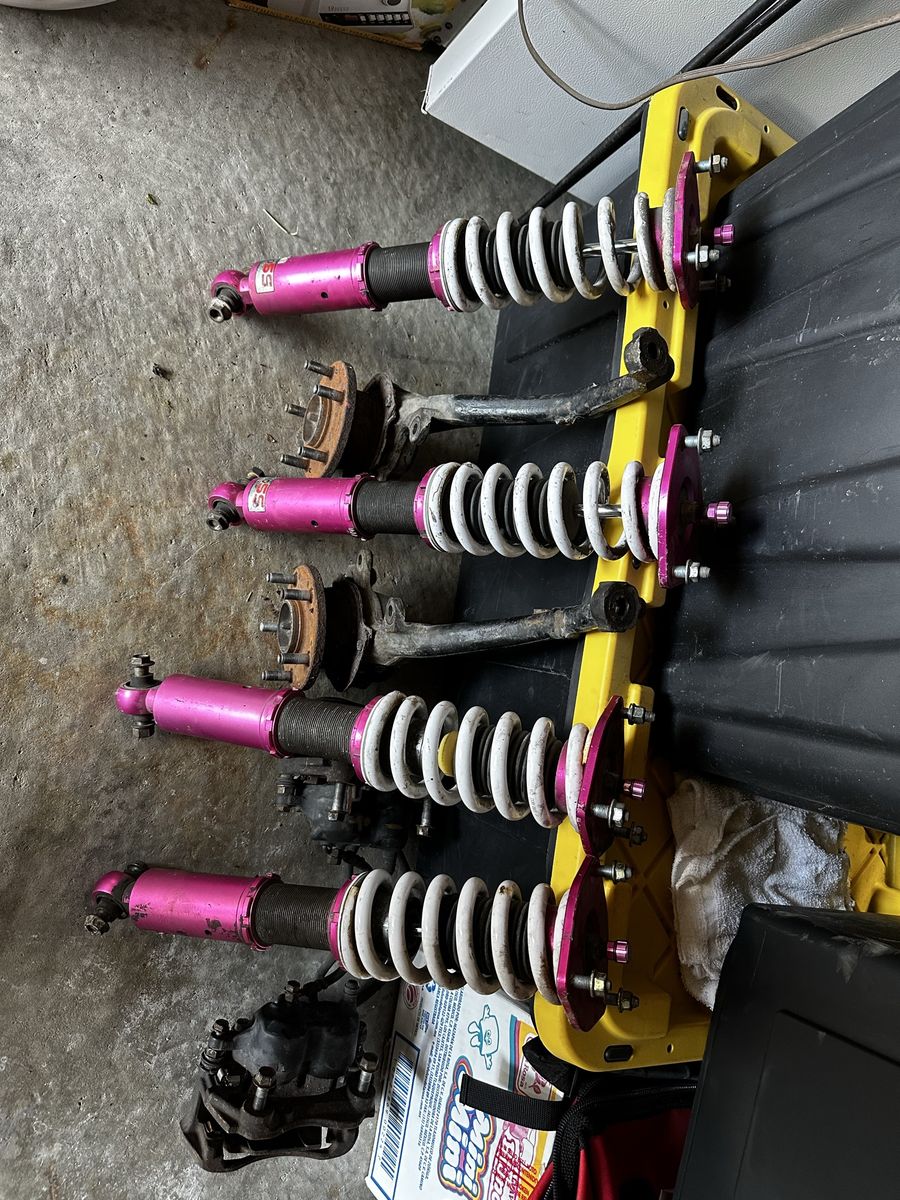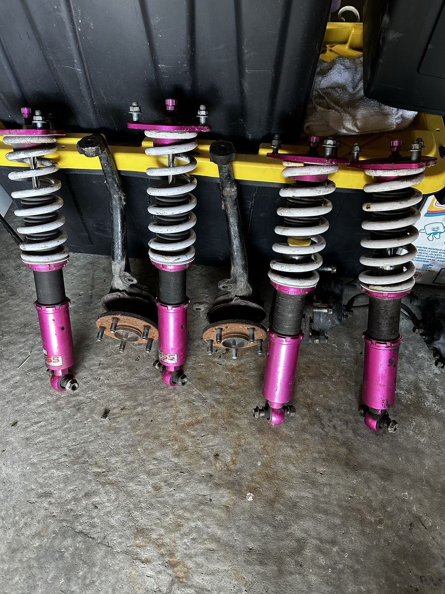 ApplePayGodspeed Coilovers for sale let me know if you’re interested Condition: • Used, but in great condition. • Not blown: All shocks have solid rebound and no leaks. • Threads are clean and adjust freely. • Bushings and top mounts are in good shape.