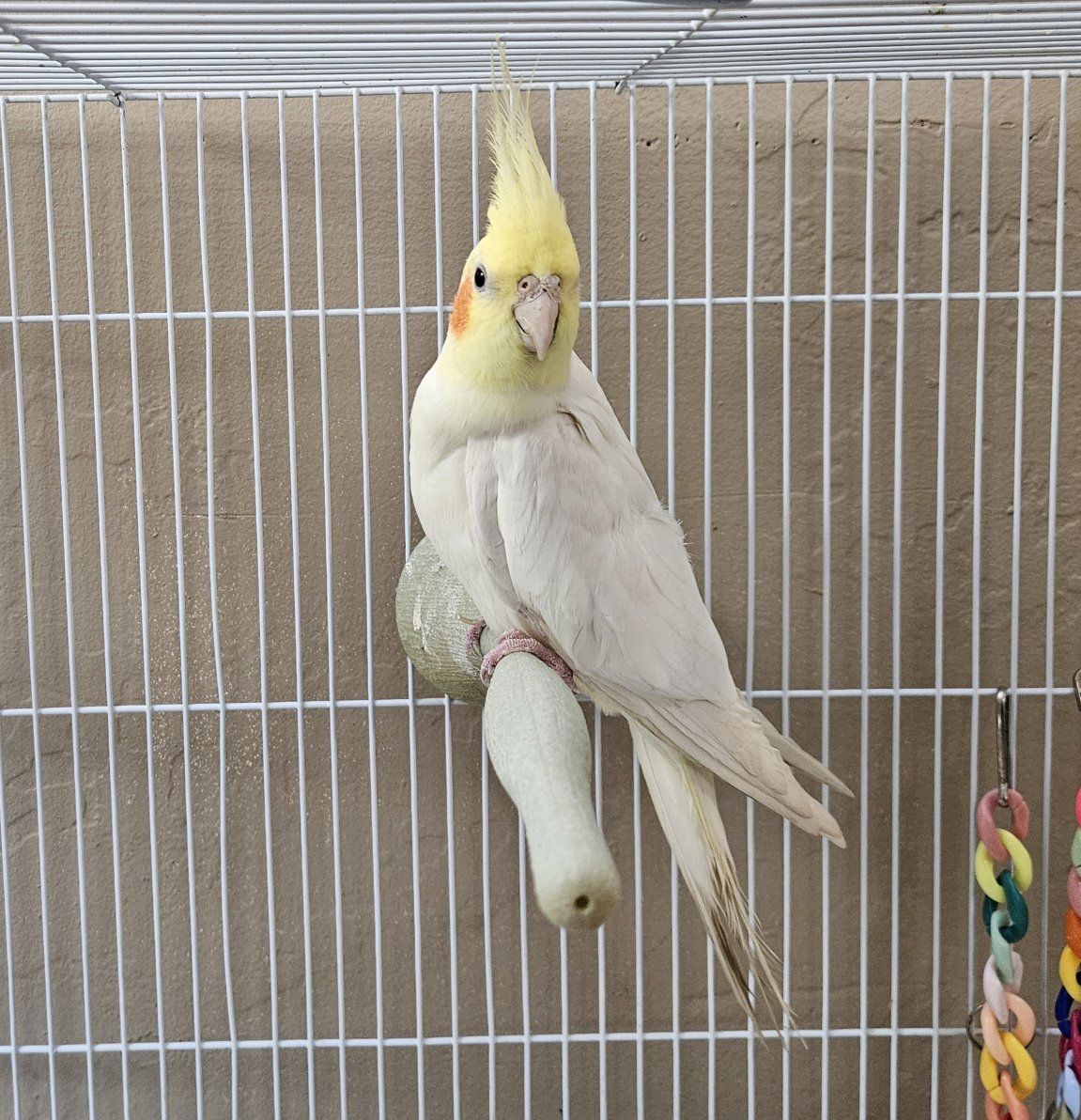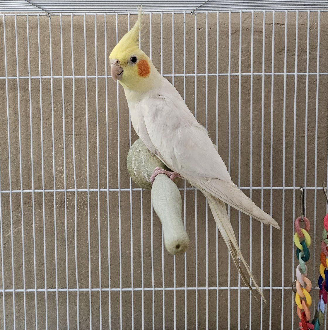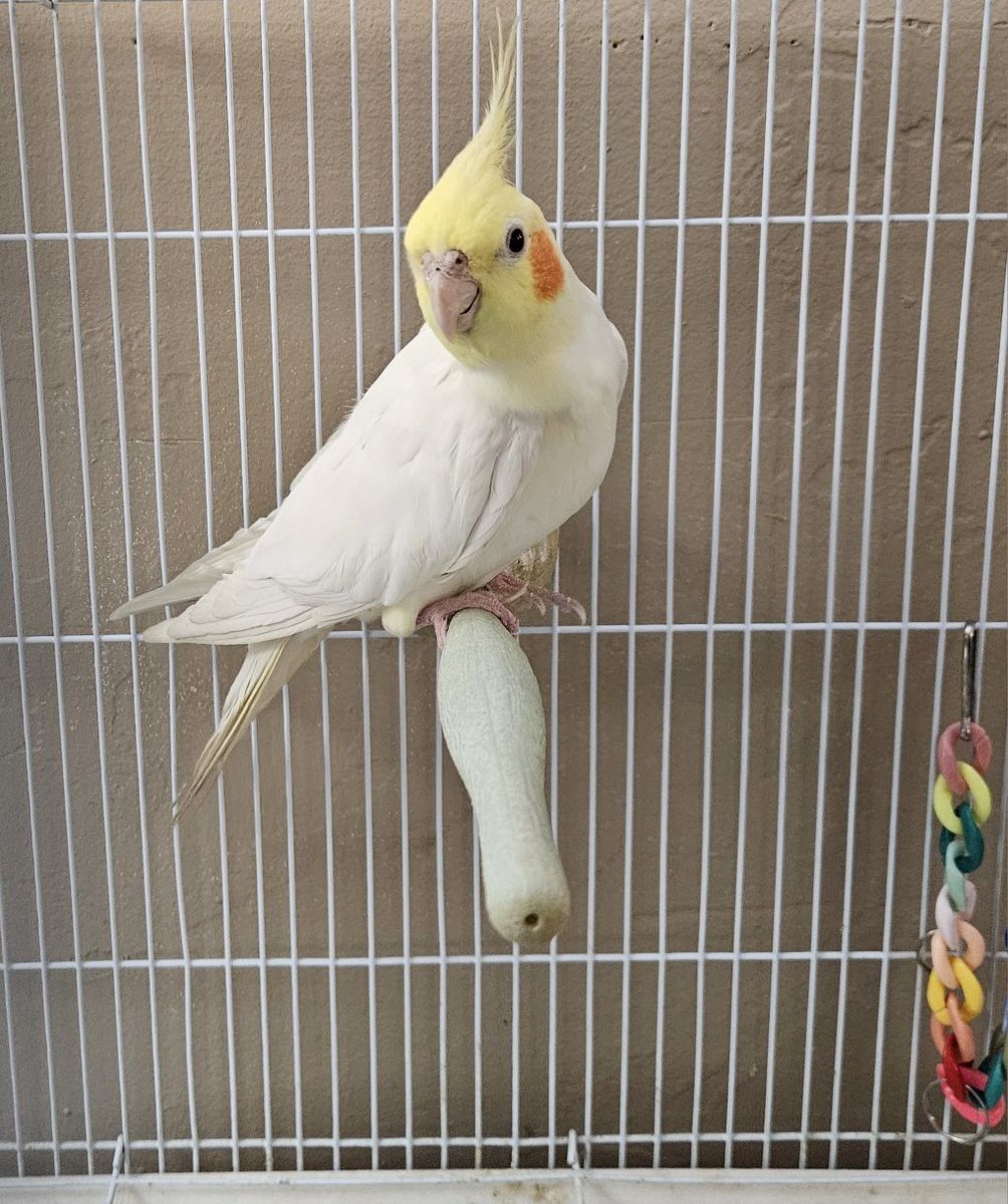 Beautiful 2 yr. old male Lutino Cockatiel. He is semi-tame and will let you hold him. Doesn't come with a cage.