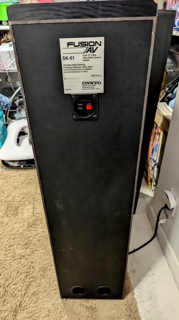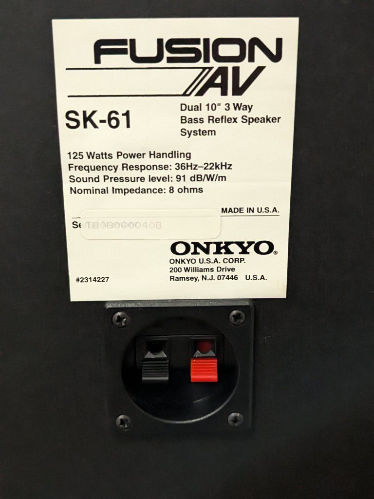 Specifications: Model: Onkyo SK-61 Floor standing / tower speakers 3-way design Bass reflex (ported) Dual 10" woofers per speaker 125W 8 ohms Black