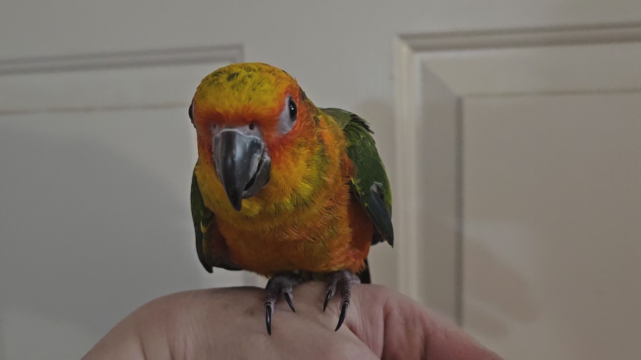 Beautiful 3 month old Hybrid Sun-Jenday Conure. Was hand fed and now eating good on its own. Ready to go to a forever home. I am unsure of the gender..(SORRY NO TRADES)