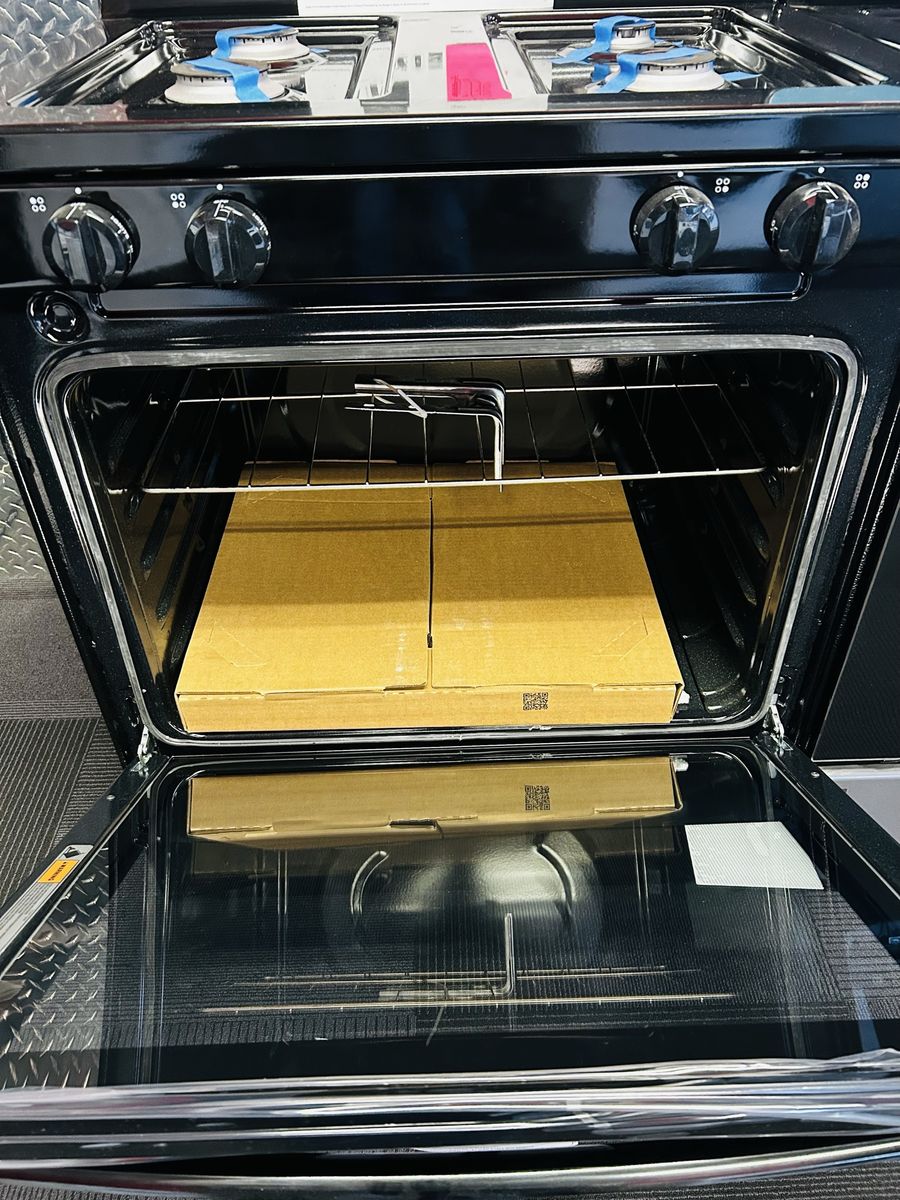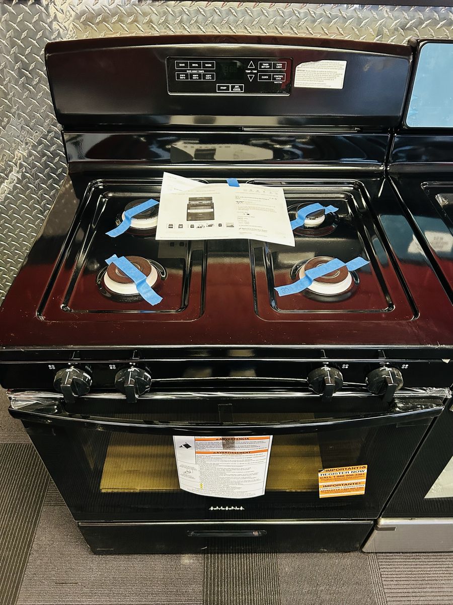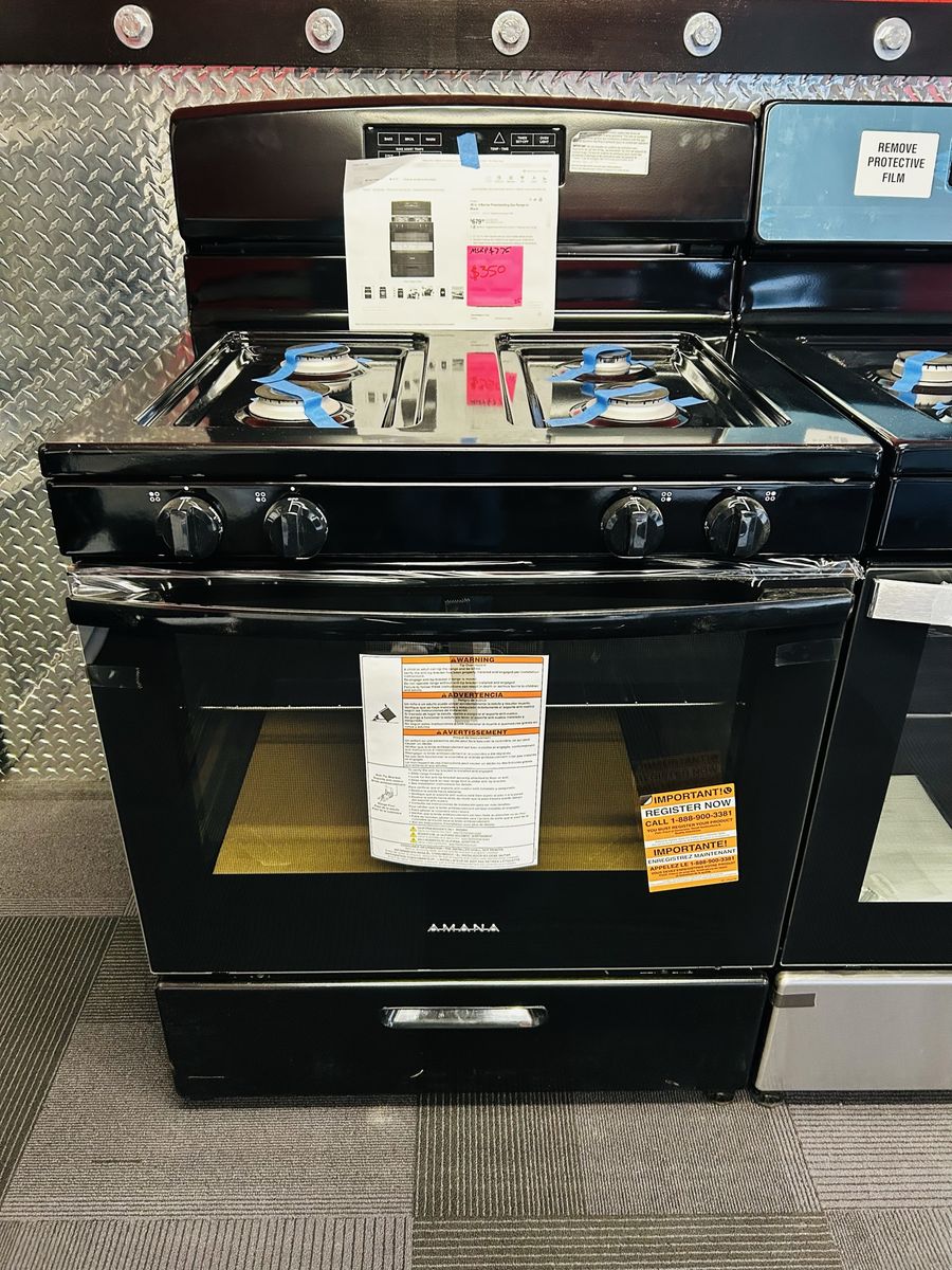 Amana gas range bake broil warm bake assist temps timer oven light clock control lock etc.. Brand New/Open Box. 45 day warranty, Delivery/Install Available