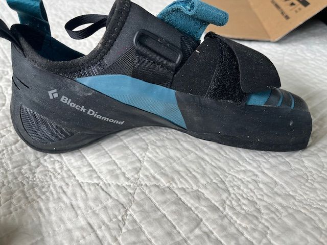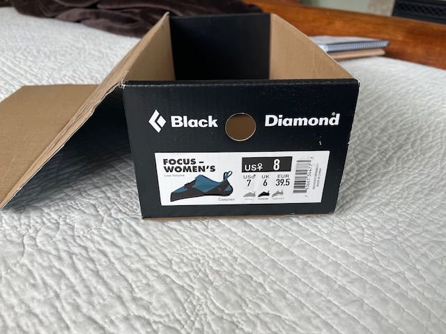 Size 8 (more like size 5) Black Diamond climbing shoes. Fits like a size 5. Never been used. I bought these for my daughter for Christmas, but this pair runs much smaller than expected.