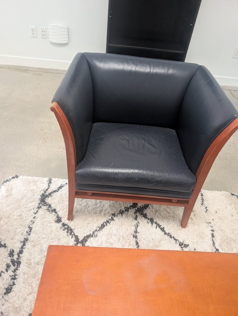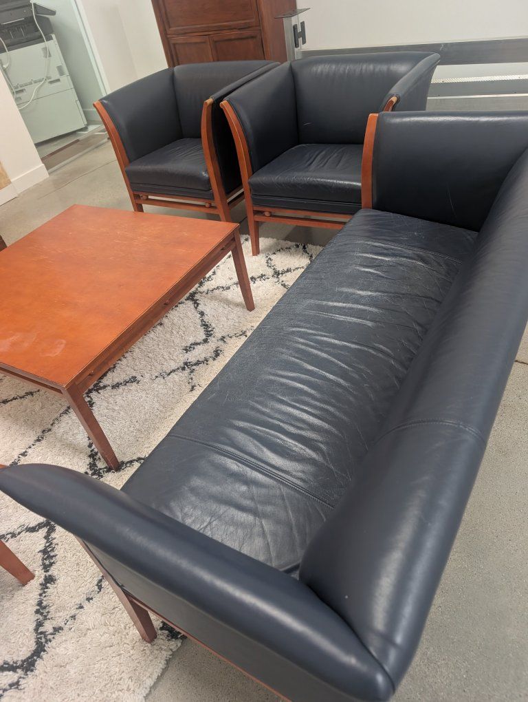 blue leather and wood waiting room set conspiring of longe and 3 armchairs. 150 or best offer for all.