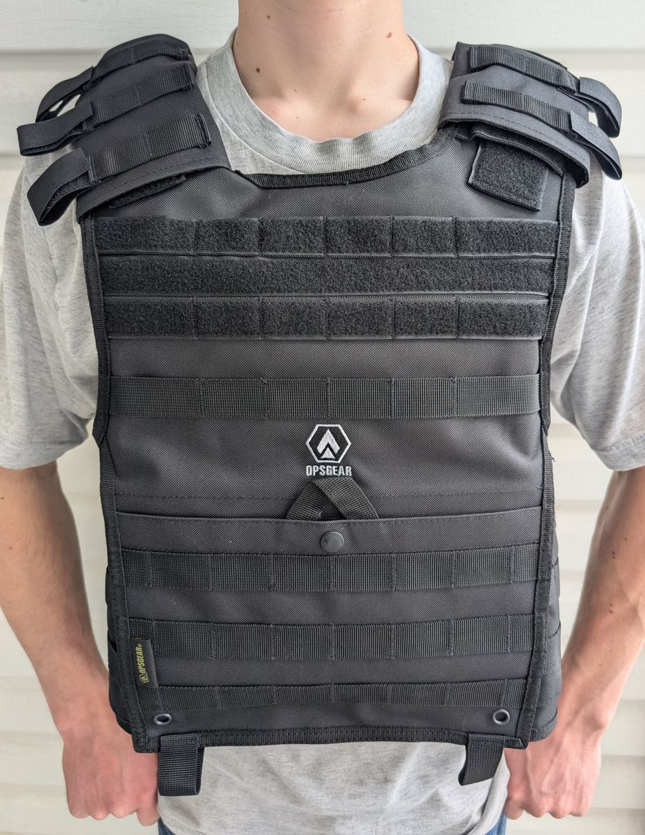 These plate carriers accept 10" x 10" plates front and back. They are very comfortable with adjustable fit. The guy in the picture is size medium. The estimated size range is S-L.