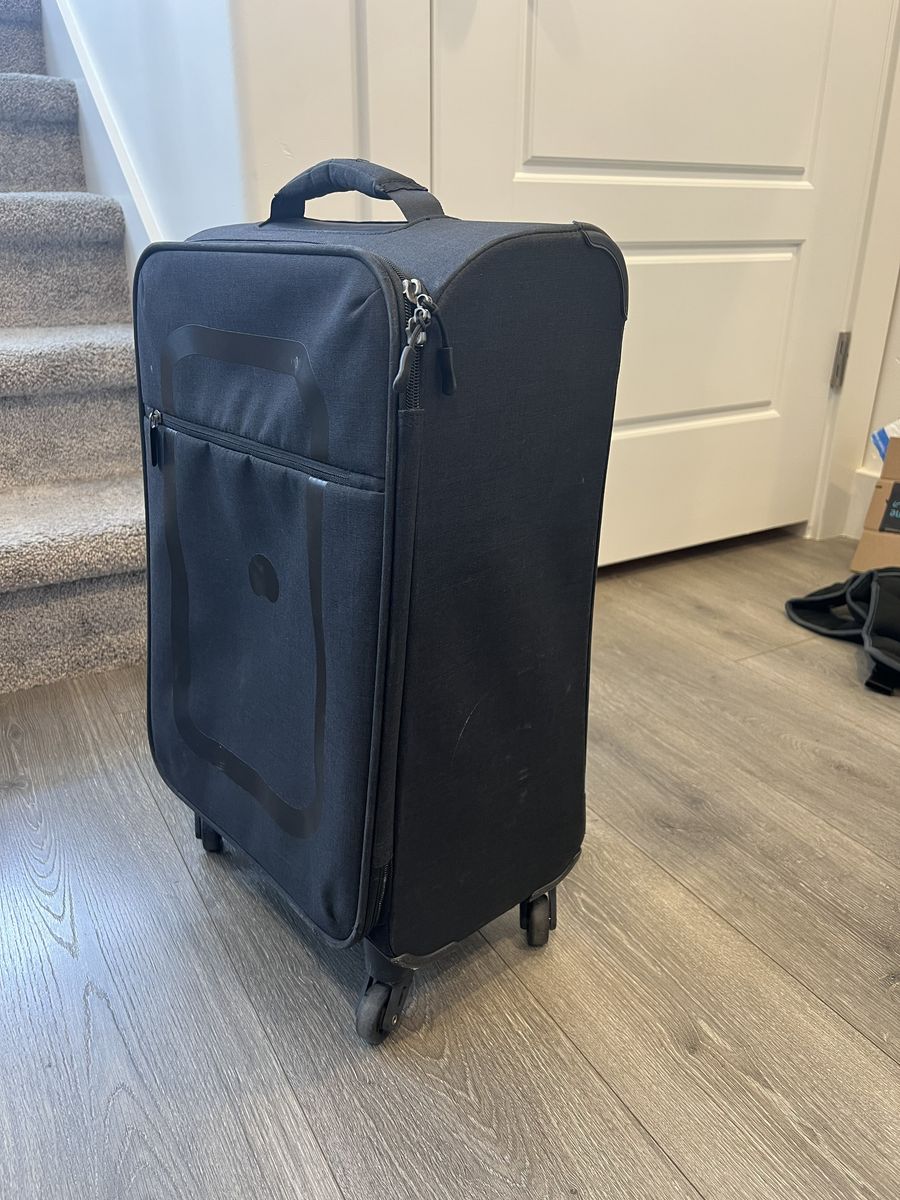 Delsey softside carry-on suitcase in black. Compact and very lightweight at just under 4 lbs, making it easy to stay within airline weight limits. Features 4 spinner wheels, telescoping handle, top and side handles, and front zip pocket for quick access.