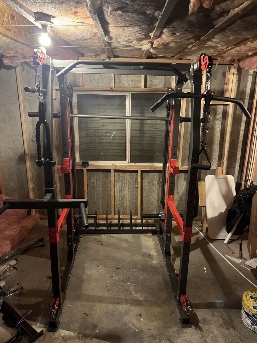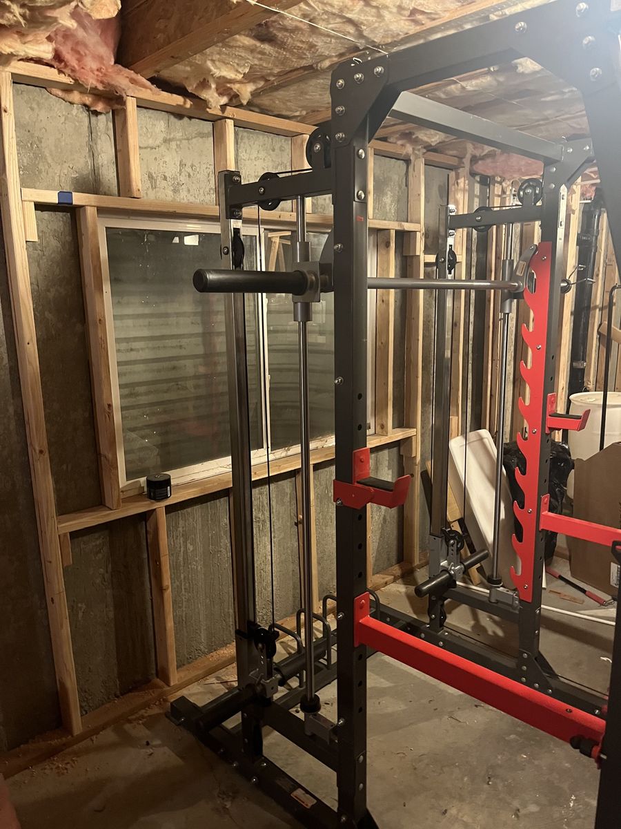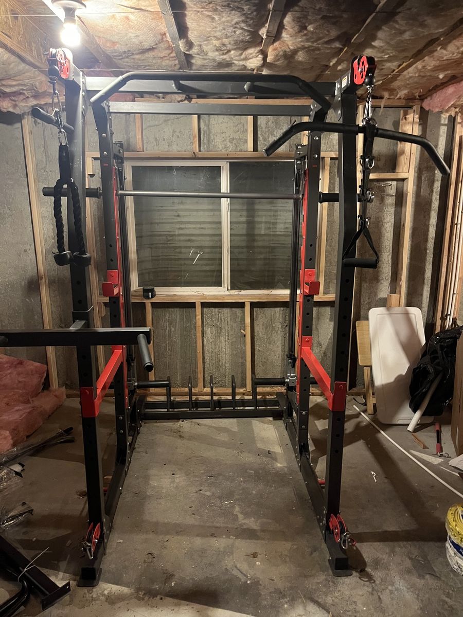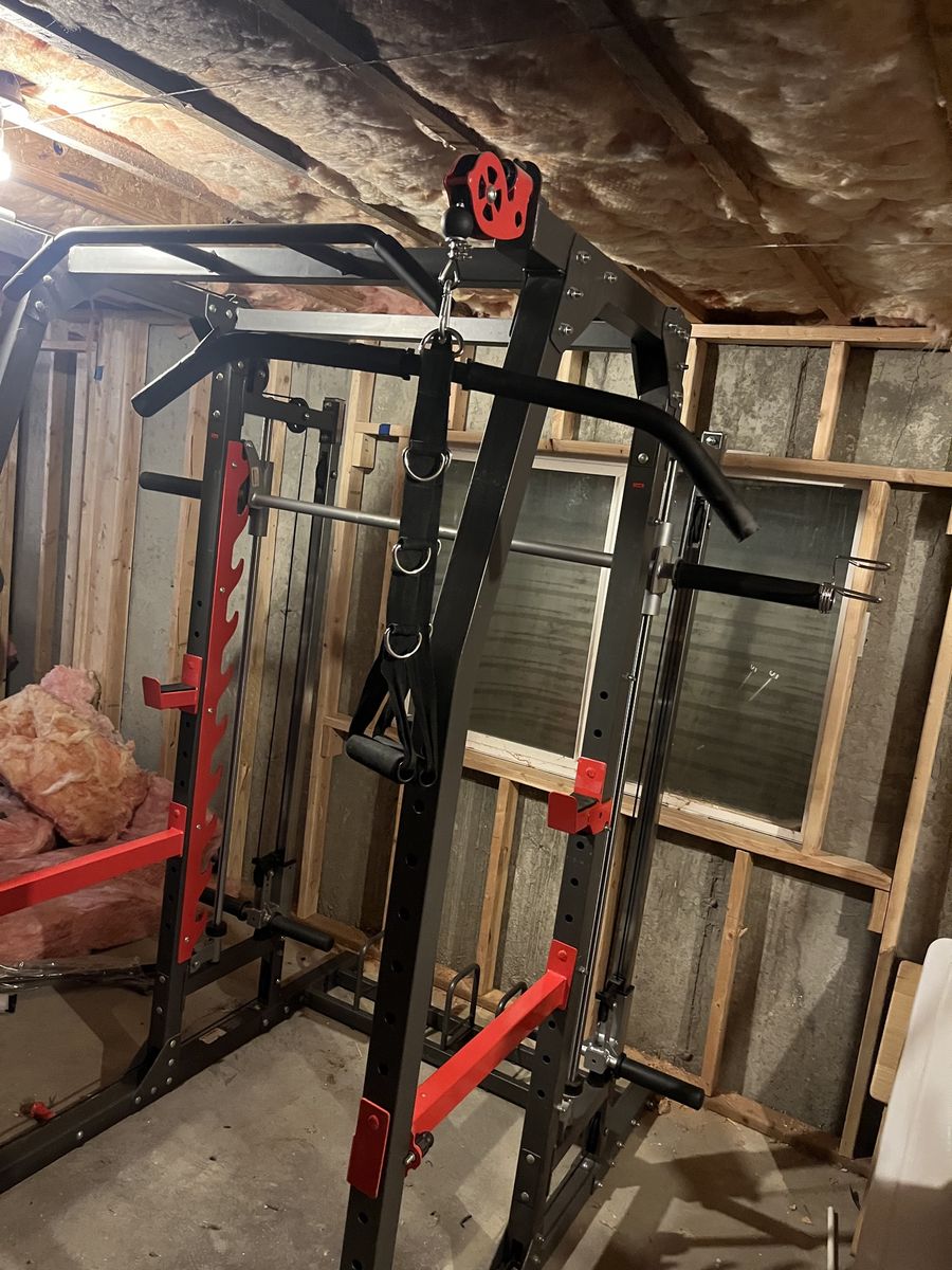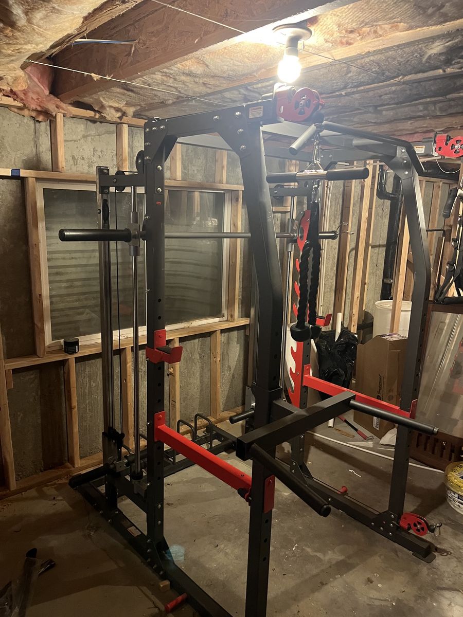 VenmoSmith machine with cable pullies comes with lat pull down bar, straight bar, rope, and single grips, and dip bar attachments. $400.