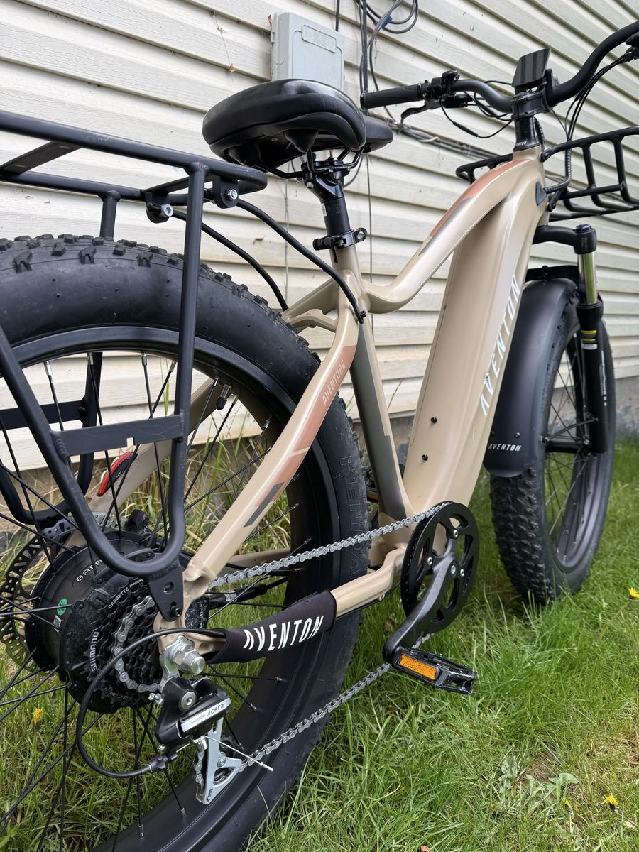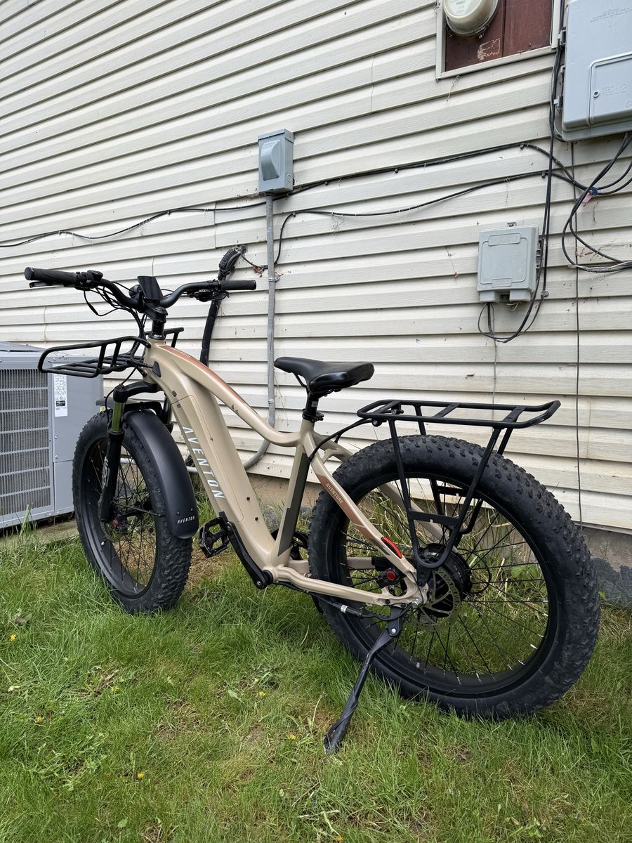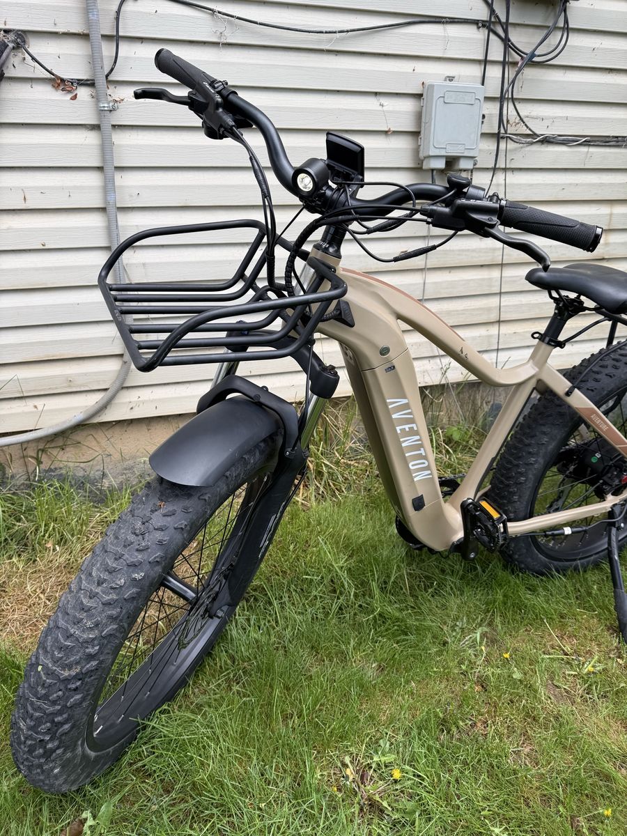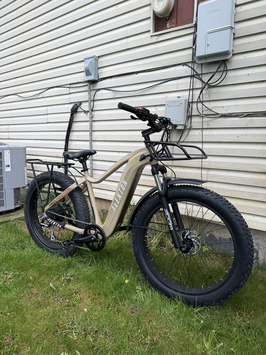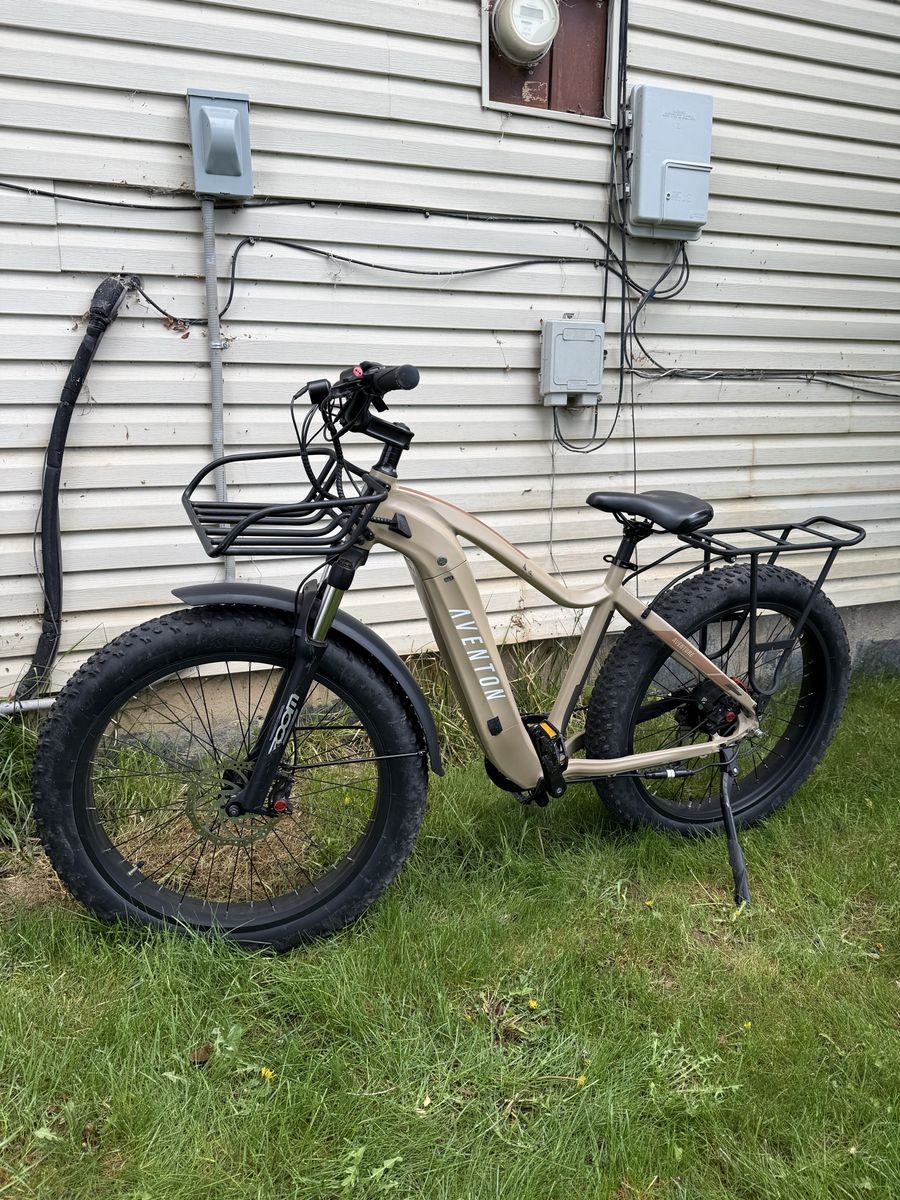 VenmoThis here is my Aventon Aventure 2 E-Bike that I’m looking to sell because it never gets used. It has a top speed of 28mph and a range up to 60 miles. It has 4 inch fat tires and its throttle and pedal assist. It’s in good condition with only 160 miles. Has 5 different powers and nice reliable components. The light is nice and bright and it features 2 racks. The battery is removable with the key, it shifts perfectly, and has no issues. Comes with the charger! Let me know if you have any other questions, price is $1,200 OBO. Thanks!