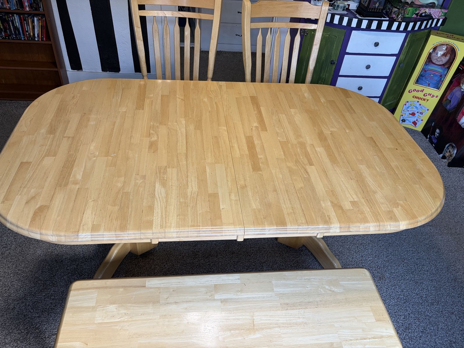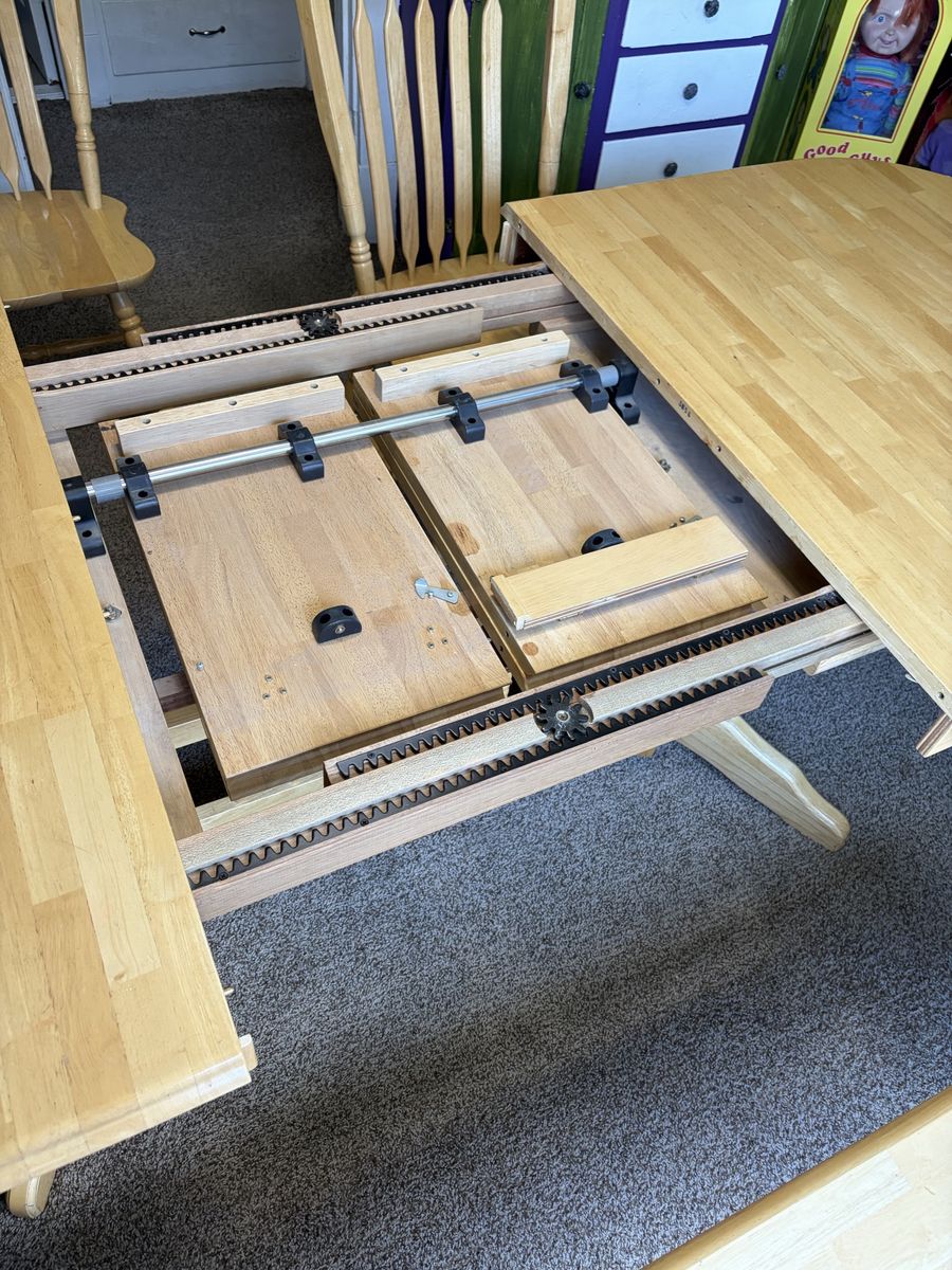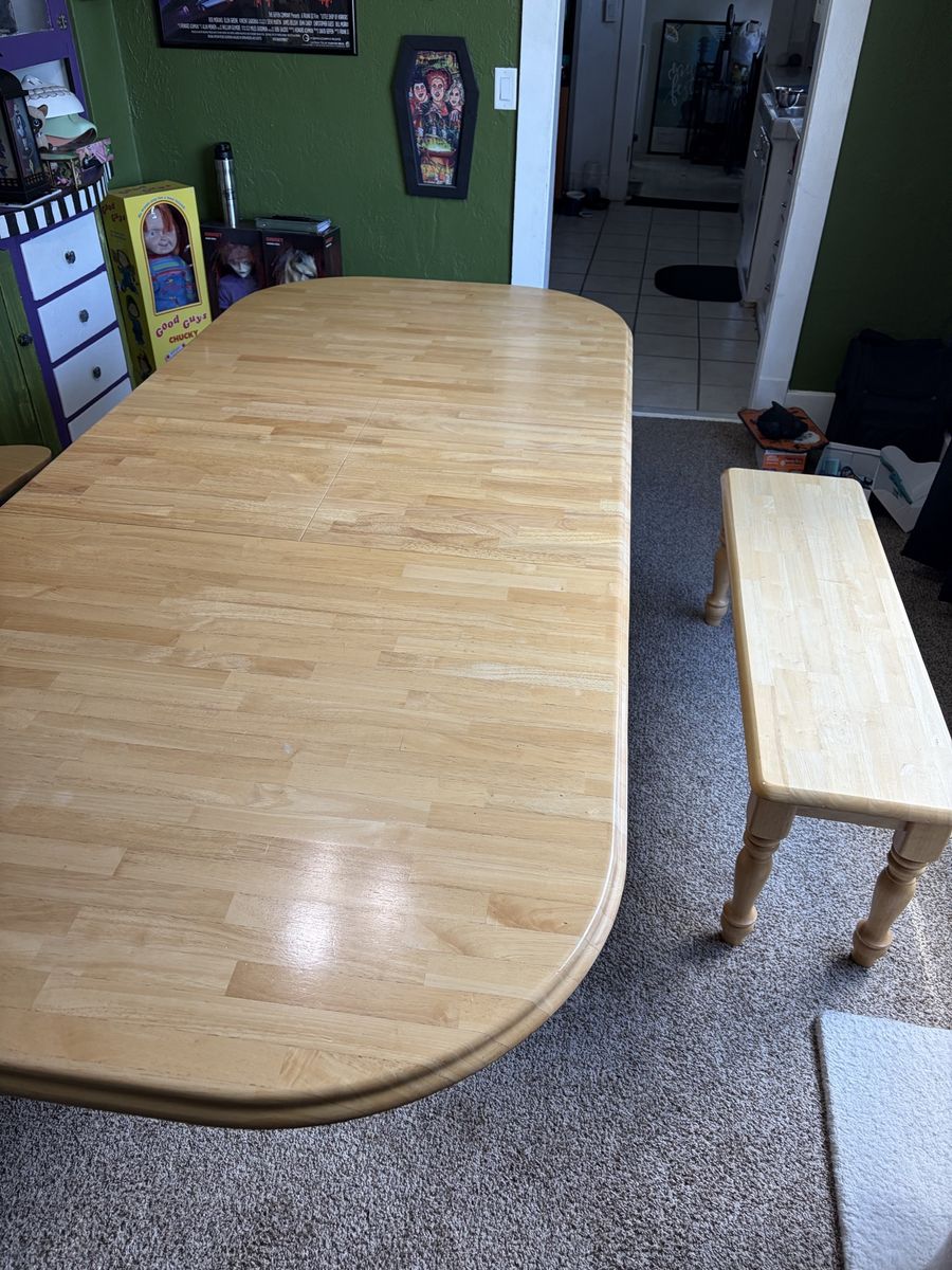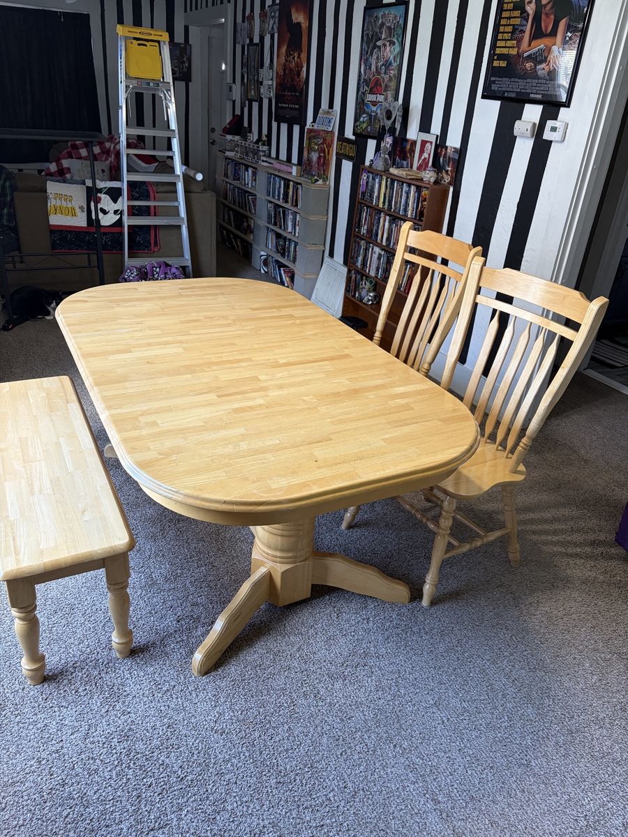 Venmo6 person table with built in leaf to convert to 8 person table. Matching two chairs and bench. Must pick up.