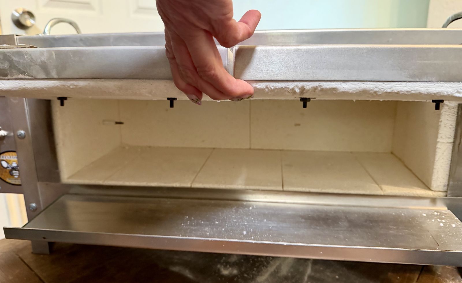 Interior size: 6 1/2" deep x 18" wide x 4" tall. Exterior size including controller: 14" deep x 26" wide x 12" tall. Two 4" tall x 10" wide doors. 4" deep x 20" wide mandrel rest with 1/4" mandrel gap at the bottom. Max Temp: 1500 F. 120 volts 14 amps, Plugs into a standard household outlet. Has a programmable digital Fuji controller with preset cylcles for both COE 104 and Borosilicate glass annealing.