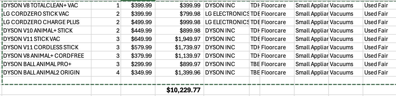 Check the last picture to see what you’re getting—there’s actually more here than what the manifest even claims. It’s mostly Dyson Ball uprights, Dyson stick vacuums, and a couple LG CordZero units sprinkled in for flavor.