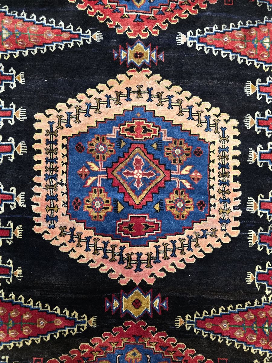 ZelleStunning rug made in Iran. It boasts a rich palette of deep reds, blues, purples, and greens. I especially love the stepped framing around the medallions. This one can fit both contemporary and classic interiors, especially those that mix bold or earthy tones. Perfect for living rooms, dining rooms, or even entryways. Whether you're working with eclectic rooms or a more cozy, rustic space, this rug will elevate the space.