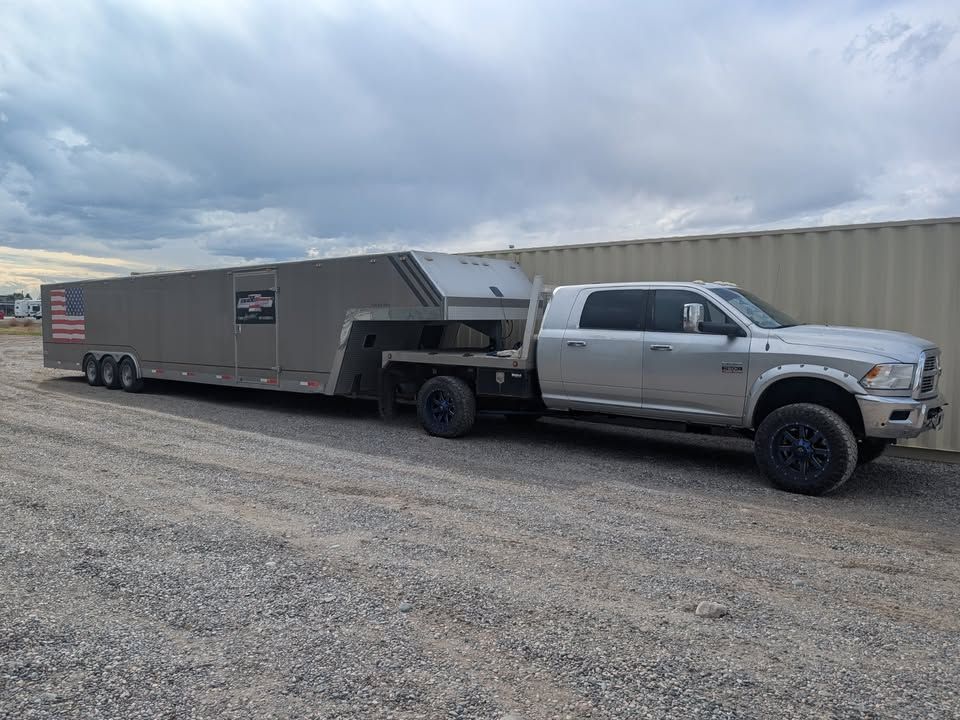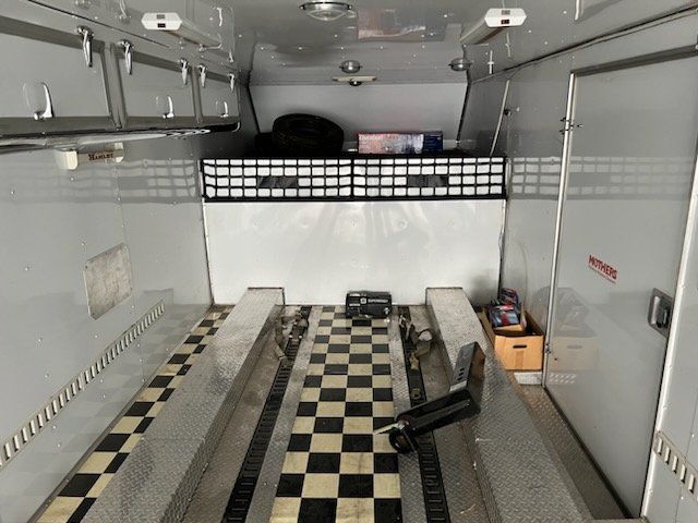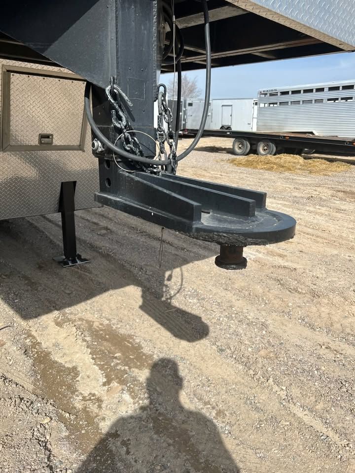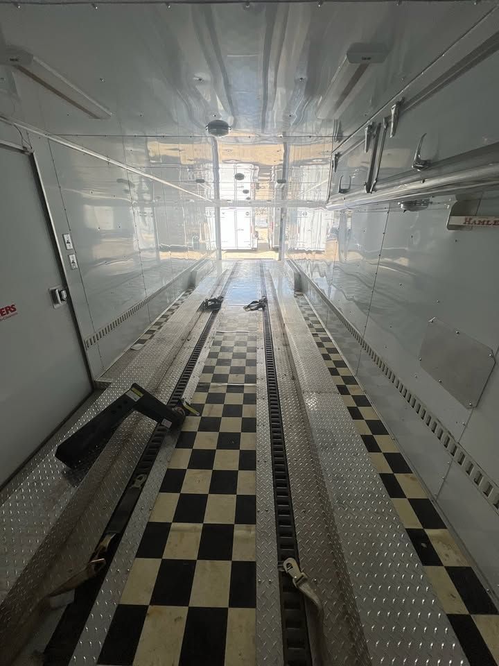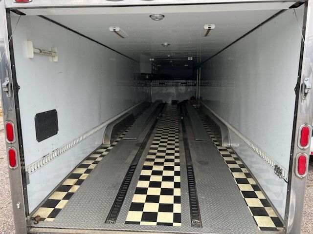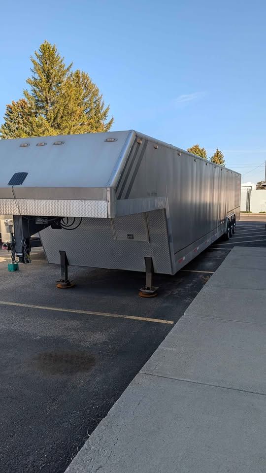 Spacious 43 foot enclosed gooseneck trailer, has triple axles and is equipped with Michelin LT225/75R16 tires. Exterior is silver aluminum with diamond plate stone guard on the front. Rear features a ramp door with heavy duty locking. Front has hydraulic jacks and solar charger to maintain batteries. Winch to help load vehicles in and out. Has 3 different hitch attachments.