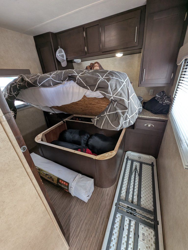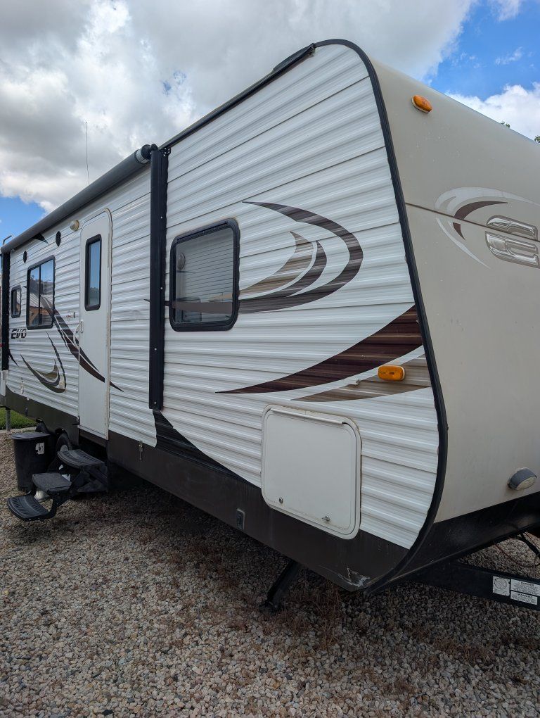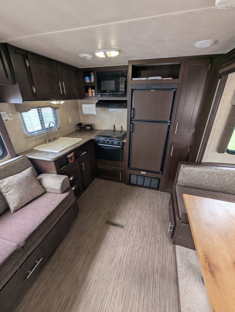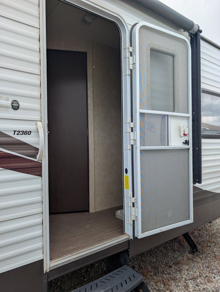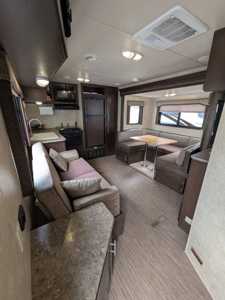 Capacity: sleeps up to 6 people. Roughly 27 ft long. It also has the arctic package that closes in and insulates the bottom from the cold conditions. Weight: Dry weightaround 5,300 lbs, with a gross weight (GVWR) around 7,500–7,900 lbs. Construction: 8-inch powder-coated I-beam chassis, E-Z Lube axles, and electric self-adjusting brakes. Exterior: Aerodynamic aluminum front cap, front pass-through storage with LED light, power awning, and black frame safety glass windows. Interior/Kitchen: Rear kitchen layout, large U-shaped dinette, pantry, 3-burner range with oven, 6 cu. ft. double-door refrigerator (or larger, depending on options), and microwave. the A/C has an aftermarket "soft start" kit on it for ease of use with generators and letting a little smaller generator start and run the A/C. This is equipped with electric power stabilizer jacks, power slide out, and power awning. It also has a remote with a control feature on the trailer to pull right up to camp, sit your chair out, and set it all up/open from a remote! I did buy this with a branded title due to an insurance claim from theft in the past. It's been a sweet little trailer with its own private front bedroom for my four-person family. tons of storage under the dinette chairs in the full height, pantry and sink cupboards, plus under the queen size bed. text with any questions.