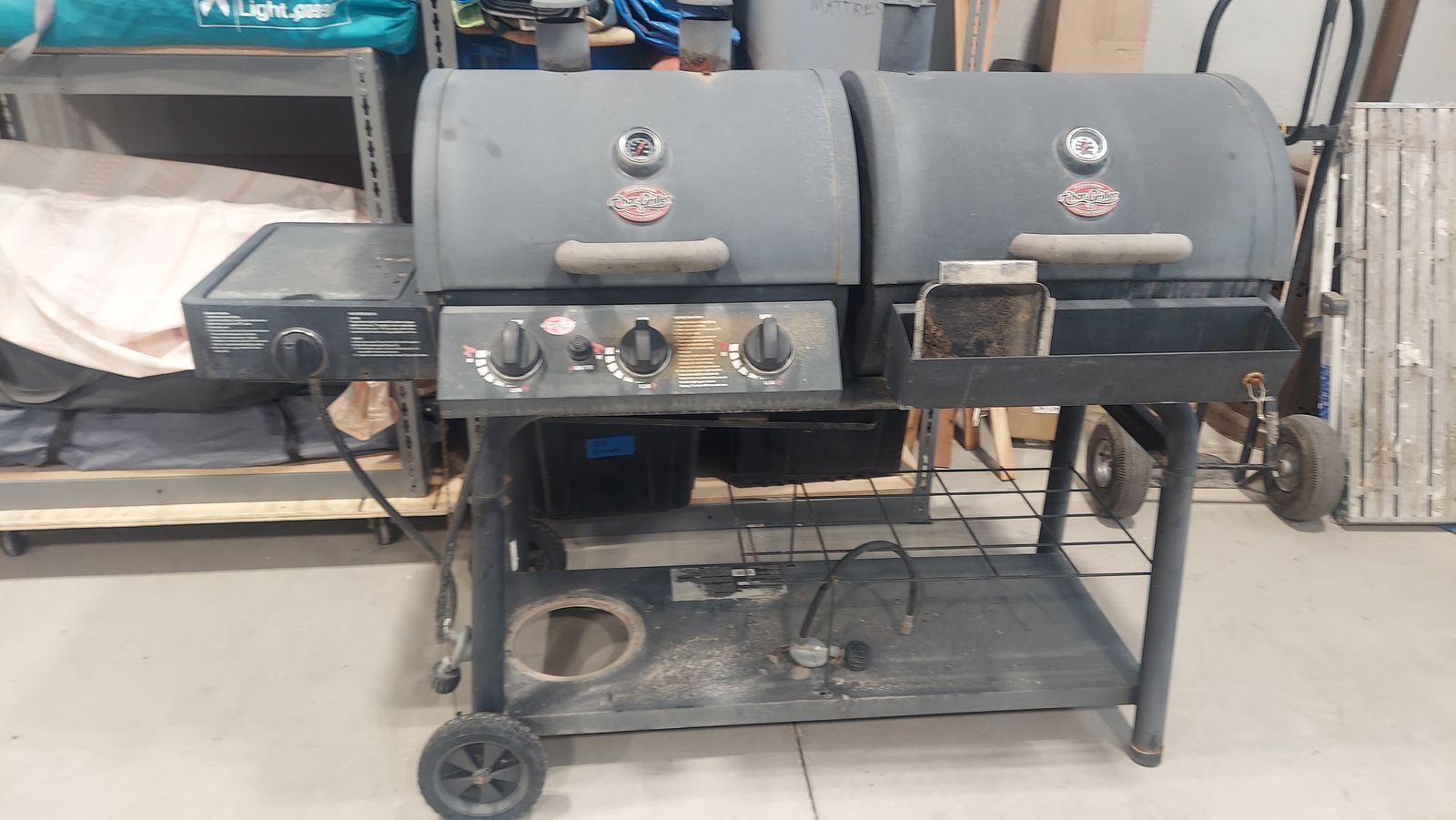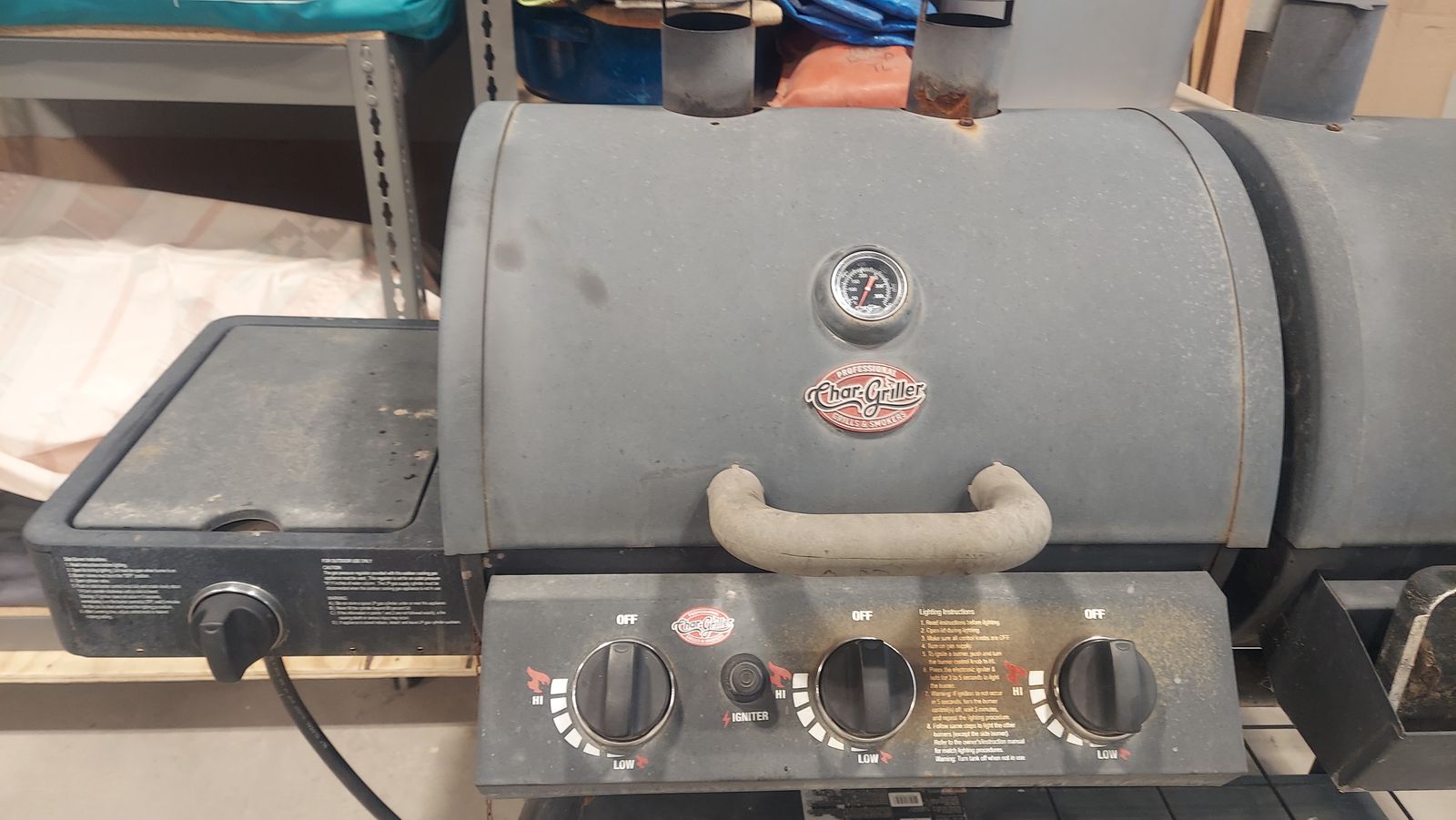 ZelleChar Griller "Double Play" gas and charcoal grill with 1,260 sq.in. of cooking space. Additional side burner to simultaneously cook side dishes. Works fine, but hasn't been used in years and is in need of cleaning. Retails for $569.00 at Home Depot: https://www.homedepot.com/pep/Char-Griller-Double-Play-1-260-sq-in-3-Burner-Gas-and-Charcoal-Grill-in-Black-5650/206282457?source=shoppingads&locale=en-US&fp=ggl&pla=&mtc=SHOPPING-BF-CDP-GGL-D28I-028_022_GRILLS-NA-MULTI-NA-PMAX-NA-NA-NA-NA-NBR-NA-NA-NA-PMAX_SHP_JControl24_PMAX&cm_mmc=SHOPPING-BF-CDP-GGL-D28I-028_022_GRILLS-NA-MULTI-NA-PMAX-NA-NA-NA-NA-NBR-NA-NA-NA-PMAX_SHP_JControl24_PMAX-20455392646--&gclsrc=aw.ds&gad_source=1&gad_campaignid=20369730181&gclid=EAIaIQobChMI46iIrsmRlAMVFA9ECB2NJy9HEAQYASACEgLSiPD_BwE