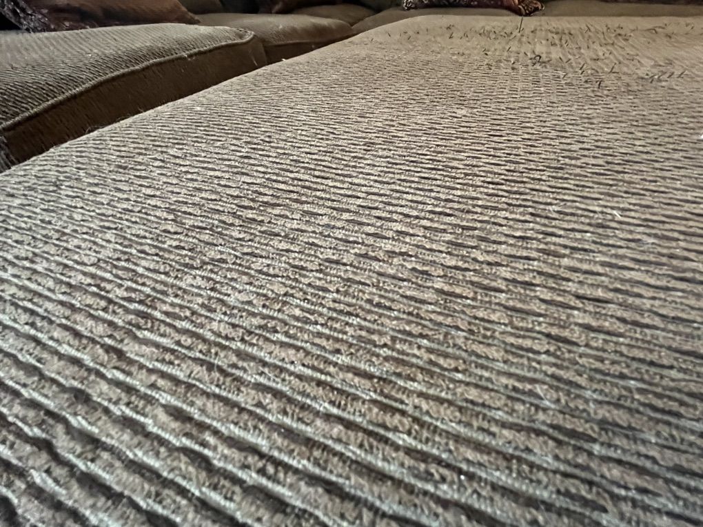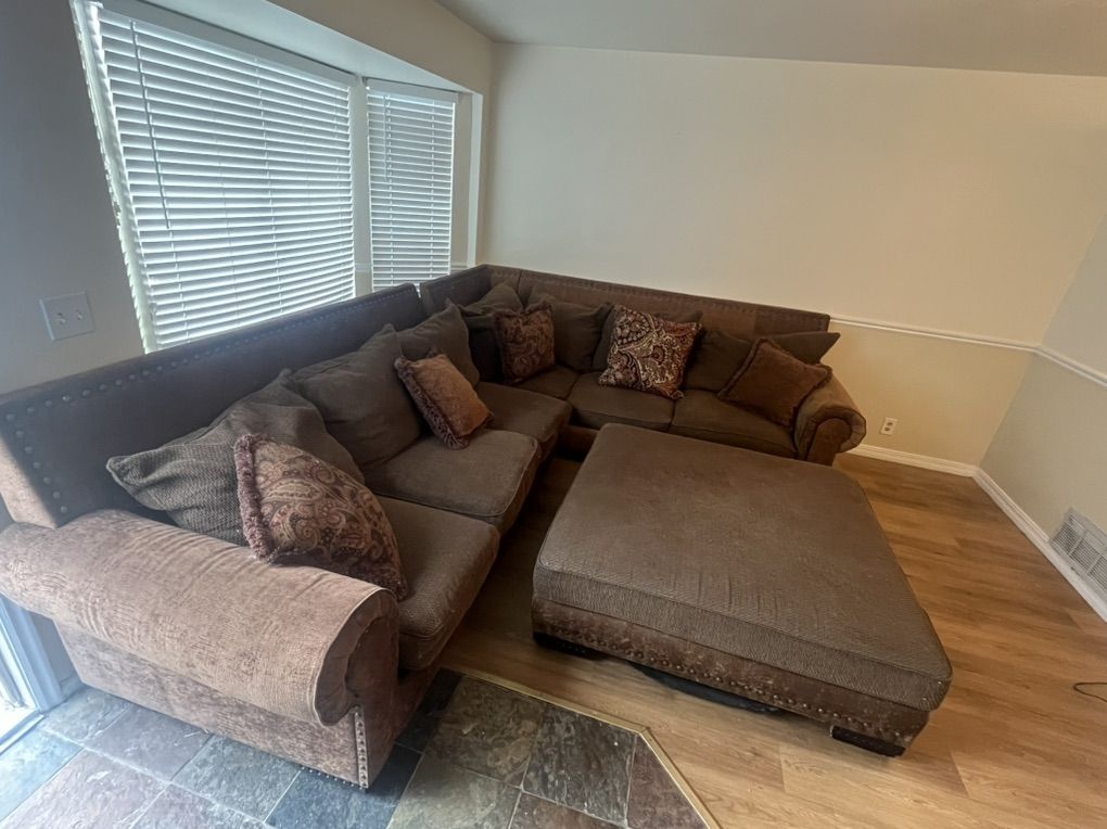 Great condition sectional and ottoman has tons of pillows no tears or stains we need it gone as soon as possible as we are moving and only have a few days to get rid of it. This is why the price is so low message me with any and all questions.