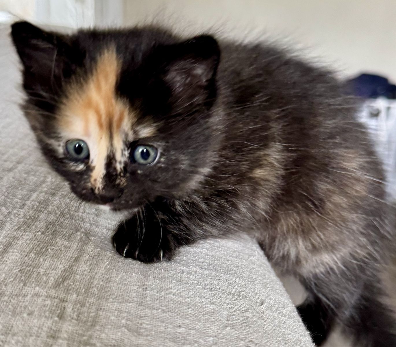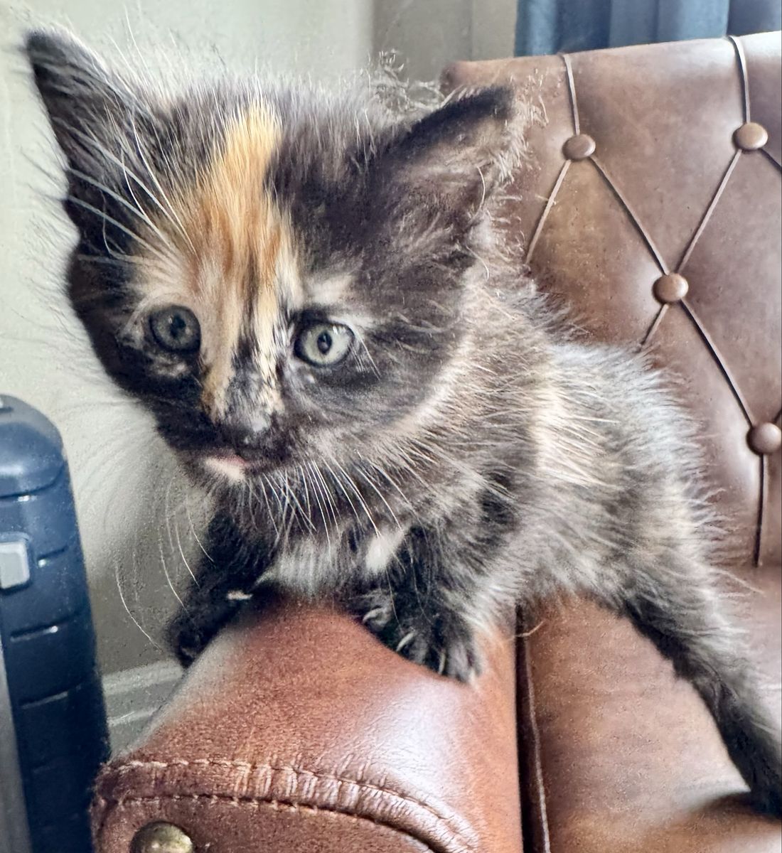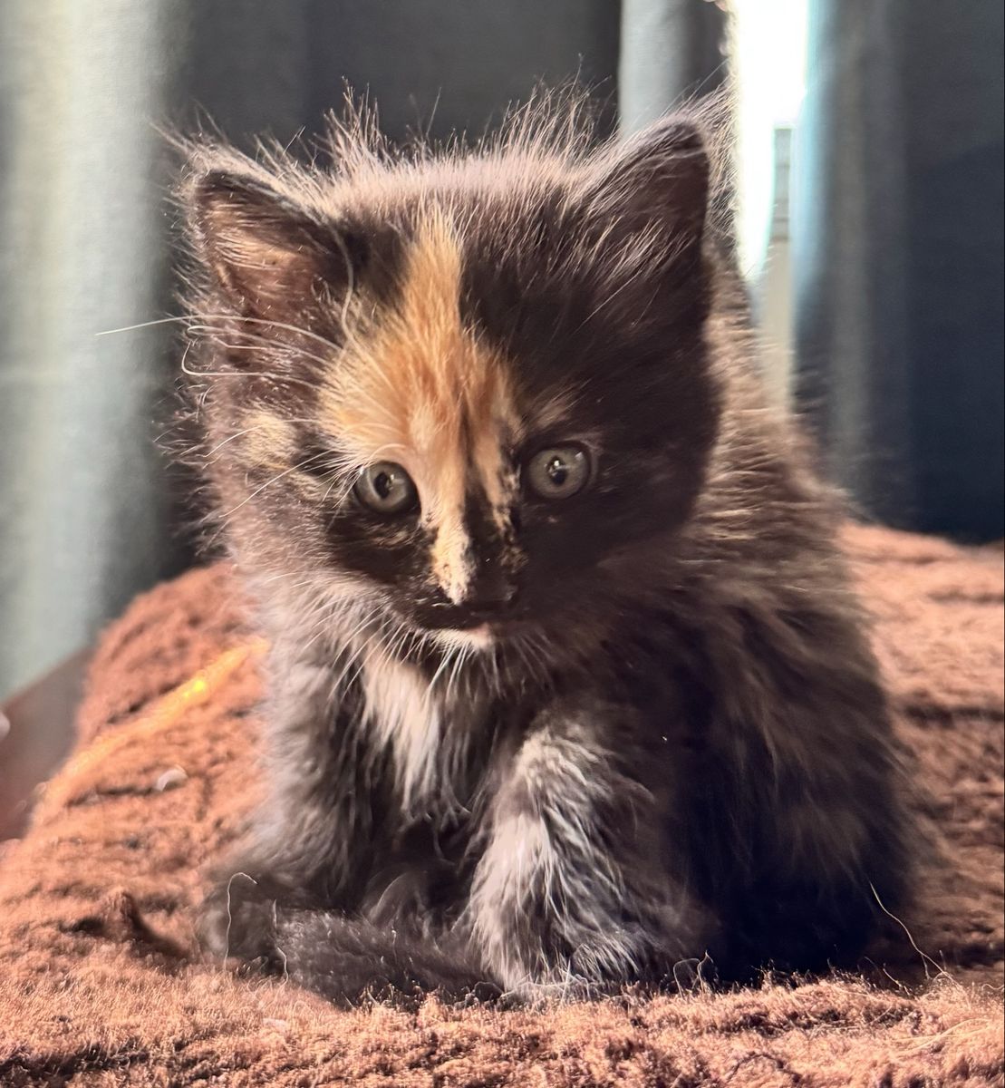 — Phantom (female, dark calico w/ unique orange face) is a little timid at first, but so, so sweet. Very observant. Does mix it up with her siblings, but is also comfortable sitting back and watching the chaos unfold from the background.