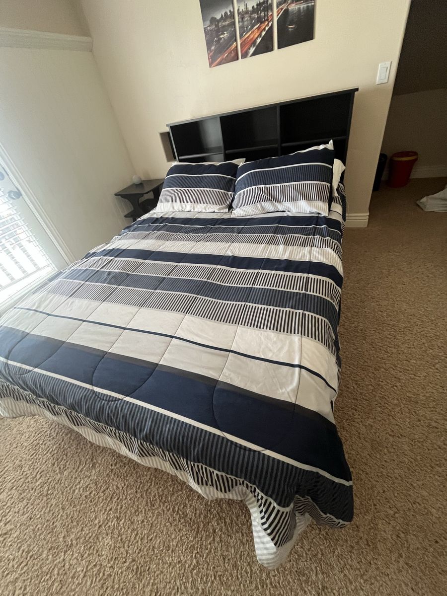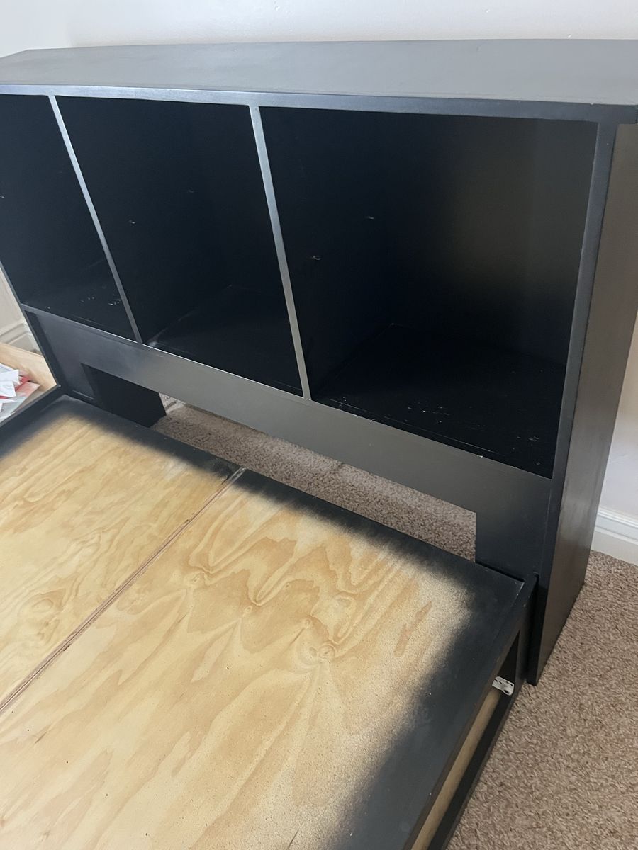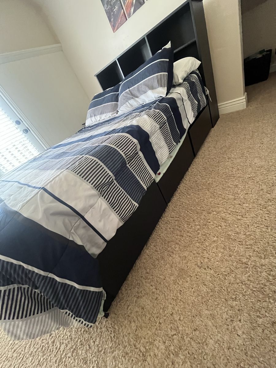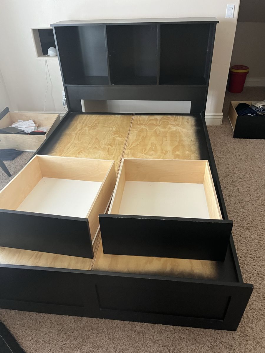 Full Mattress custom built black full-size bed with six drawers, excellent shape it's 54 1/2 inches wide and 76 1/2 inches long with or without the headboard, with the headboard it's an additional foot. The headboard has three large storage containers and also three shelves if you want to split it in half comes with a full-size mattress Mattress Check pictures for Details. The drawers are 21" x 23"
