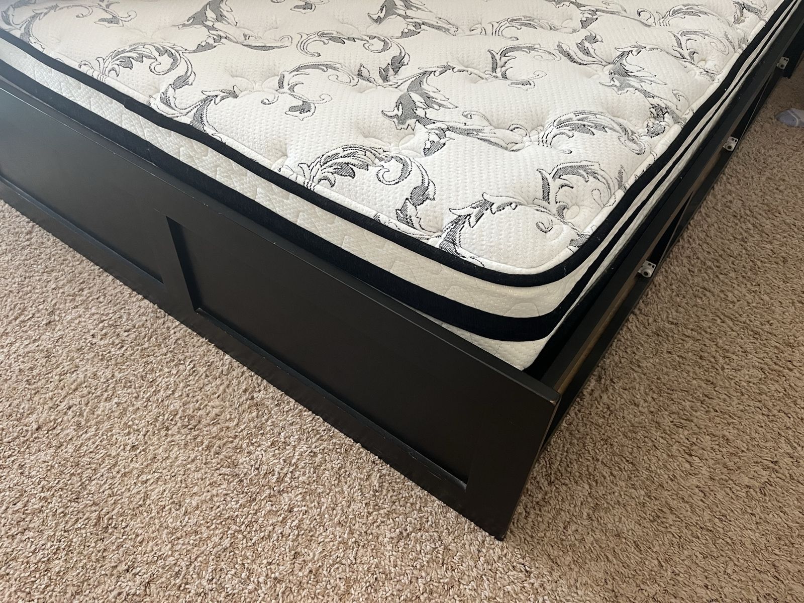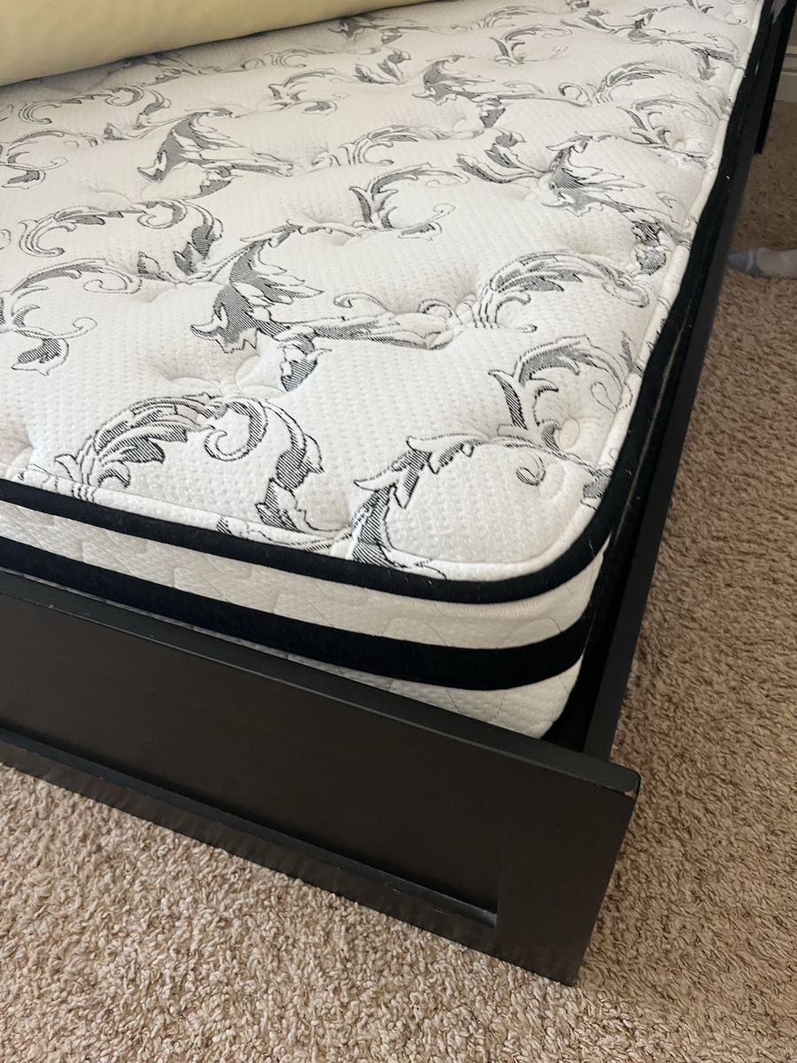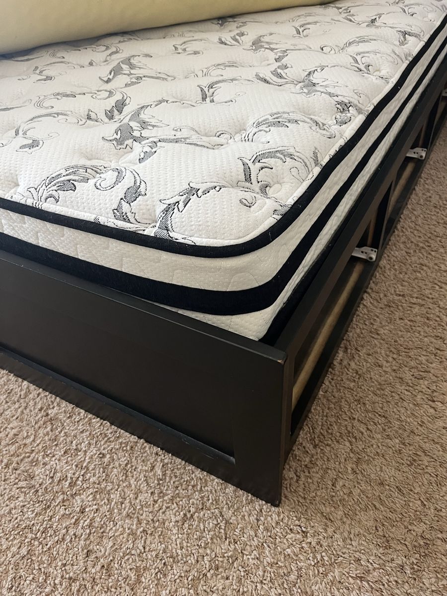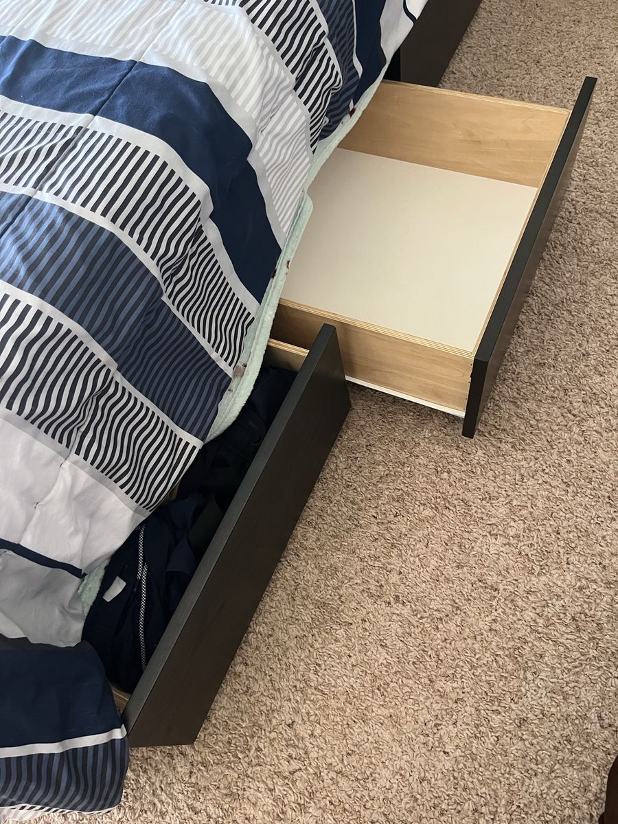 Full Mattress custom built black full-size bed with six drawers, excellent shape it's 54 1/2 inches wide and 76 1/2 inches long with or without the headboard, with the headboard it's an additional foot. The headboard has three large storage containers and also three shelves if you want to split it in half comes with a full-size mattress Mattress Check pictures for Details. The drawers are 21" x 23"