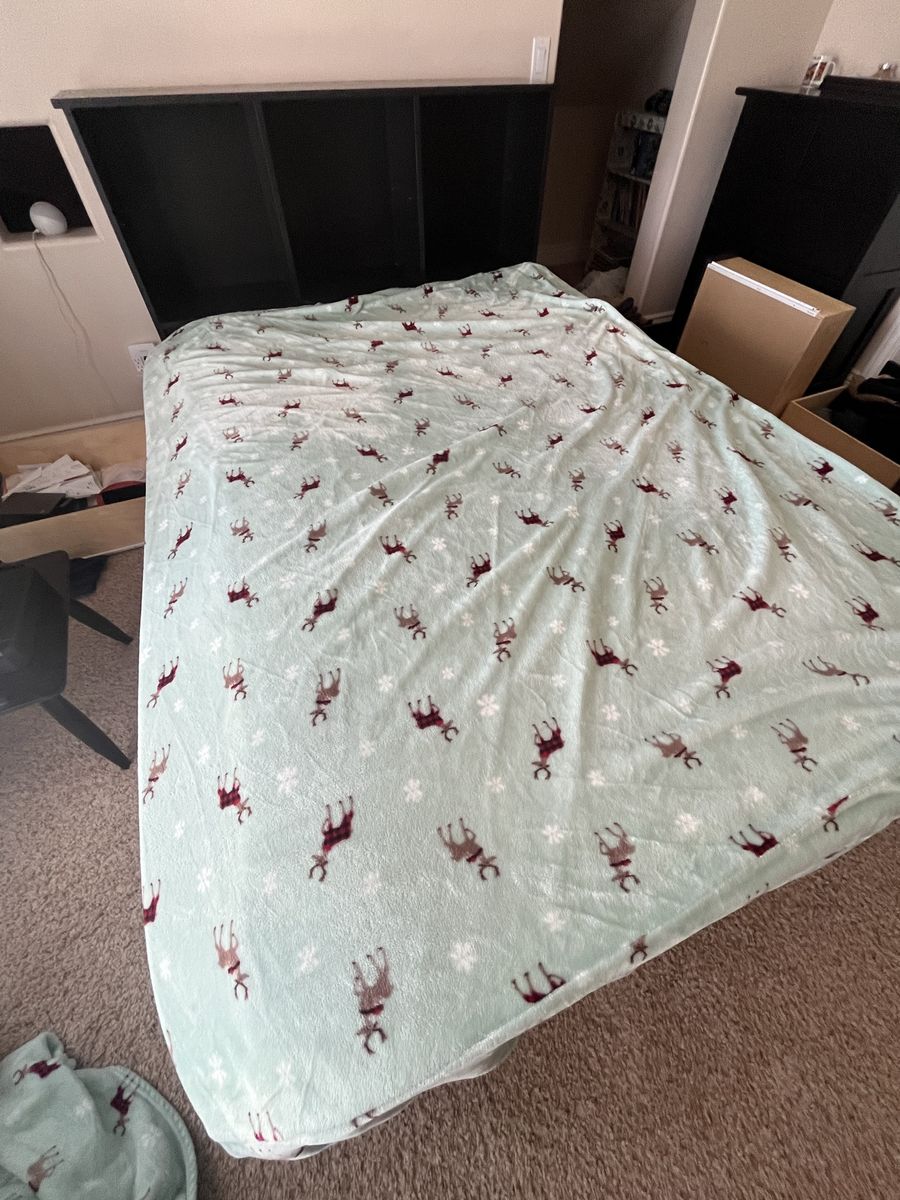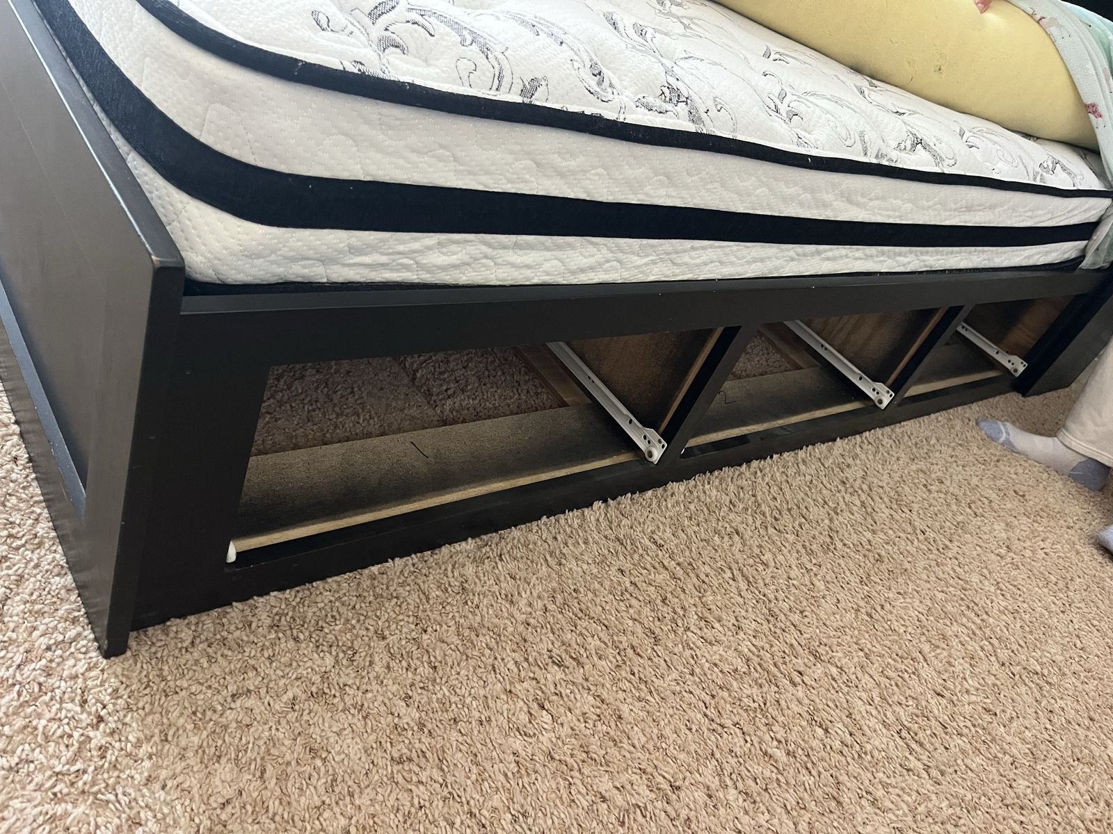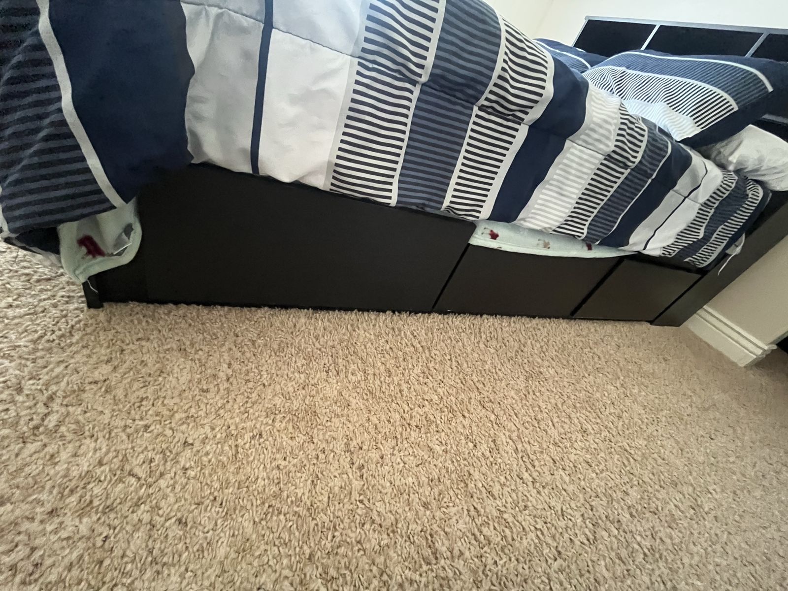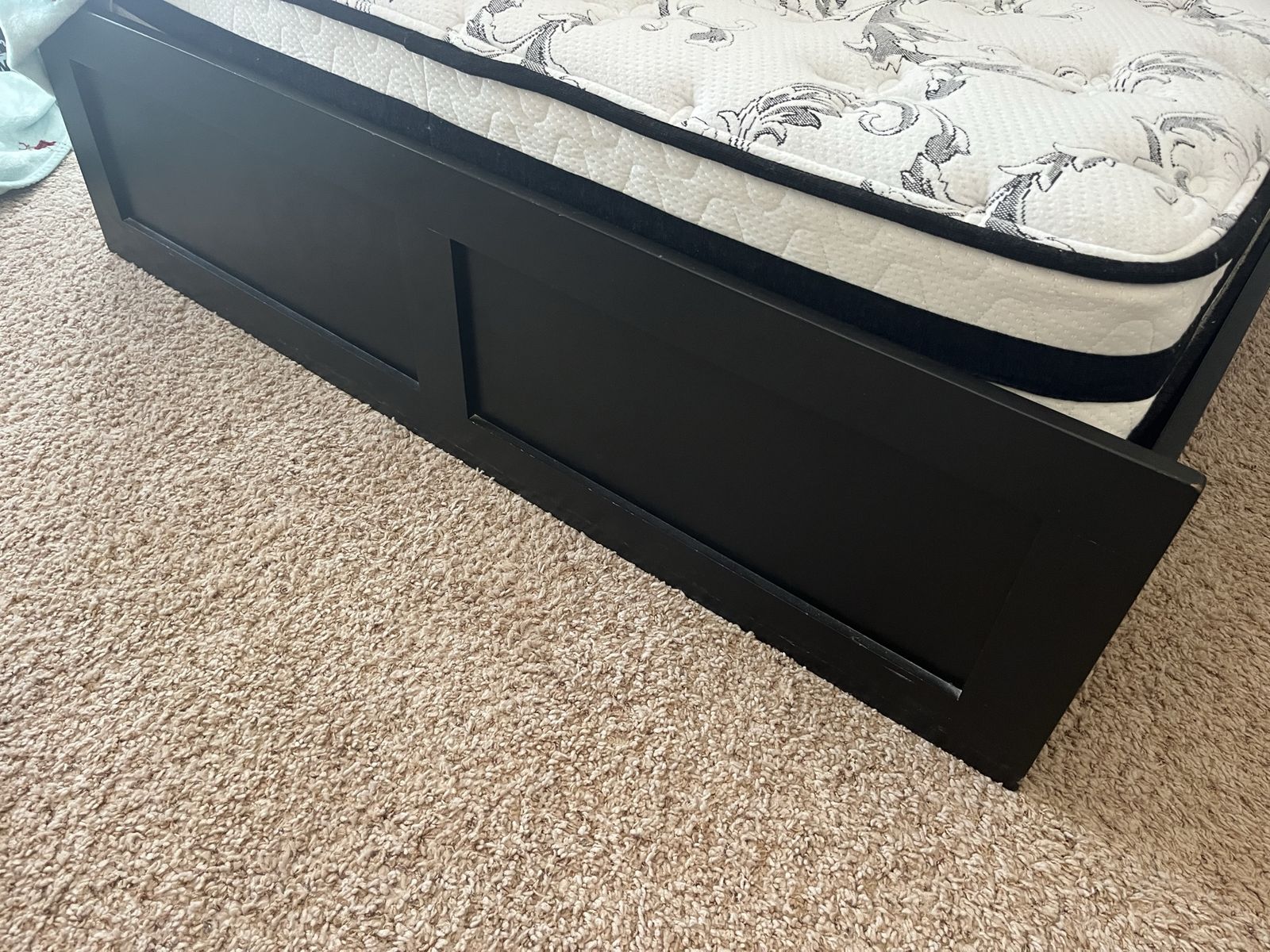 Full Mattress custom built black full-size bed with six drawers, excellent shape it's 54 1/2 inches wide and 76 1/2 inches long with or without the headboard, with the headboard it's an additional foot. The headboard has three large storage containers and also three shelves if you want to split it in half comes with a full-size mattress Mattress Check pictures for Details. The drawers are 21" x 23"