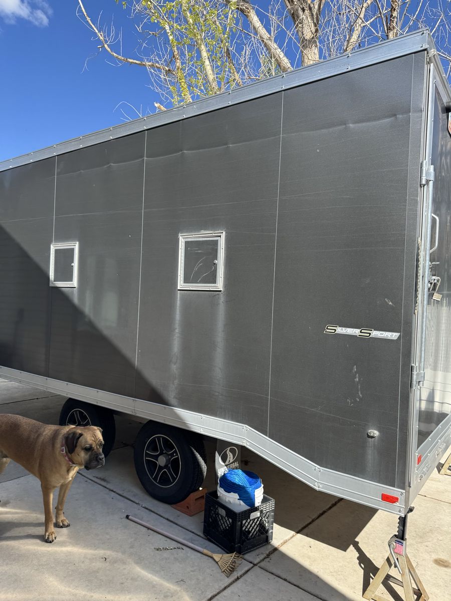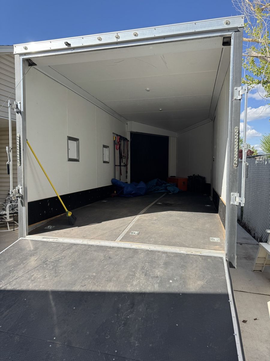 All aluminum V-nose enclosed trailer has 2 ramp doors and a man door
