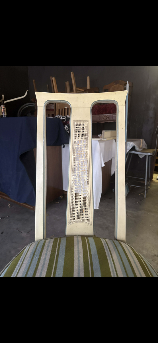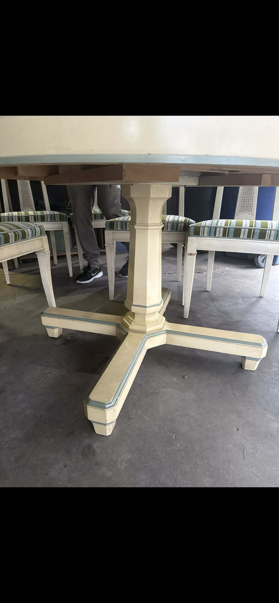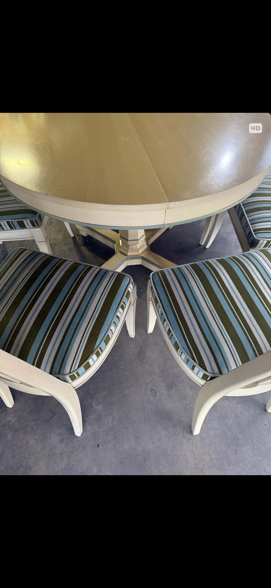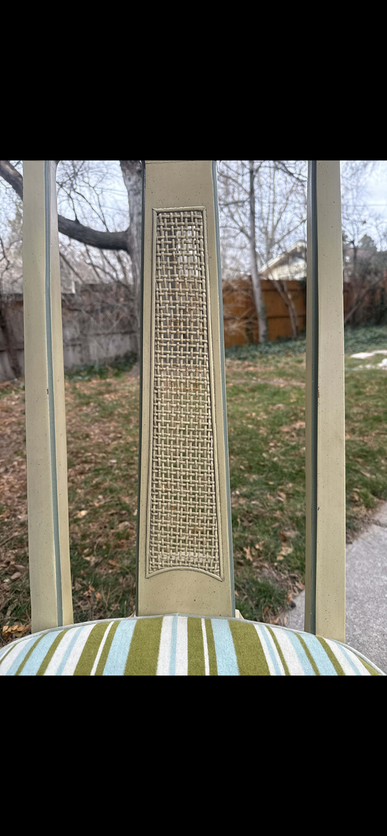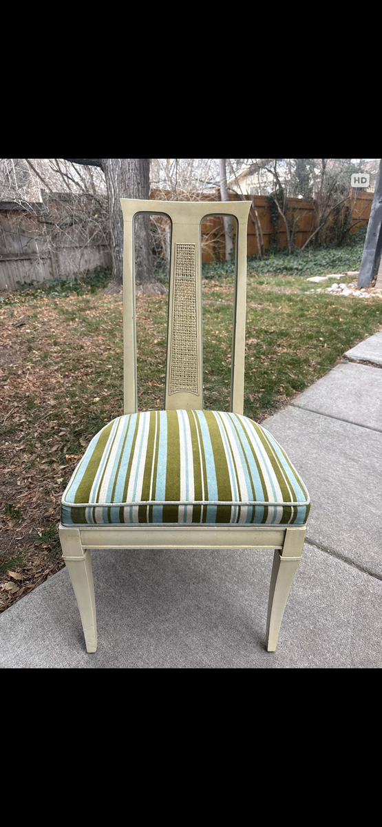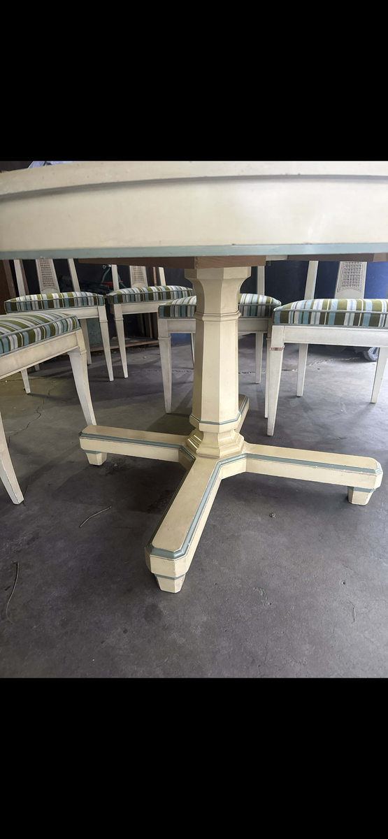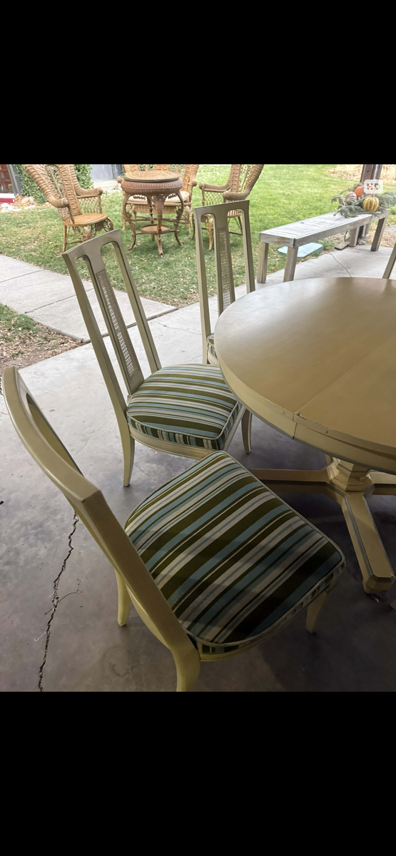 PayPalAuthentic Drexel Triune Collection dining set, factory dated June 1960. Classic round pedestal table with leaf, paired with six matching chairs featuring woven back splats and original striped upholstery.