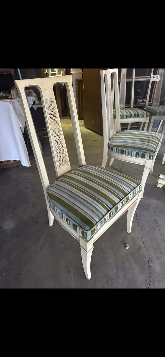 Painted white finish with subtle blue-green accents. Structurally solid with clean upholstery and light, age-appropriate wear consistent with a 1960 vintage set.