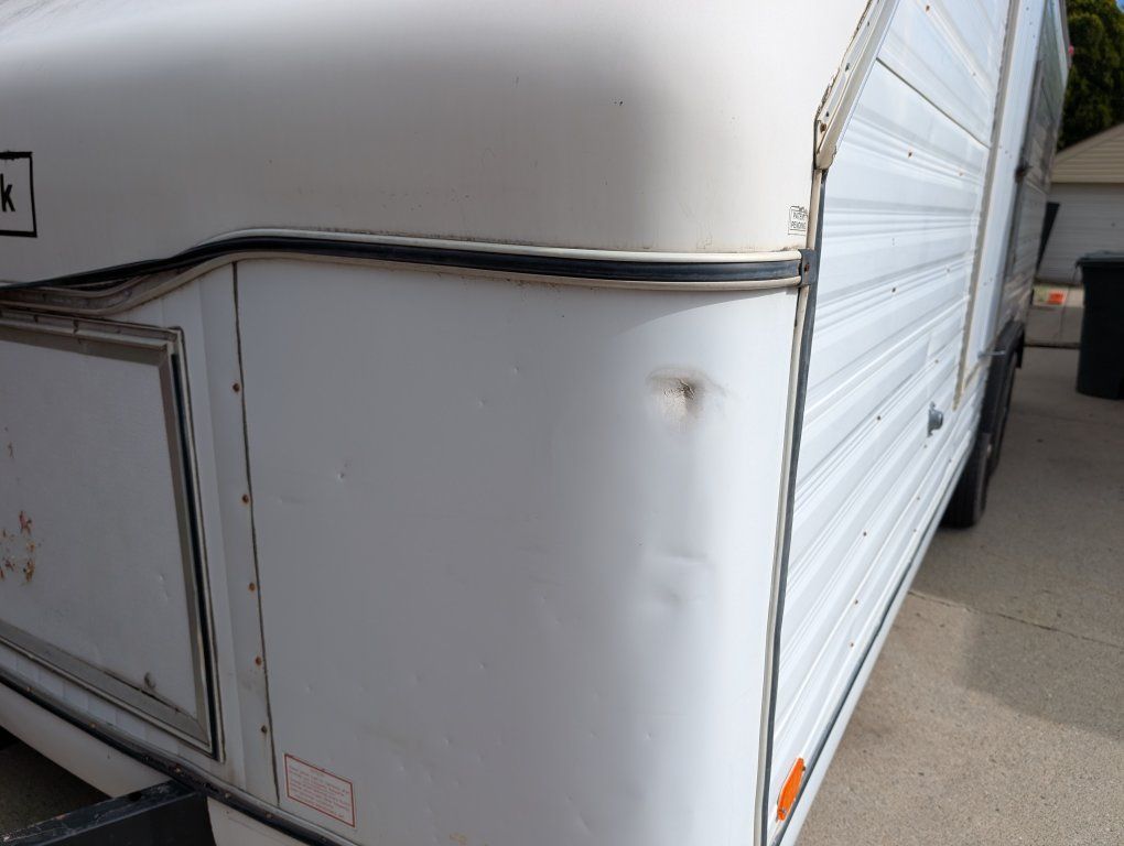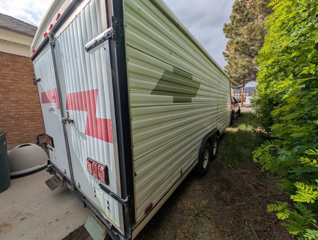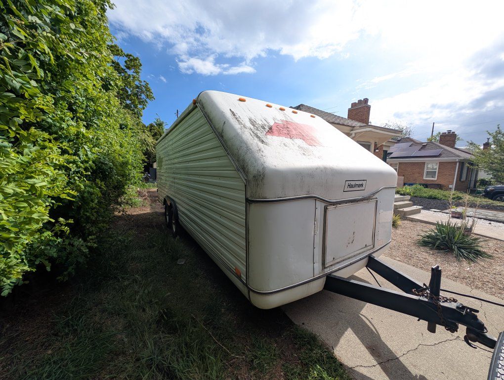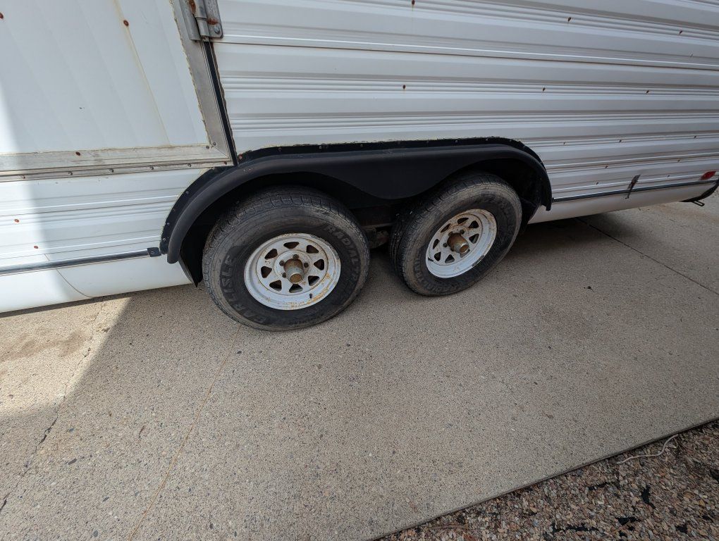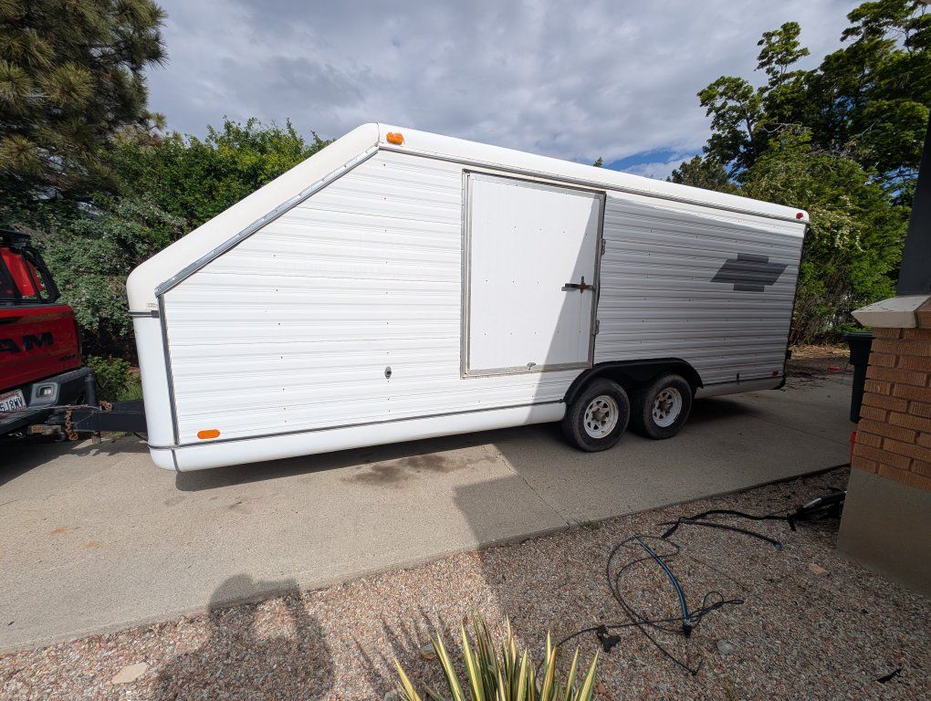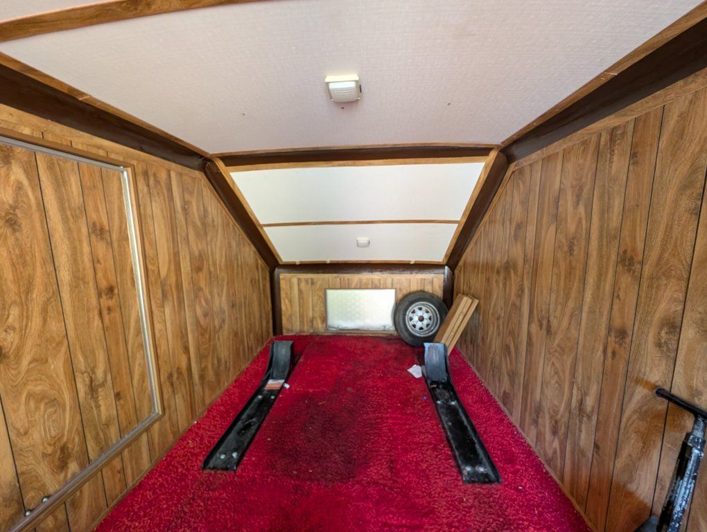 90 inches wide, 77 inches between the wheel wells. 20 foot long. It used to haul a Chevy Bel Air. I had a 240sx I parked in here. Has ramps for easy loading. Mostly has just sat in my driveway. I updated all lights to LEDs and rewired it. All lights work except for one of the top marker lights and the license plate light. Has trailer brakes.