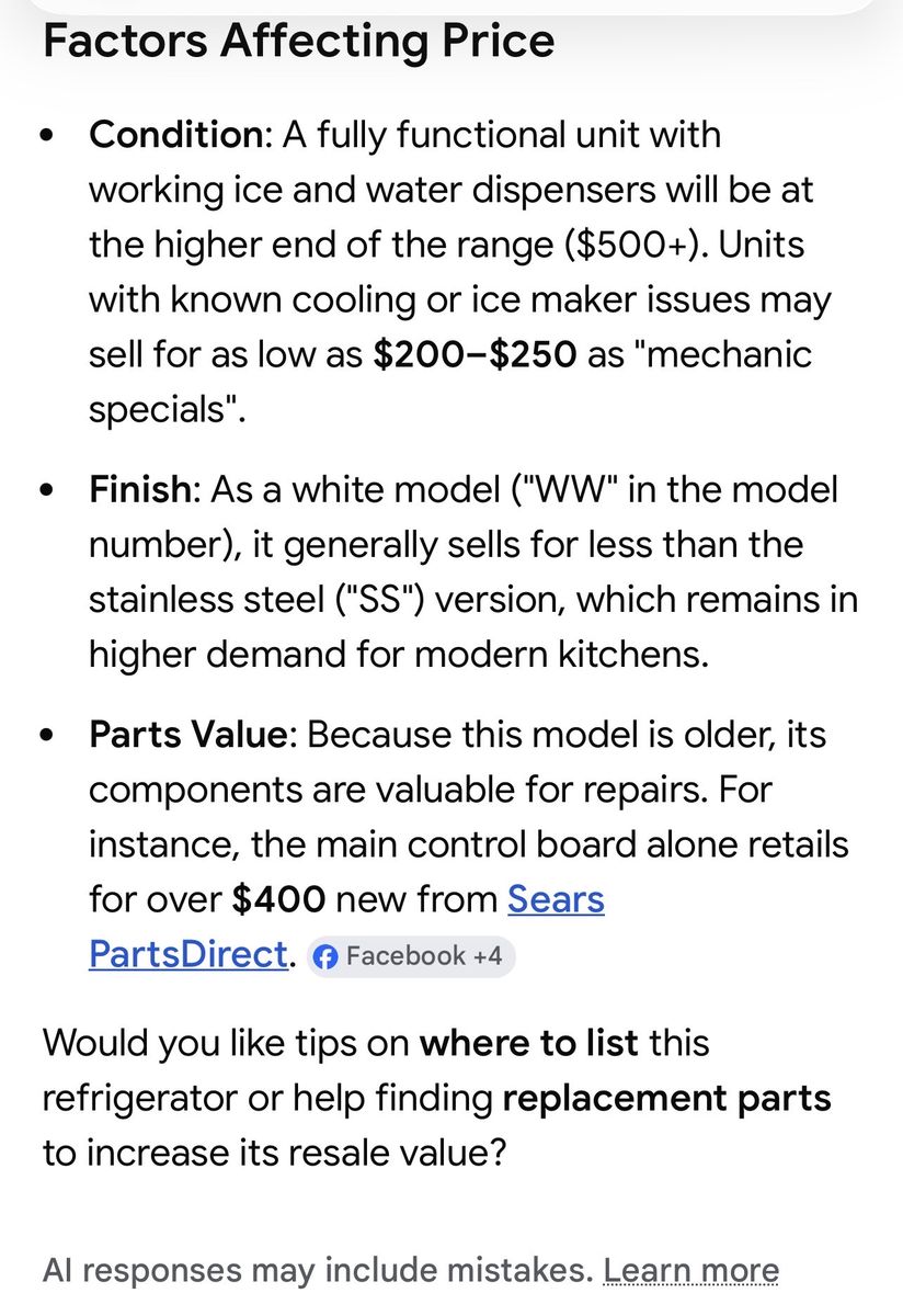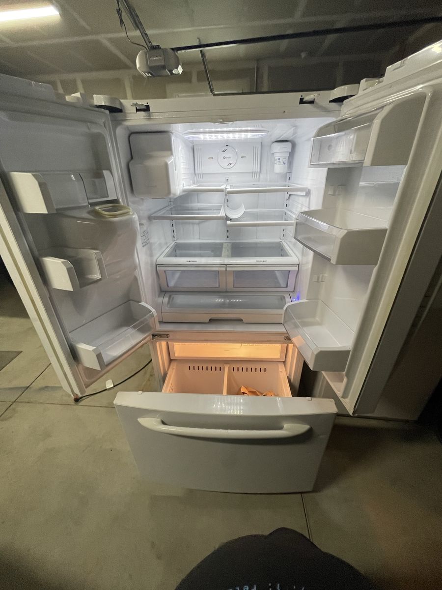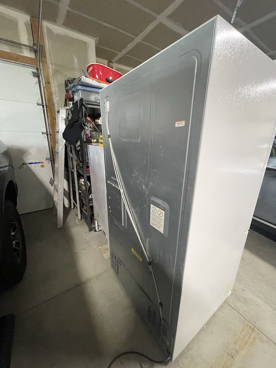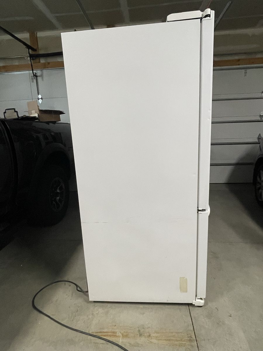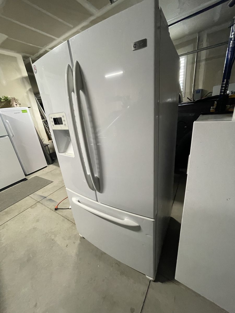 $200 cash. One owner 2008 GE Profile Model PFSF6PKWBWW 25.8 cubic feet with French doors. Refrigerator (17.6) Freezer (8.2). Retailed at Lowe’s for $2,350 in 2008. Ice maker went out in 2012. Water dispenser works. Been using as a spare fridge/freezer for drinks/frozen goods. Clean; one very small dent on freezer door. Fridge temp is 38, freezer works great! (Will be plugged in to observe cooling/ freezing. Have owners manual. I Have ramps and Dolly to help load. Recommended to transport upright. Reason for sale: have 4 freezers & fridges, no longer need.