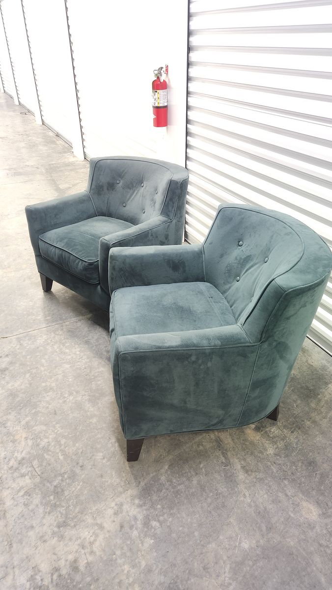 GooglePayTransitional club chair in storage unit. Clean lines, slightly curved/sloped back, low profile. Sits between modern and traditional. Three button tufts on the back, single boxed seat cushion with welt/piping trim, slightly flared track arms, dark wood tapered legs.